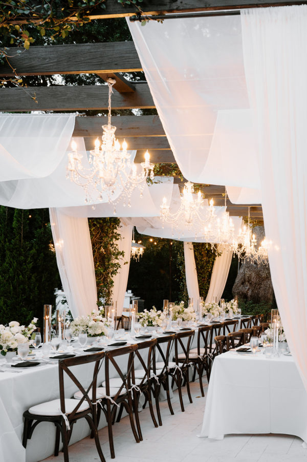 Wanted to have a moment where we could show off the photos Jason and I have taken together during engagement shoots and family photos. There was a beautiful walkway from the cocktail space to the reception space, and I thought it’d be perfect to have large photos of us leading the guests to the reception. La Casa Toscana has amazing chandeliers hanging on the big trees in that walkway area, so it felt like an outdoor gallery. We had a violinist playing in the space as guests walked over, and I really felt like it was so romantic and intimate. To me, it was the perfect way to lead to dinner.