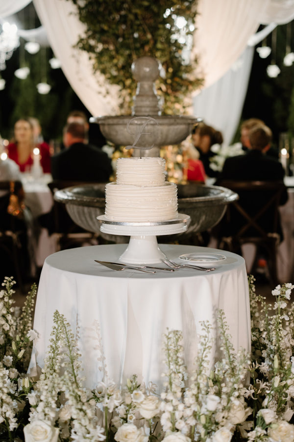 A simple two-tier white cake with a letter “E” (their new last name is Ervin) – classic and modern!