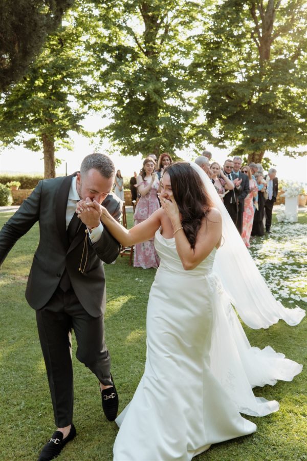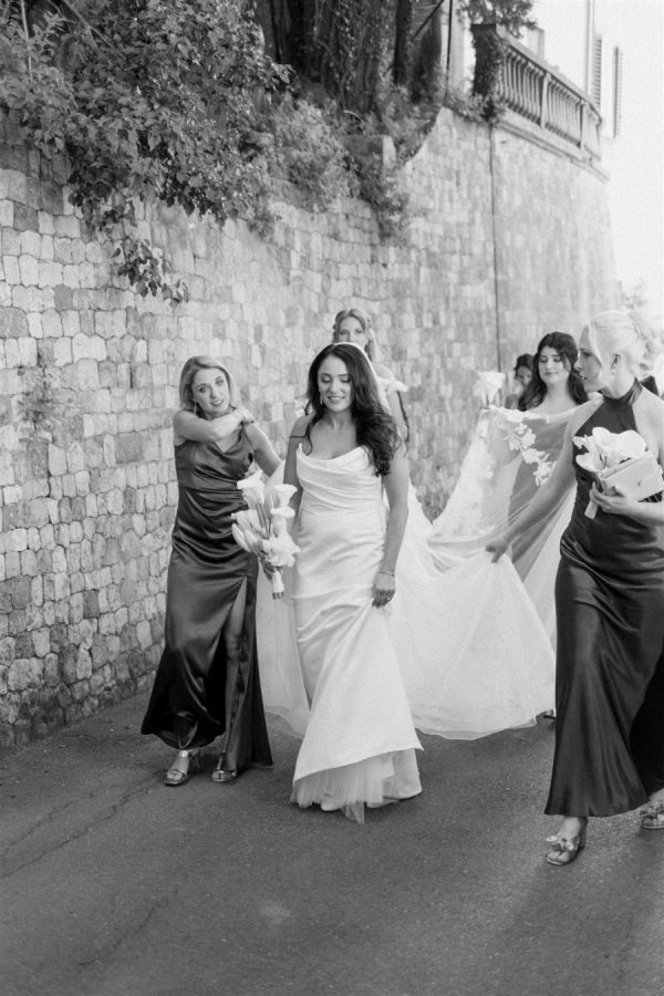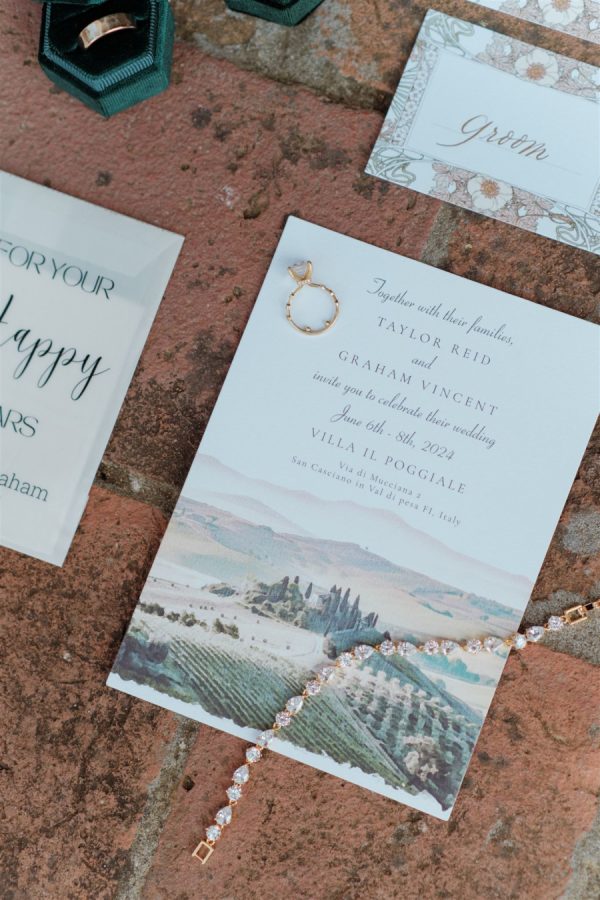 Taylor and Graham’s vision was clear from the very beginning: they dreamed of a timeless and classic wedding that could honor the charm and beauty of Tuscany. Thanks to the impeccable vision and meticulous work of Olivia and her team, Villa Il Poggiale transformed into the ultimate canvas for this celebration—its refined architecture and breathtaking views of the rolling Tuscan countryside seamlessly shaping and elevating the entire aesthetic, creating an unforgettable backdrop that perfectly captured the essence of timeless elegance. The celebration, an intimate gathering of just 50 guests, was carefully curated to evoke a warm, personal atmosphere—where every detail was thoughtfully designed to make each attendee feel truly welcome and cherished. The ceremony unfolded with a runway-inspired seating arrangement, allowing guests to fully immerse themselves in every heartfelt moment. Breaking with tradition, Taylor and Graham chose to have their bridal party seated among the guests, ensuring the spotlight remained solely on the couple. The bridesmaids and groomsmen made their entrances individually, adding a subtle yet impactful touch of modern elegance. The reception carried this effortless sophistication forward: a single long table beneath grand chandeliers, bathed in the soft, flickering glow of candlelight, setting a warm and romantic scene. The intimate and authentic atmosphere was a true reflection of the bride and groom’s style, making every guest feel like an essential part of their love story. After all, isn’t that what every wedding should be?