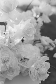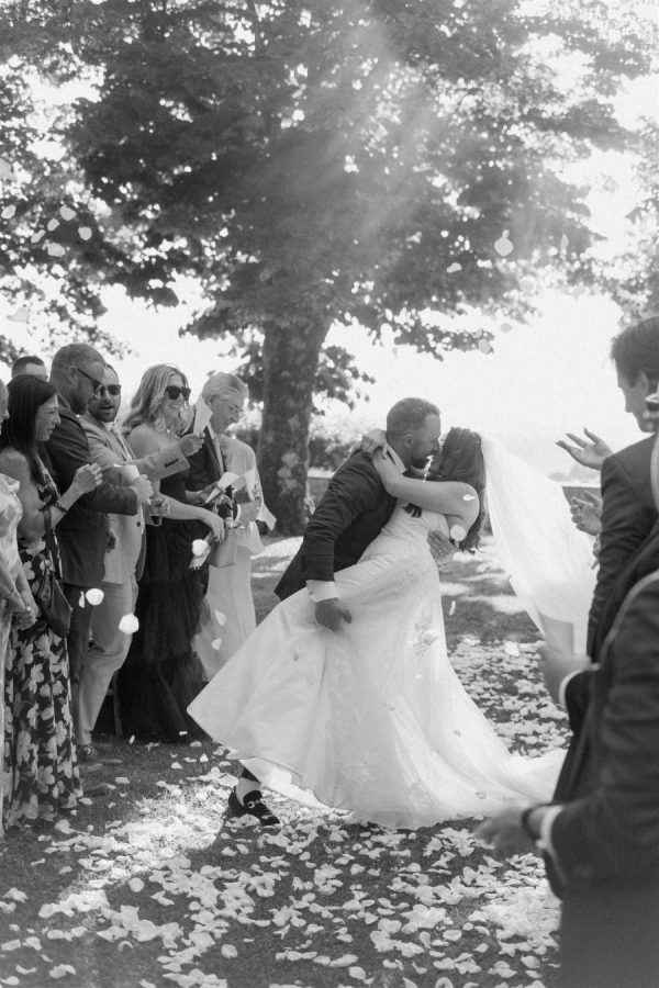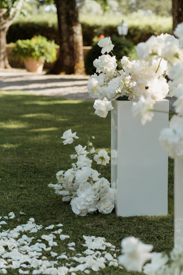 Taylor and Graham chose a minimal yet elegant floral style that felt perfectly in harmony with the Tuscan landscape. The ceremony had a runway-style seating arrangement, so that guests could fully experience every emotional moment. The ceremony embraced a less-is-more allure: two sculptural floral columns standing at the aisle’s end, and a delicate trail of rose petals leading the way, setting a scene of effortless romance. At the reception, the floral palette remained cohesive, embracing subtle, natural tones that blended with the surroundings of the villa. In a nod to sustainability, the ceremony’s floral columns were elegantly repurposed to frame the head table and the newlyweds, weaving a refined sense of continuity from ceremony to dinner. A single long table shimmered beneath sparkling chandeliers, while countless candles cast a warm, intimate glow, beautifully enhancing the floral palette that dressed the scene.