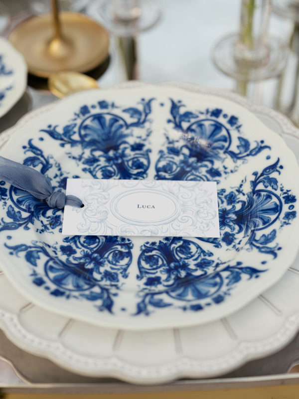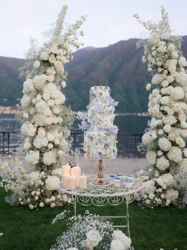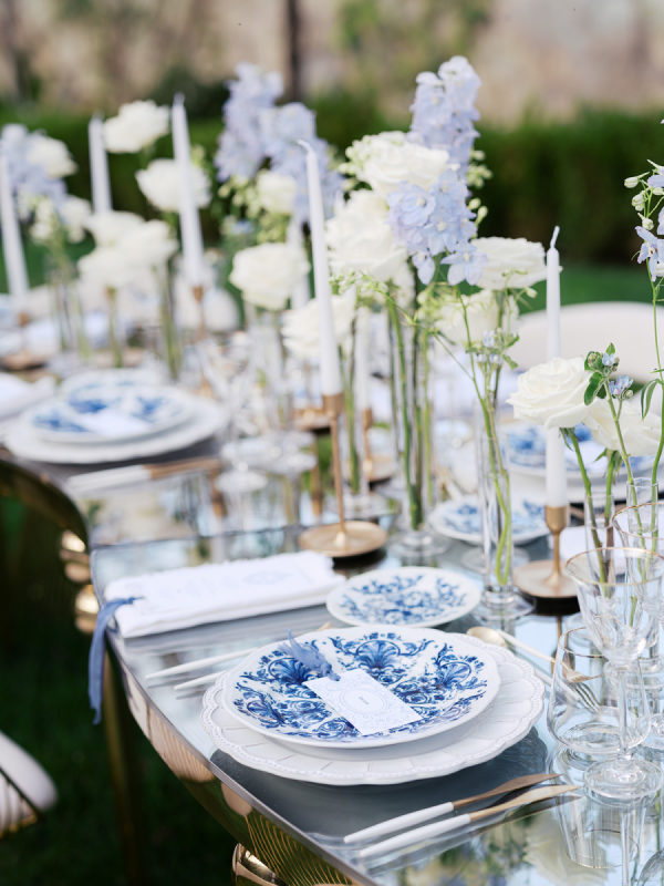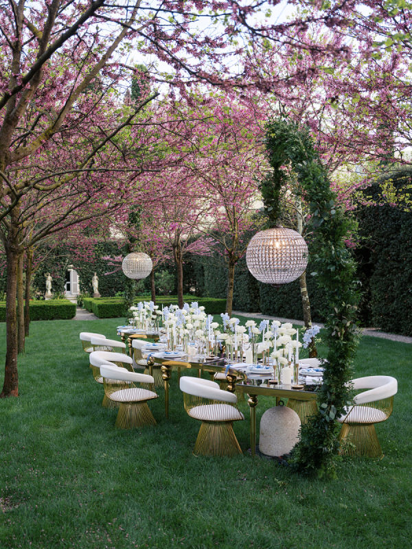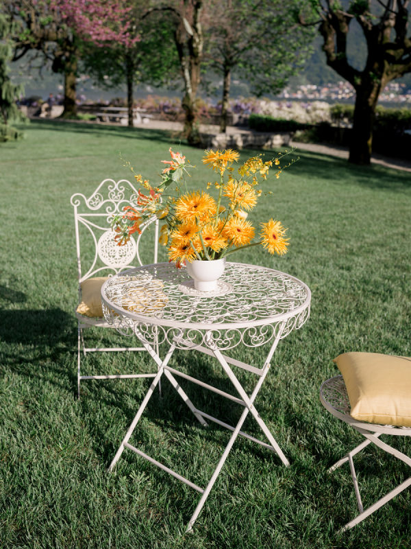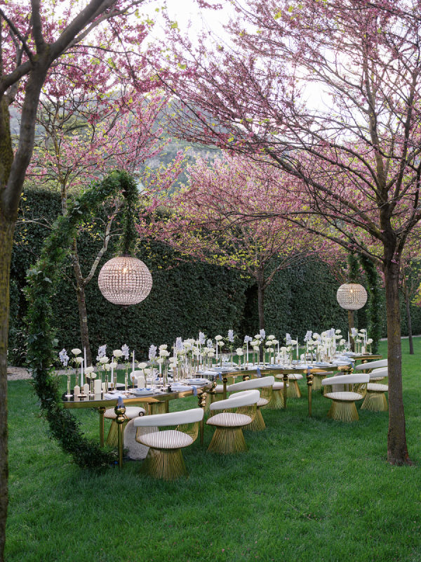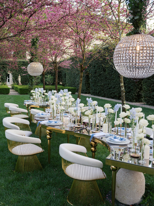 Ceremony: An all-white palette reflected the pure, serene beauty of Lake Como and its skies, and also reflected the beauty of our gorgeous bride. Crisp white flowers created a clean, elegant backdrop – a mirror of the lake’s calm and ethereal charm. Instead of traditional chairs, guests were seated on white, curvaceous, plush couches that mirrored the softness of clouds. We created bulky, flowing shapes for a modern, airy touch. Cocktail hour: Inspired by Italian chic and golden hour hues, the cocktail decor embraced warm yellow and orange tones that evoked the vibrant glow of an Aperol spritz, creating a stylish, sun-kissed Italian flair. Dinner: The palette shifted to royal blue and white, accented with gold in the chairs, table, and cutlery. Blue and white flowers added sophistication, while the flourishing cherry trees framed the long table with playful elegance. Mirrored tabletops and round mirrored chandeliers elevated the setting, reflecting light and adding a sense of luxury and glamour to the regal, clean-cut design. A perfect setting for an unforgettable Italian dinner.