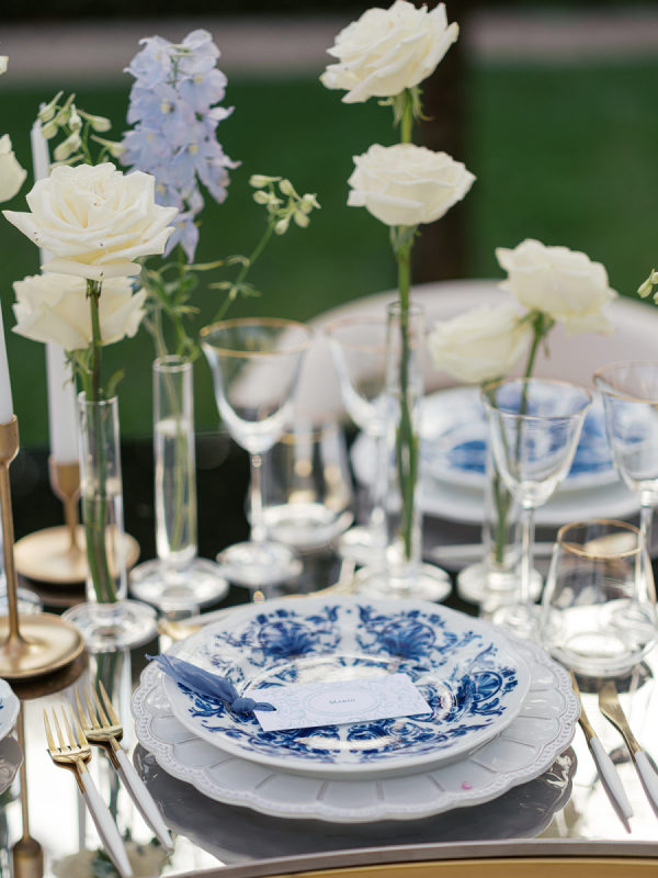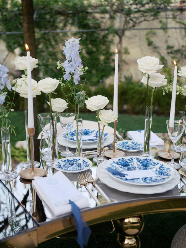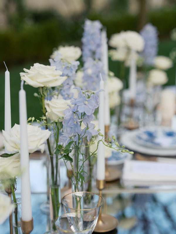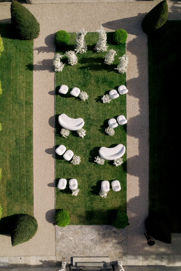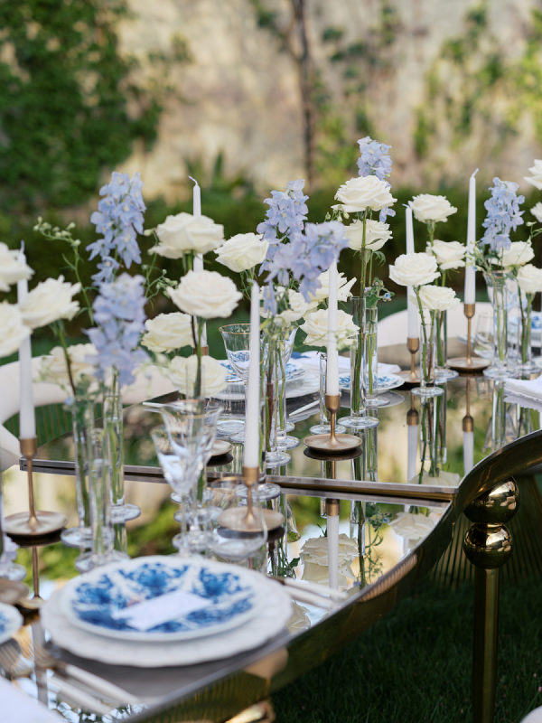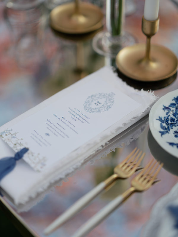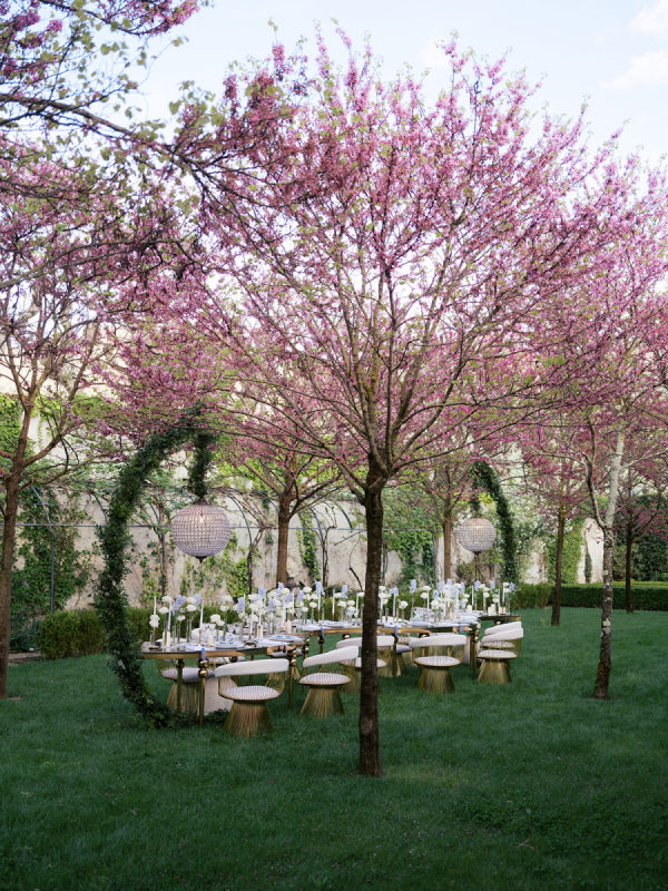 Ceremony: An all-white palette reflected the pure, serene beauty of Lake Como and its skies, and also reflected the beauty of our gorgeous bride. Crisp white flowers created a clean, elegant backdrop – a mirror of the lake’s calm and ethereal charm. Instead of traditional chairs, guests were seated on white, curvaceous, plush couches that mirrored the softness of clouds. We created bulky, flowing shapes for a modern, airy touch. Cocktail hour: Inspired by Italian chic and golden hour hues, the cocktail decor embraced warm yellow and orange tones that evoked the vibrant glow of an Aperol spritz, creating a stylish, sun-kissed Italian flair. Dinner: The palette shifted to royal blue and white, accented with gold in the chairs, table, and cutlery. Blue and white flowers added sophistication, while the flourishing cherry trees framed the long table with playful elegance. Mirrored tabletops and round mirrored chandeliers elevated the setting, reflecting light and adding a sense of luxury and glamour to the regal, clean-cut design. A perfect setting for an unforgettable Italian dinner.