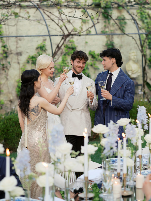 The groom and groomsmen wore tailored suits by Scala, a perfect blend of modern sophistication and timeless elegance. With clean lines, impeccable fit, and subtle detailing, it is ideal for an Italian wedding that also complements the ethereal romance of his bride’s look.