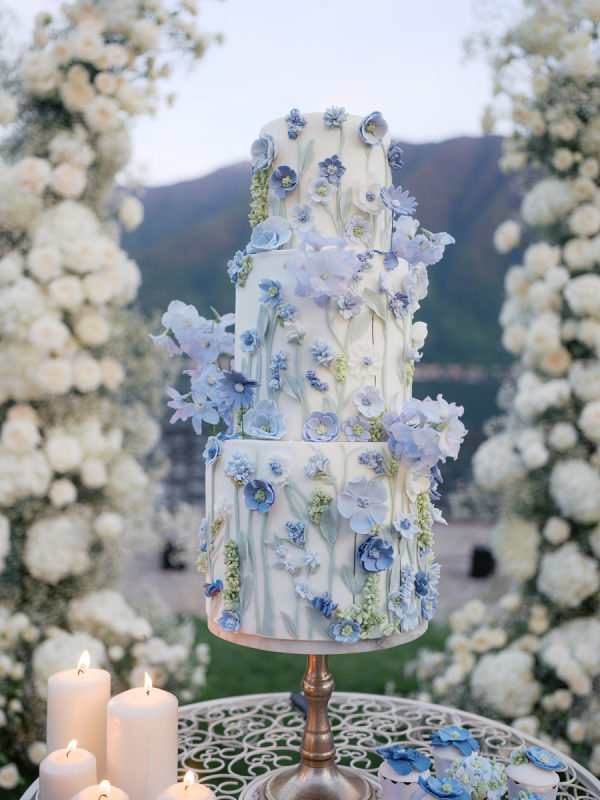 The wedding cake was a three-tiered cake, simple and elegant, adorned with small royal light blue flowers that perfectly echoed the dinner decor. Chic, refined, stylish and classic.