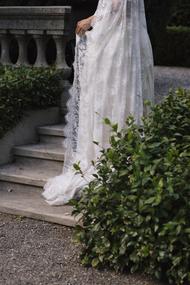 [field title=”Favorite Design Element”]As the photographer, my favorite design element was the way the lace-edged veil caught the golden light, creating layers of texture and shadow that felt almost painterly. It added movement and softness to every frame, seamlessly tying together the elegance of the gown, the delicate florals, and the ethereal glow of the gardens.[/field]