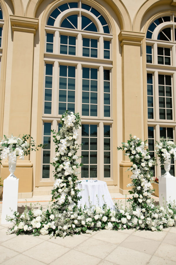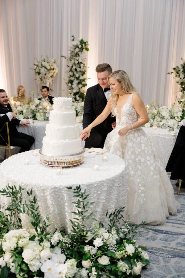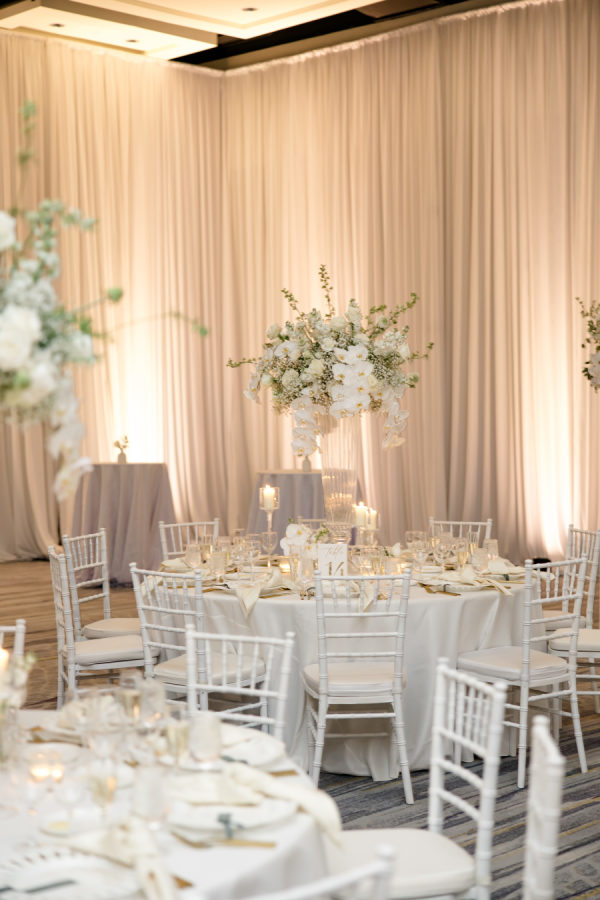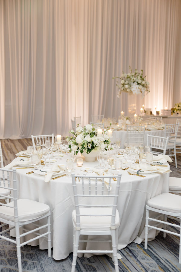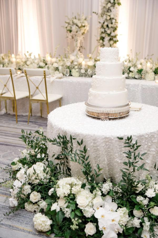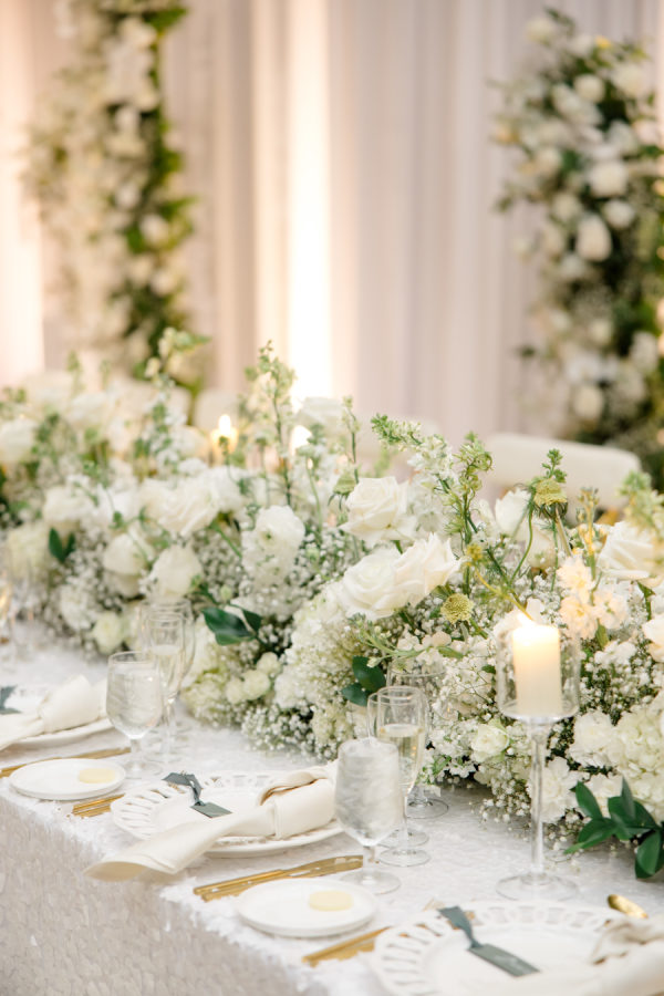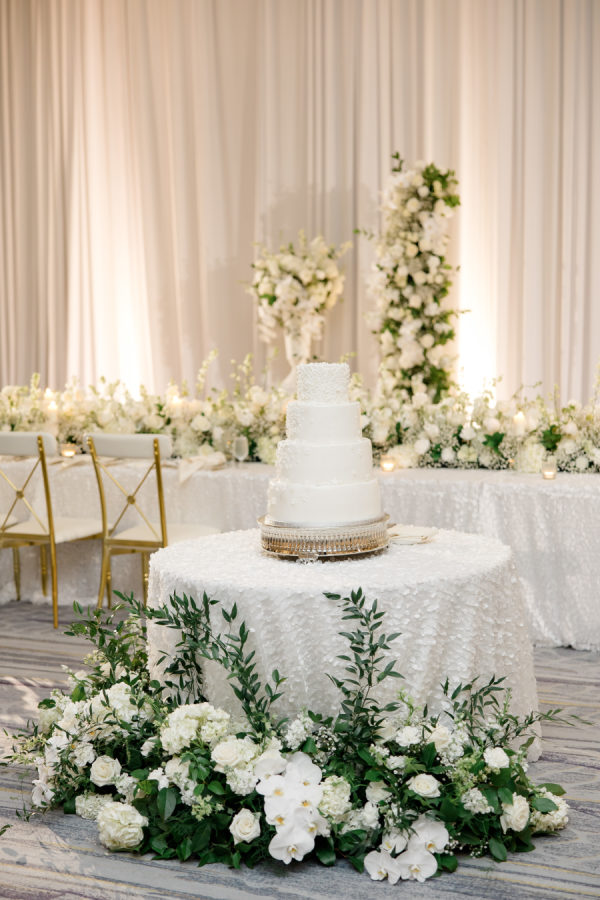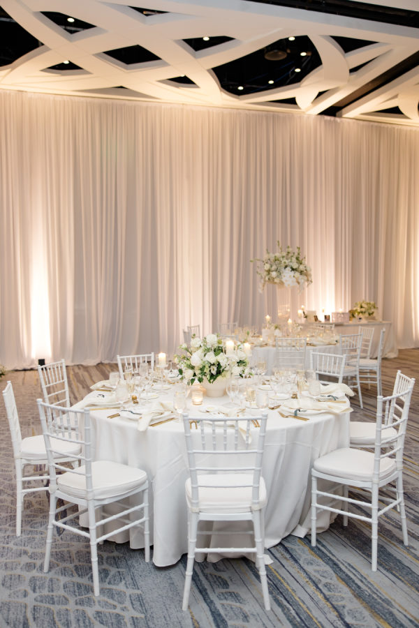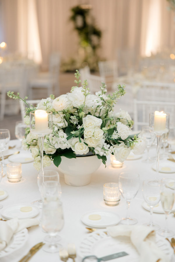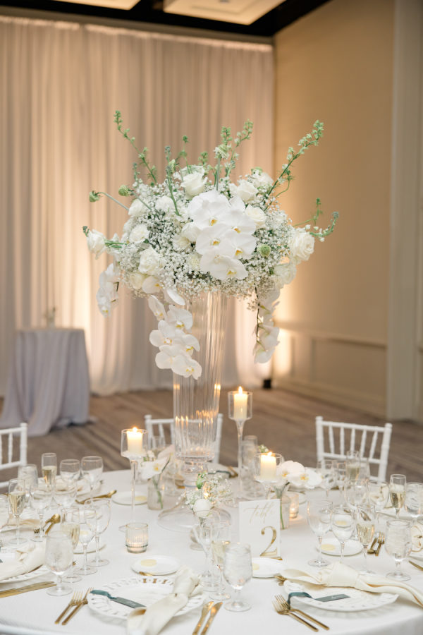 The floral design consisted of all pure white blooms of baby’s breath, garden roses, peonies, and orchids. With cascading elements from the ceremony to the reception, with lush flowers and candles throughout. The custom wrapped dance floor centered the room with statement 8′ pieces in the corners and a bar that completed the room. There were details from the moment guests entered.
