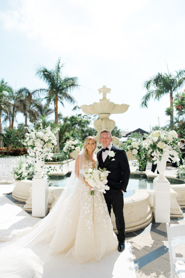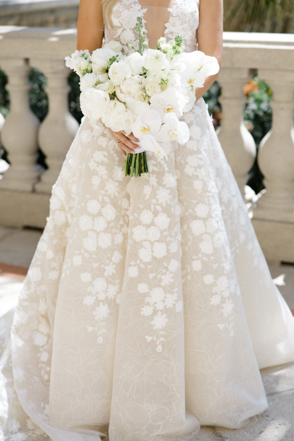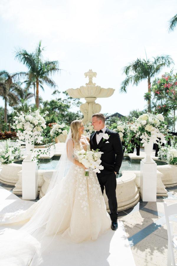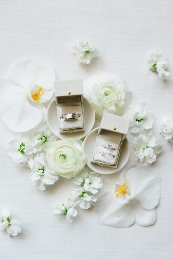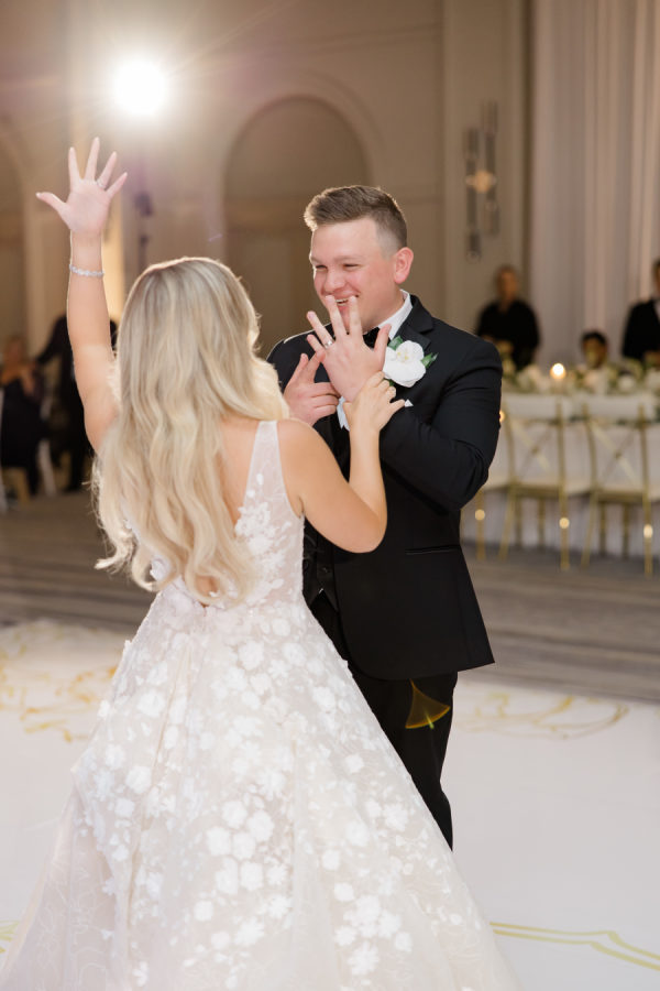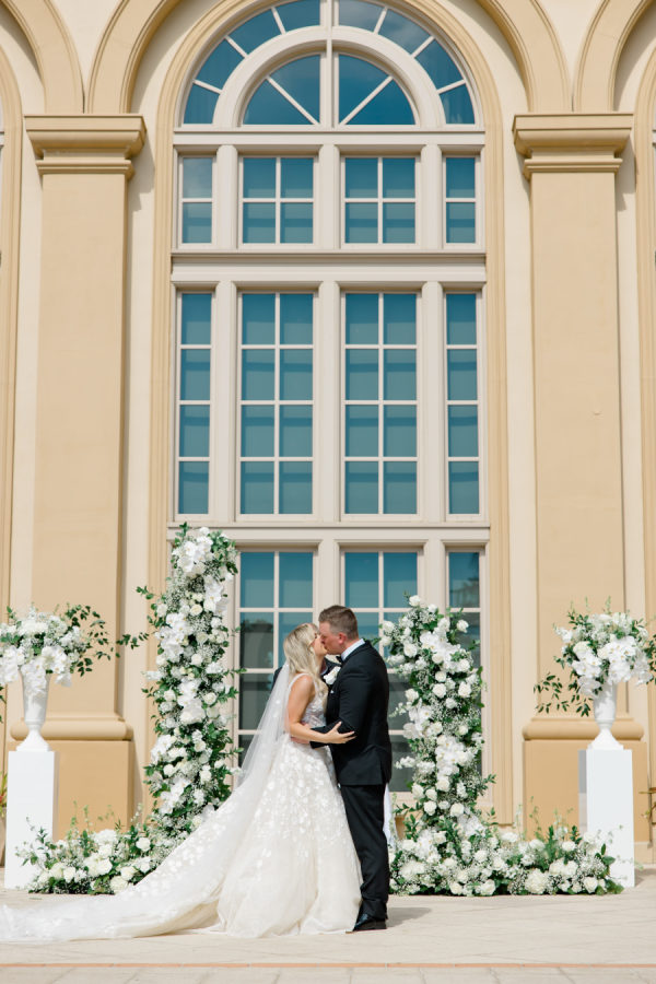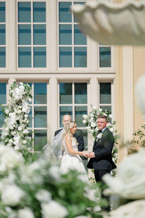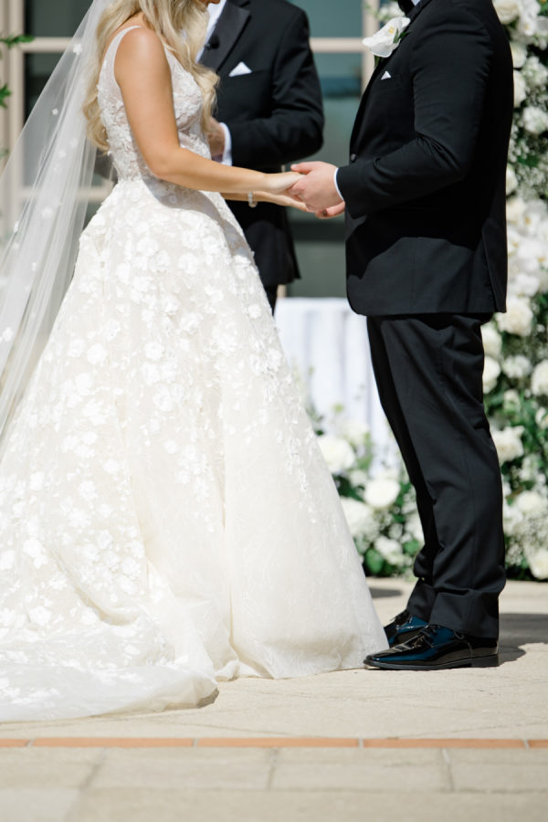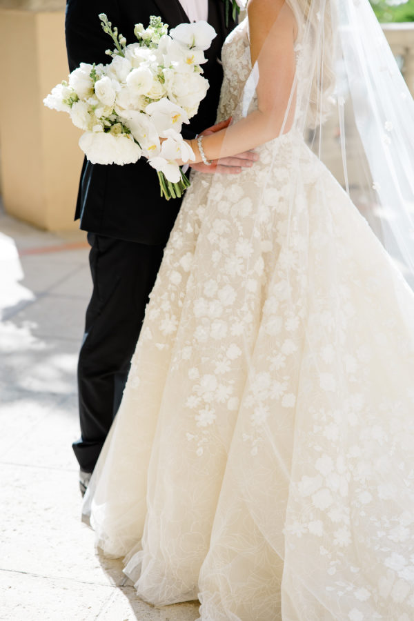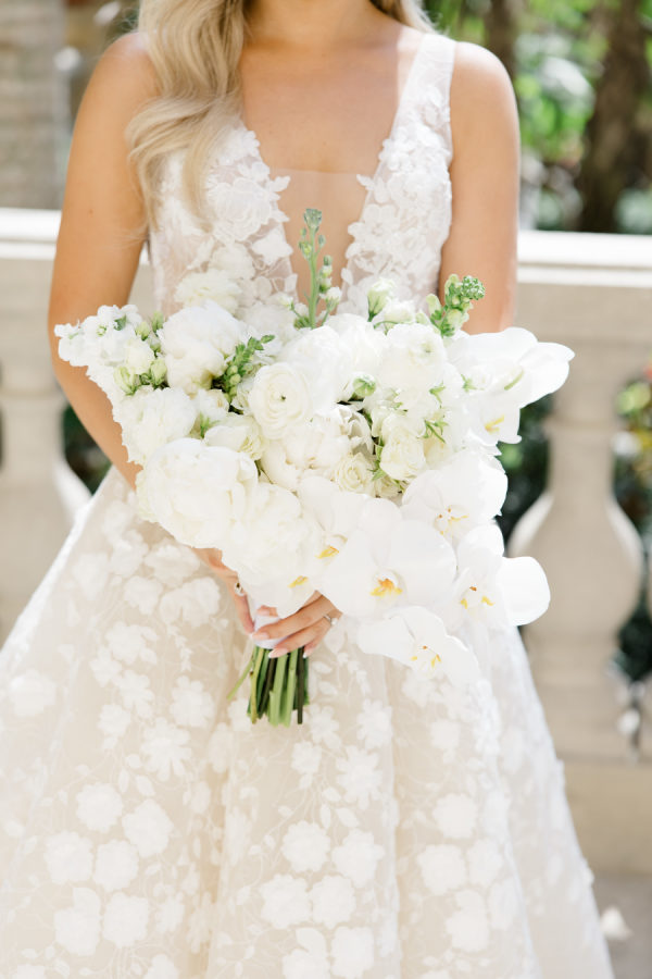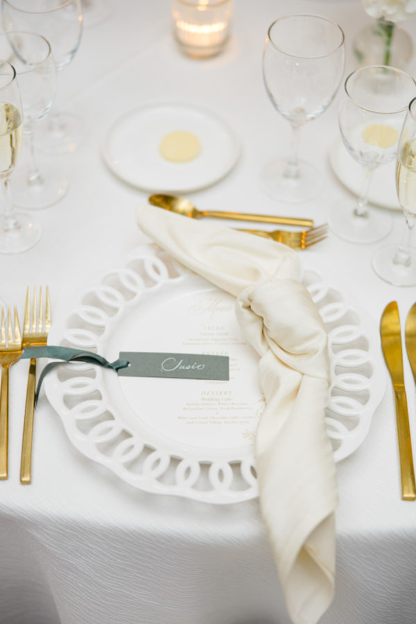 The floral design consisted of all pure white blooms of baby’s breath, garden roses, peonies, and orchids. With cascading elements from the ceremony to the reception, with lush flowers and candles throughout. The custom wrapped dance floor centered the room with statement 8′ pieces in the corners and a bar that completed the room. There were details from the moment guests entered.