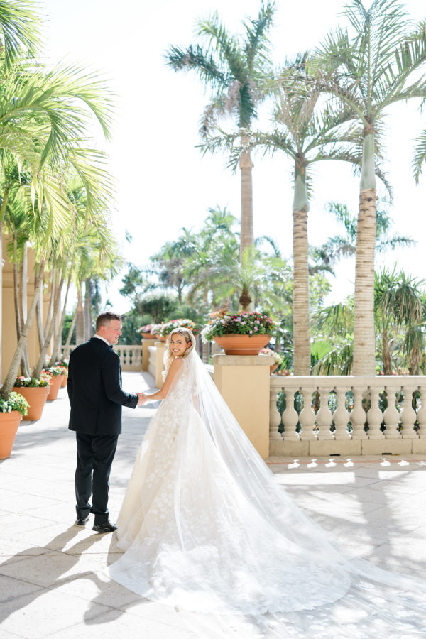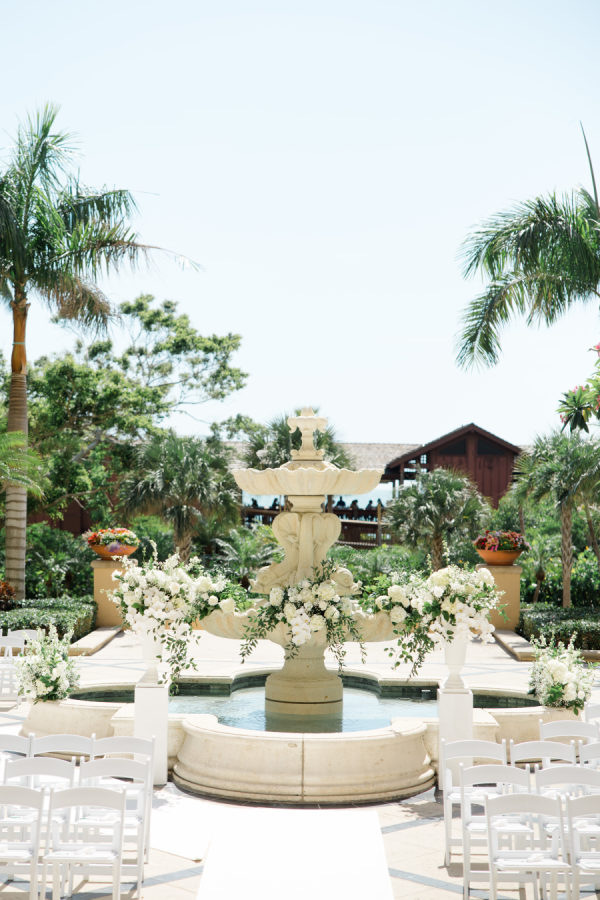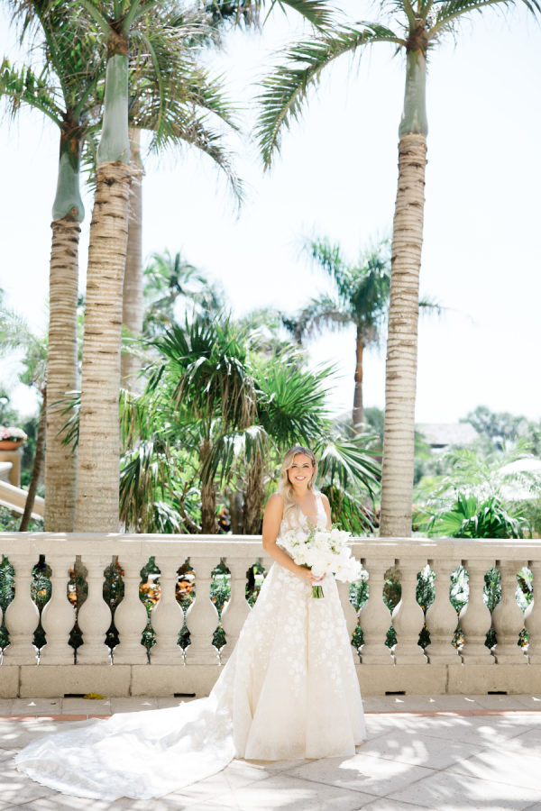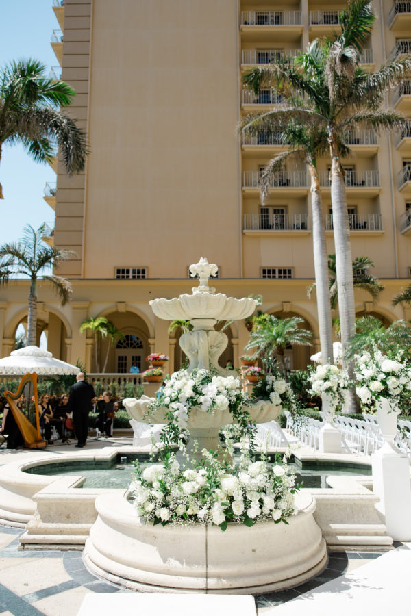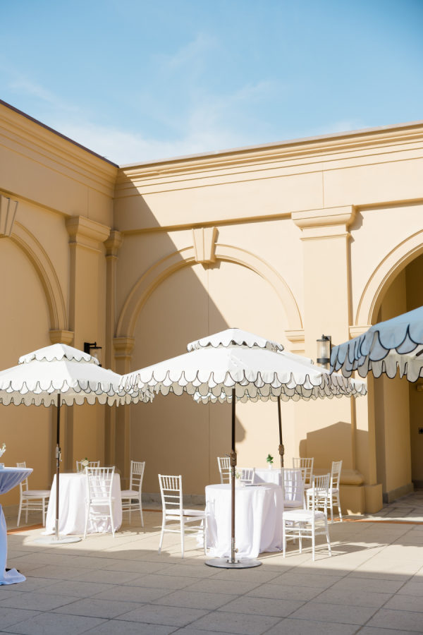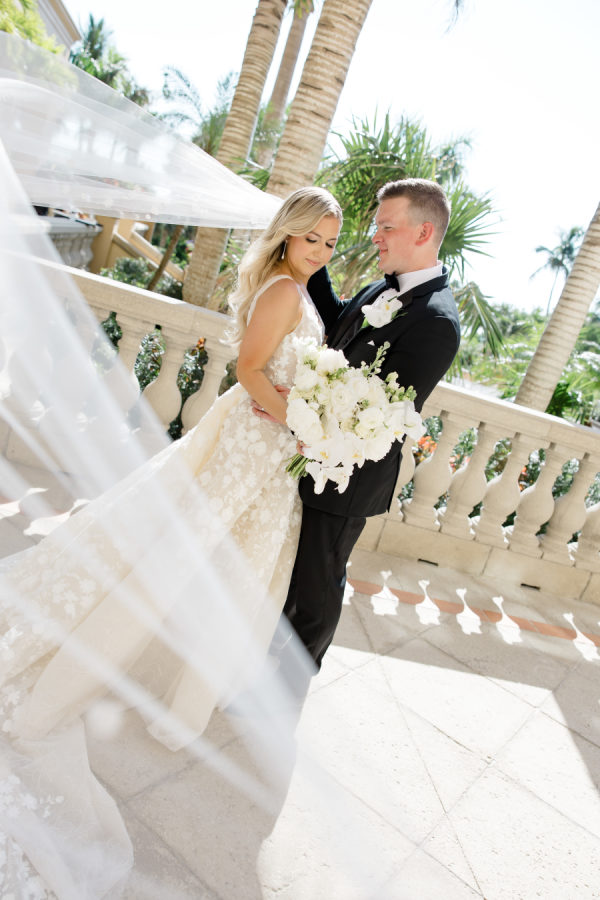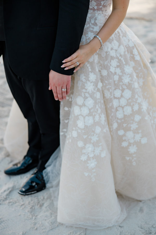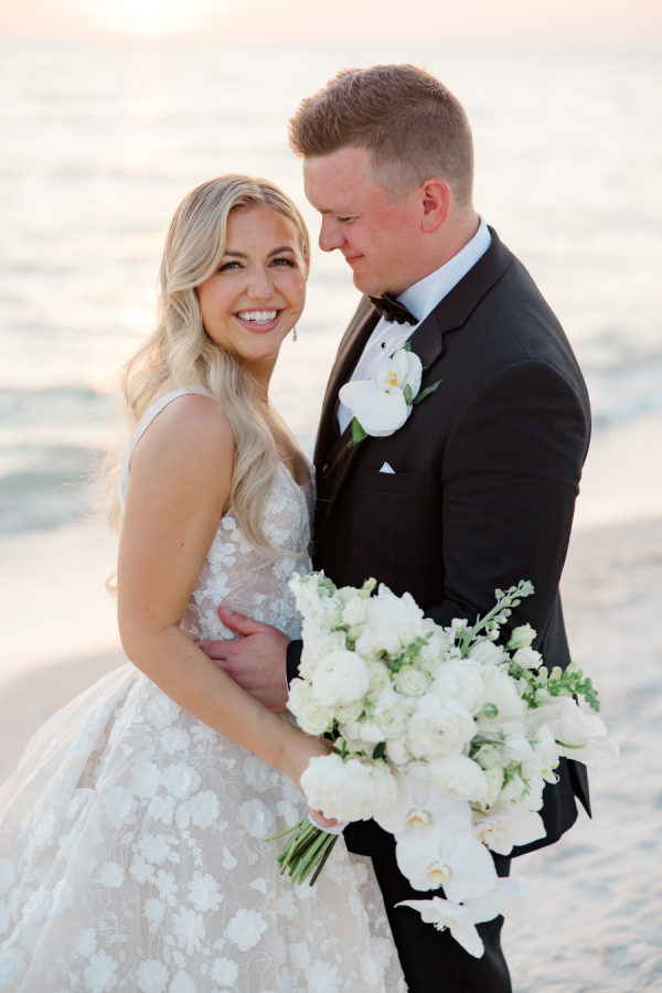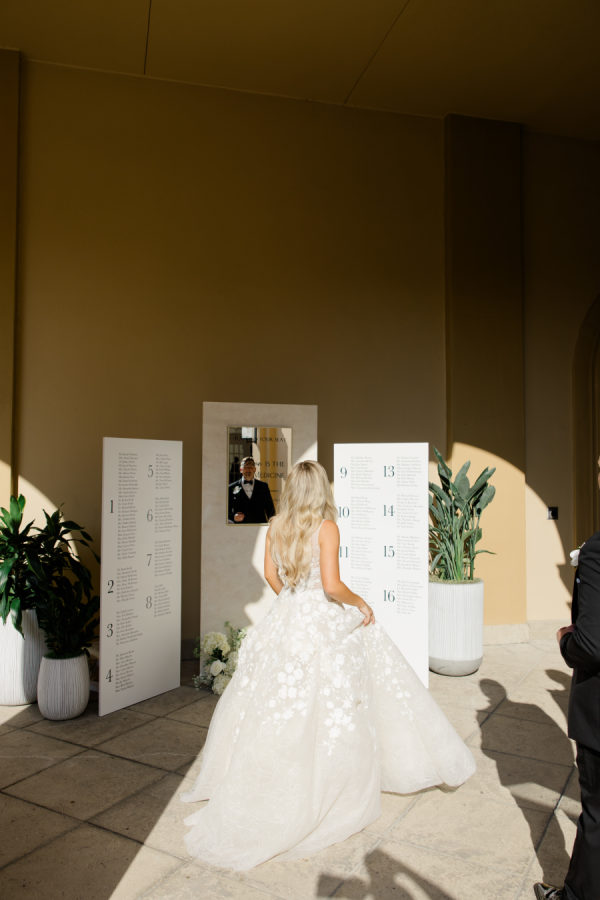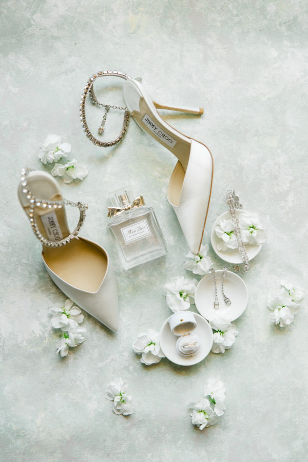 The floral design consisted of all pure white blooms of baby’s breath, garden roses, peonies, and orchids. With cascading elements from the ceremony to the reception, with lush flowers and candles throughout. The custom wrapped dance floor centered the room with statement 8′ pieces in the corners and a bar that completed the room. There were details from the moment guests entered.
