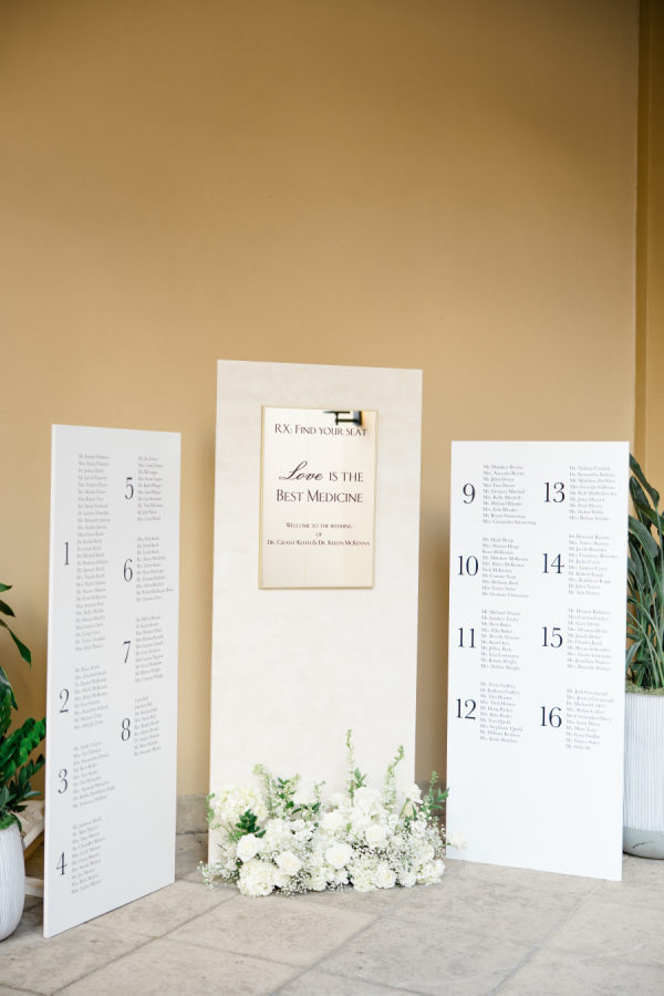 “RX: A Prescription for Joy” With both newly minted doctors, we gave Keelin and Grant a playful nod to their medical school journey with a seating chart that doubled as a dose of charm. Titled “Love is the Best Medicine”, the escort display looked like a pharmacy of affection. Each guest found their “prescription” for the evening under the banner RX: Find Your Seat, turning a classic wedding detail into a moment of delight and personality.