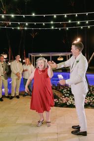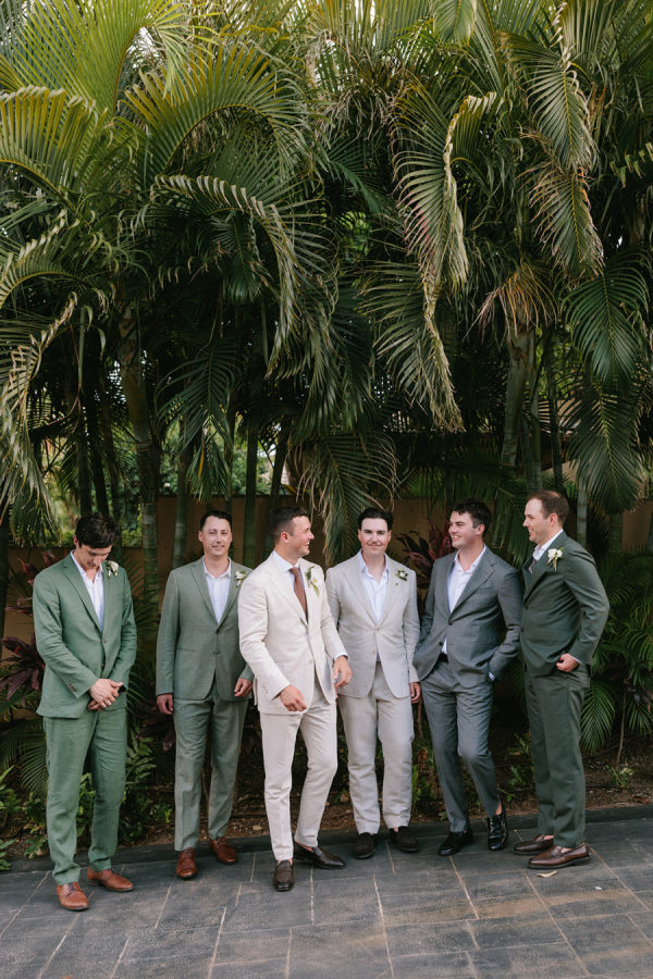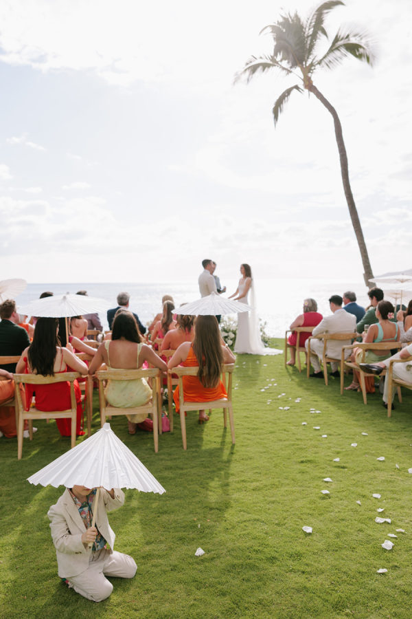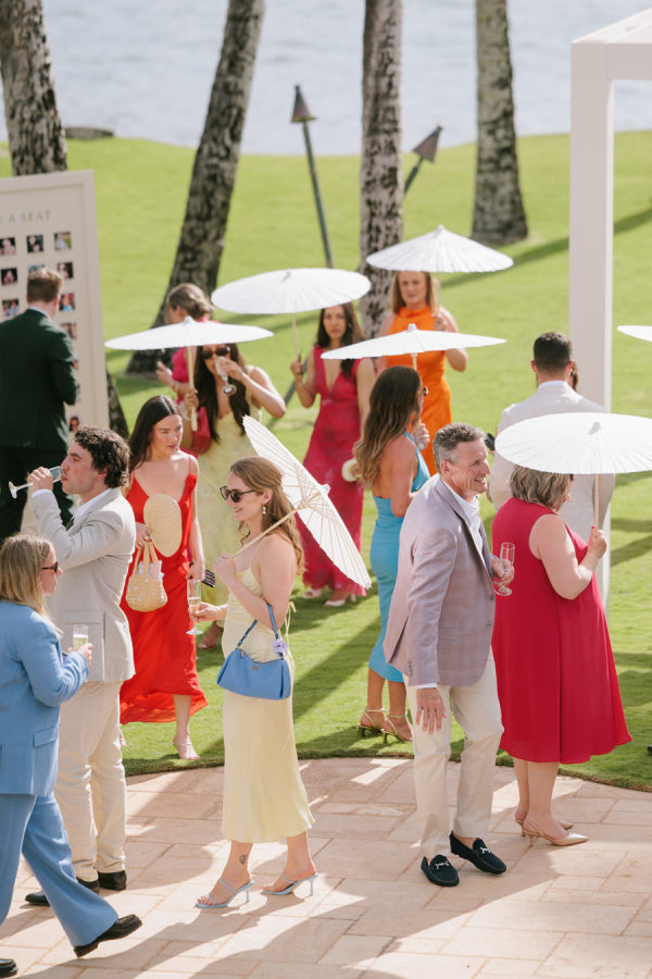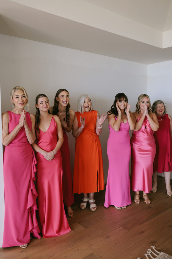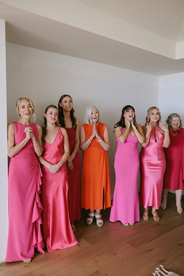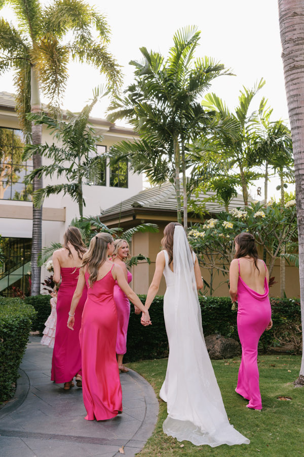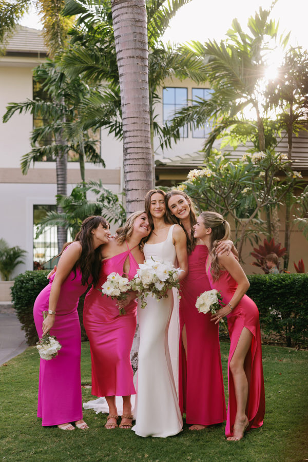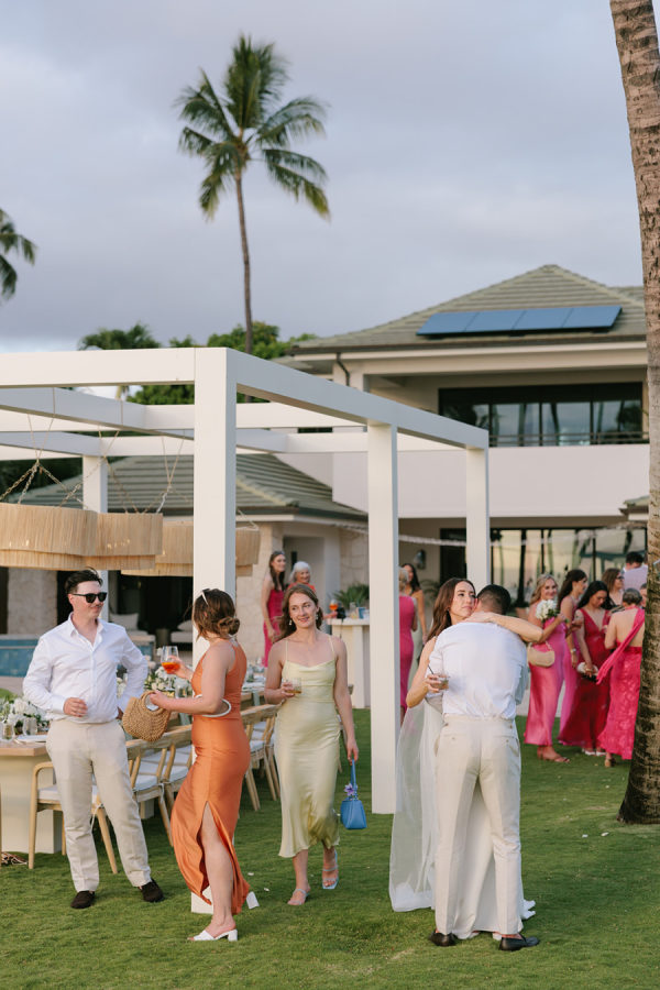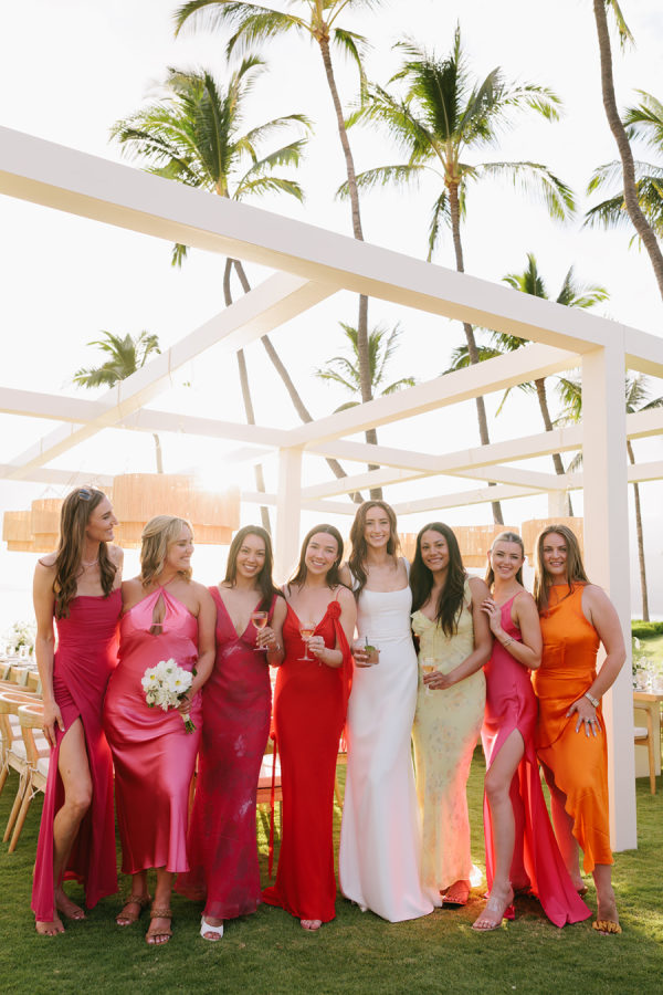 [field title=”Bridesmaid Dresses”]There were no official bridesmaids, but Arden’s mother, sister, grandmother, and closest girlfriends wore punchy, vibrant dresses in shades of pink and orange reminiscent of a fiery Hawaiian sunset. Each dress featured a different silhouette, making every look unique and personal. This allowed everyone to choose something they felt comfortable and confident in, adding to the joyful and colorful energy of the day.[/field]