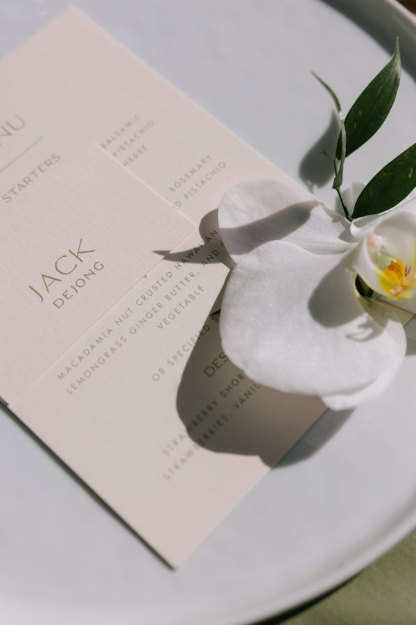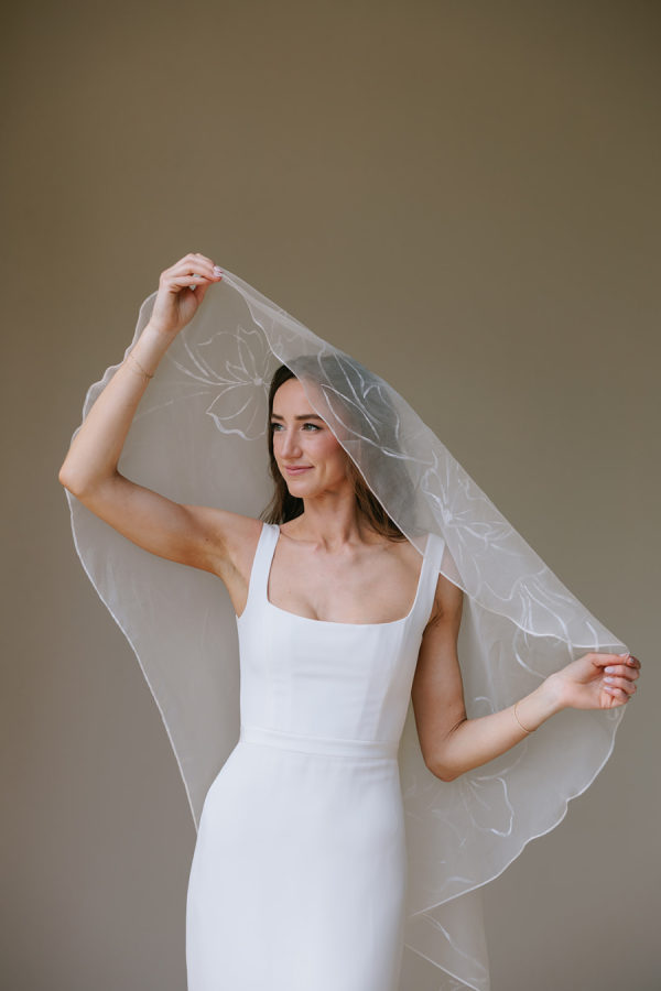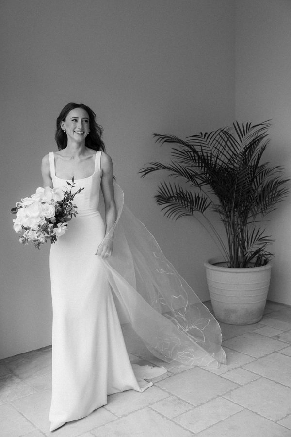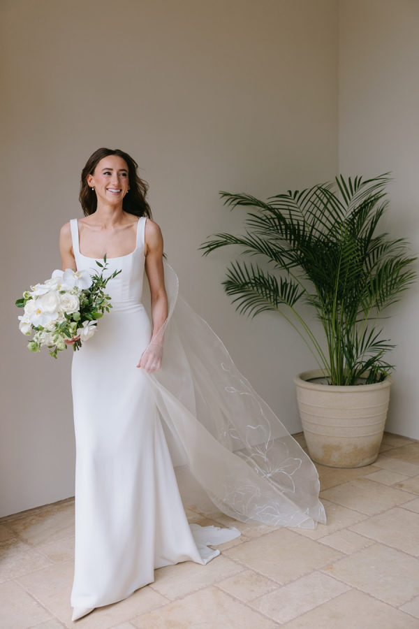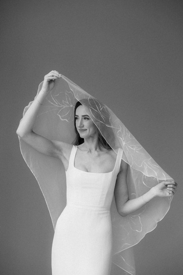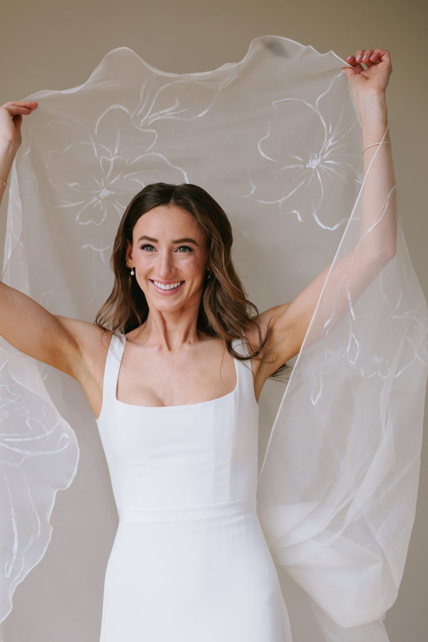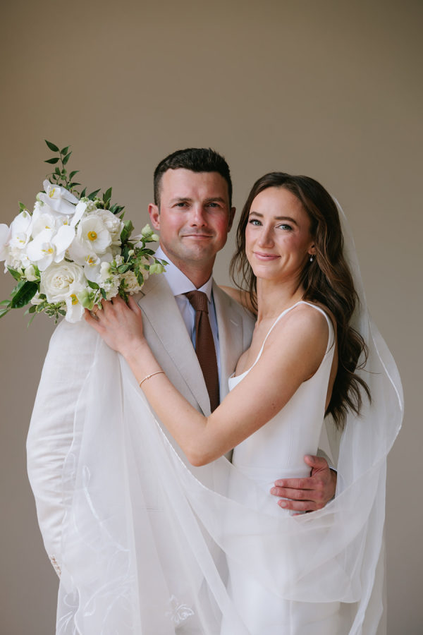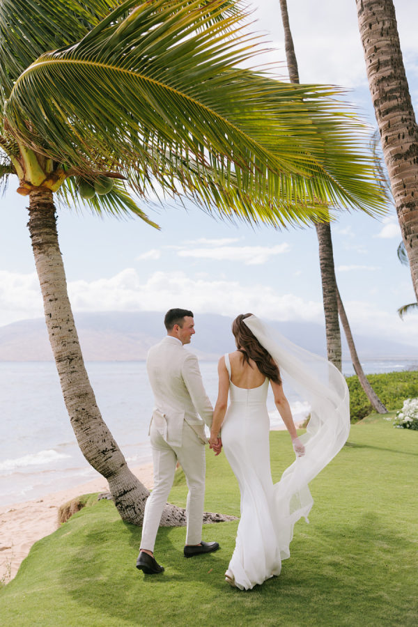 Arden’s gown by Alexandra Grecco made a quiet statement with its clean lines and modern shape. The structured bodice featured a soft square neckline and wide straps, perfectly framing her silhouette. Made from matte fabric, the dress had a smooth, refined finish that felt both timeless and intentional. Arden’s veil, designed by OUMA, added the perfect unexpected detail to her look. “I wanted to go with the hand-painted florals on the veil because I felt that I could afford to do something a bit unique and different, given the simplicity of the dress,” she shared. “I also felt like it was a good nod to Hawaiian florals in a very understated way.” The result was something soft, personal, and just the right amount of unconventional.