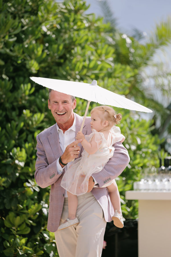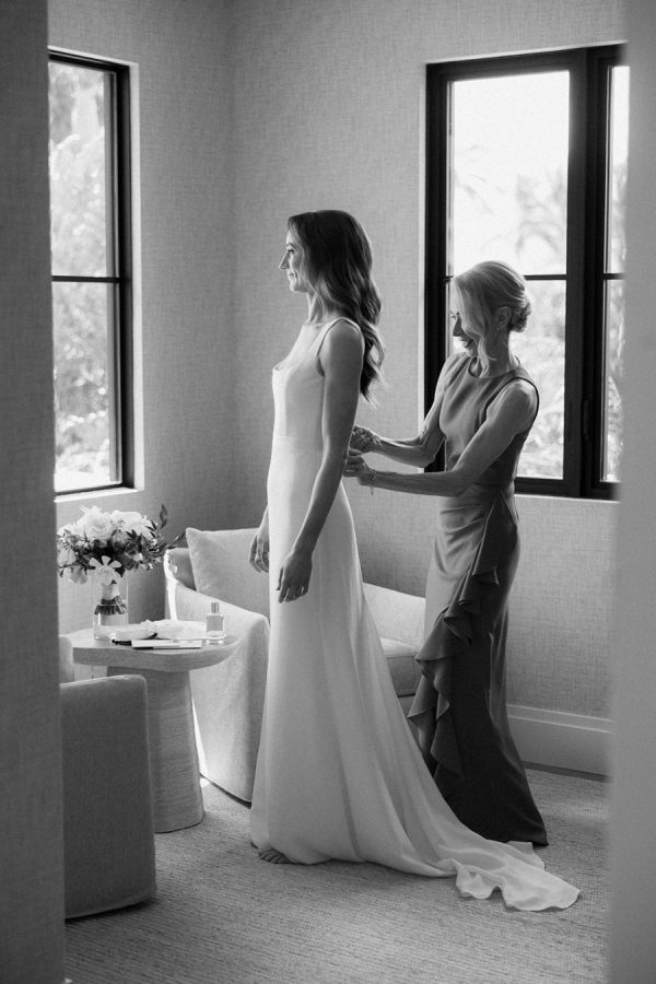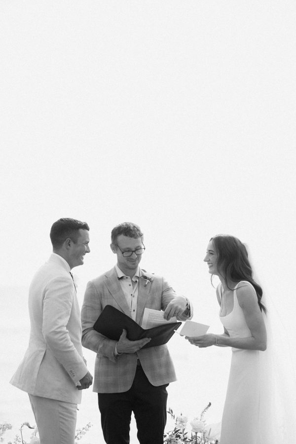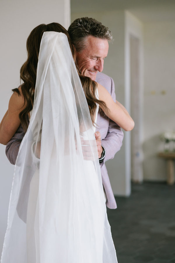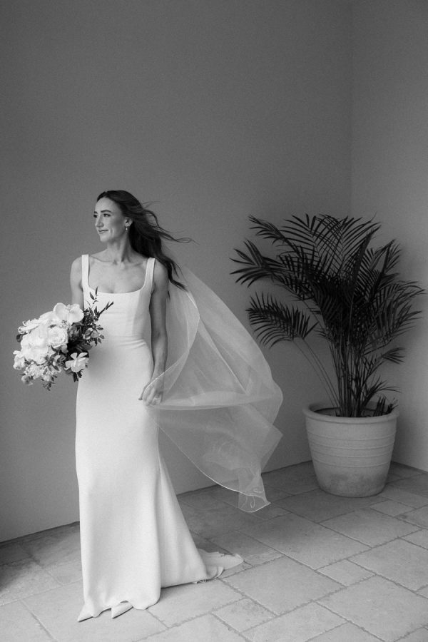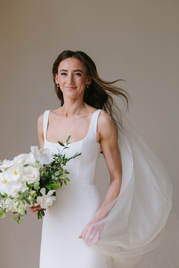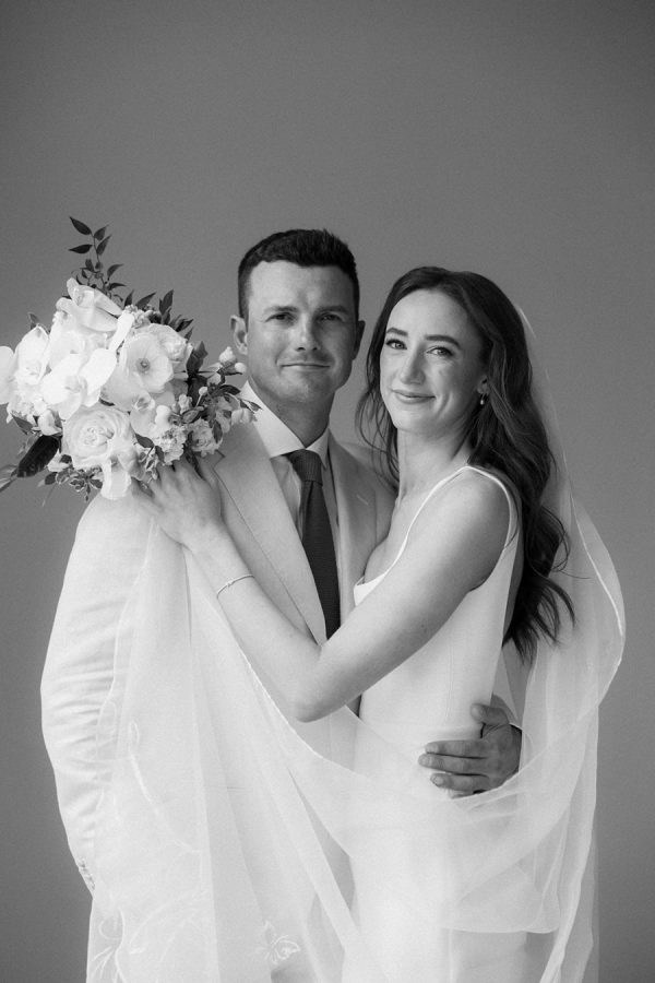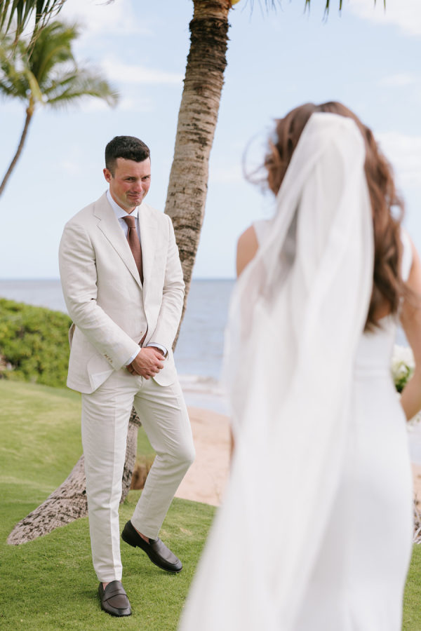 Arden’s gown by Alexandra Grecco made a quiet statement with its clean lines and modern shape. The structured bodice featured a soft square neckline and wide straps, perfectly framing her silhouette. Made from matte fabric, the dress had a smooth, refined finish that felt both timeless and intentional. Arden’s veil, designed by OUMA, added the perfect unexpected detail to her look. “I wanted to go with the hand-painted florals on the veil because I felt that I could afford to do something a bit unique and different, given the simplicity of the dress,” she shared. “I also felt like it was a good nod to Hawaiian florals in a very understated way.” The result was something soft, personal, and just the right amount of unconventional.