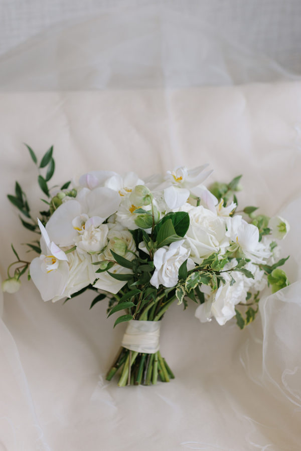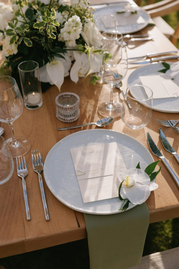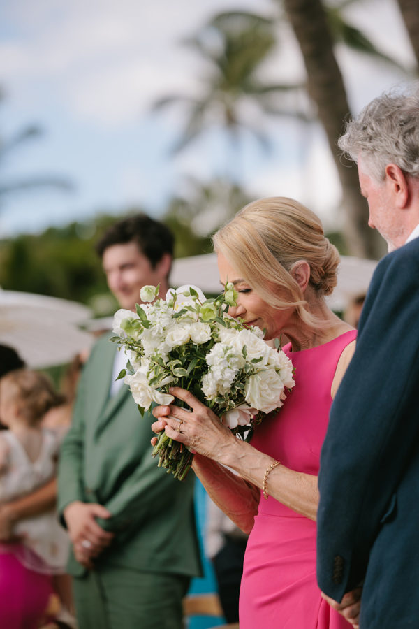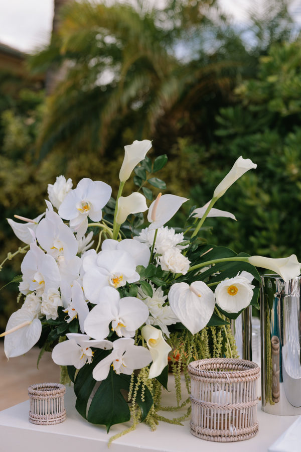 We worked closely with Teresa Sena Designs and her lead designer, Kira Roberts, to bring Arden and Pierce’s floral vision to life. The overall design was elegant and refined, with a palette of soft whites, creamy tones, and just a touch of greenery. Island orchids, anthurium, and full-petaled blooms gave everything a romantic, natural feel that fit the Maui setting perfectly. One of the most special touches was the gardenias — Arden’s favorite flower. Teresa and Kira sourced them beautifully, and their sweet, nostalgic scent floated through the air all day. It was a meaningful detail for the bride and added something truly personal to the overall design. Arden’s bouquet featured a soft, organic arrangement of white florals and Phalaenopsis orchids with minimal greenery. It was simple, timeless, and completely true to her. For the ceremony, garden-style arrangements framed the couple as they exchanged vows. Tall spring blooms like delphinium and larkspur added just the right amount of height, while orchids and roses brought in softness and texture. The reception carried that same feeling, with two long, low arrangements running down the dining tables. Creamy white blooms, phalaenopsis orchids, and a hint of tropical foliage were mixed with soft candlelight from whitewash rattan and glass votives. A single orchid with a touch of greenery topped each napkin — simple, thoughtful, and just enough. Every floral detail came together to create a setting that felt effortlessly elegant and deeply personal — a perfect reflection of Arden and Pierce’s day.