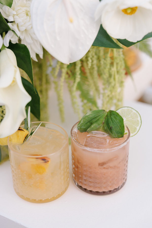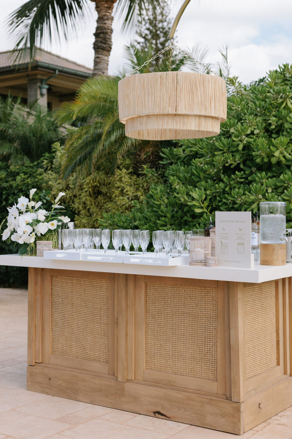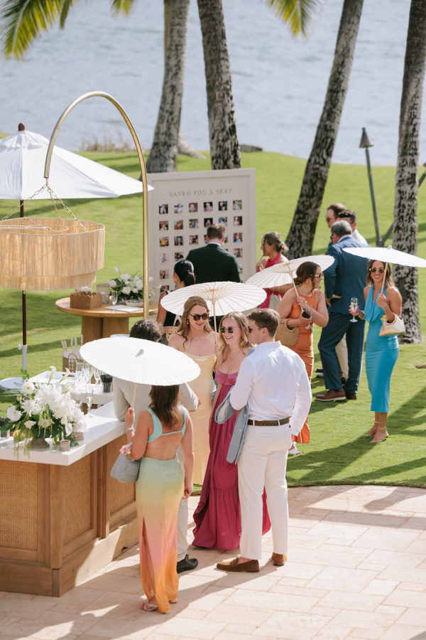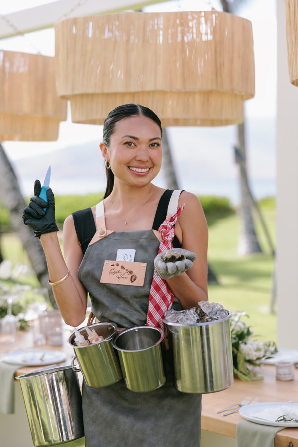 Food and beverage was executed by Cutting Edge Catering, who brought the perfect balance of local flavor, thoughtful presentation, and exceptional service to the day. From the beautifully crafted cocktails to the artfully plated dishes, every detail felt intentional and true to Arden and Pierce’s vision. The couple opted for signature cocktails that reflected their personalities — Pierce’s “Old Hawaii” was a bold mix of bourbon, fresh lemon and lime, charred pineapple, citrus brûlée, and rosemary, while Arden’s “Kula Crush” was a bright, refreshing blend of vodka, guava, muddled strawberry, basil, and ginger infusion. Guests were treated to a delicious lineup of tray-passed pupus during cocktail hour, including crispy coconut shrimp with green mango and Hawaiian chili jam, mochiko chicken glazed with unagi and hot miso mustard, and hamachi misoyaki musubi with wasabi, sesame rice cake, nori, and ocean salad. Dinner was served as a duo entrée, giving guests the best of both worlds: Hawaiian rancher’s beef striploin with rosemary garlic potatoes, chili emulsion, and pistachio date pesto, alongside a macadamia nut-crusted Hawaiian catch with lemongrass ginger butter and seasonal vegetables. And for dessert? A twist on the traditional wedding cake — a beautifully plated strawberry shortcake with roasted strawberries and vanilla basil gelato. It was the perfect sweet ending to a truly memorable meal. One standout during cocktail hour was Oysters Hawaii, a mobile oyster shucking company. Their fresh oysters, served with a selection of homemade sauces, were a total hit and brought a fun, elevated experience that felt very “Arden and Pierce.”