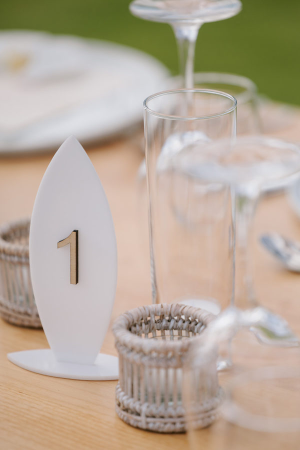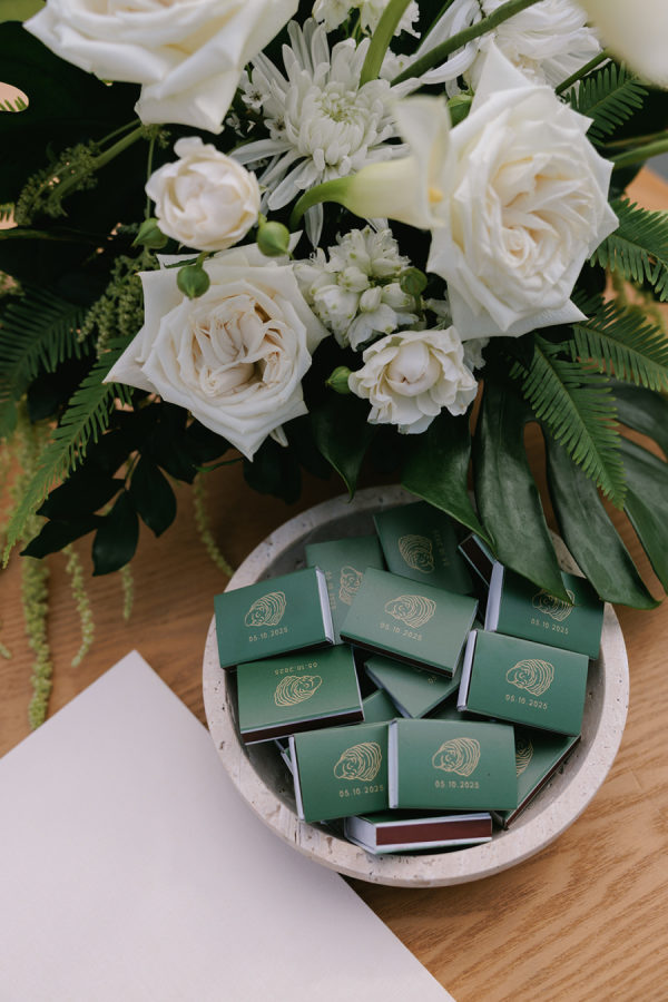 They also included a bowl of custom matches embossed with a gold foil oyster design—a nod to their love of oysters. The matches were beautifully displayed in a travertine bowl, surrounded by whitewash rattan votives and a woven card box, all contributing to the inviting, natural vibe.