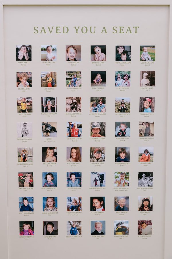 Completing the space was a highlight of the evening: a custom seating chart by Miss B Calligraphy. Set on an off-white background with sage lettering, the chart featured each guest alongside their adorable baby photo — a charming detail that quickly became a favorite conversation starter.[/field]