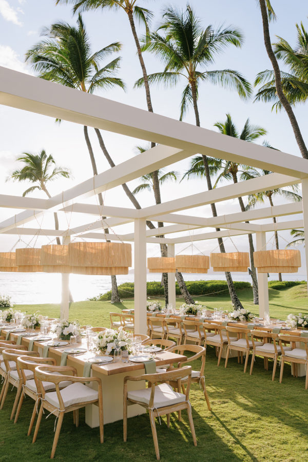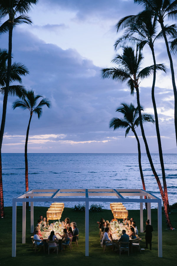 We chose Artisan Events Maui’s beautiful dining structures to shape the event layout and design. They created an intimate, elevated atmosphere that perfectly complemented the stunning Maui backdrop — never competing with it, but instead bringing the whole look together with effortless elegance.