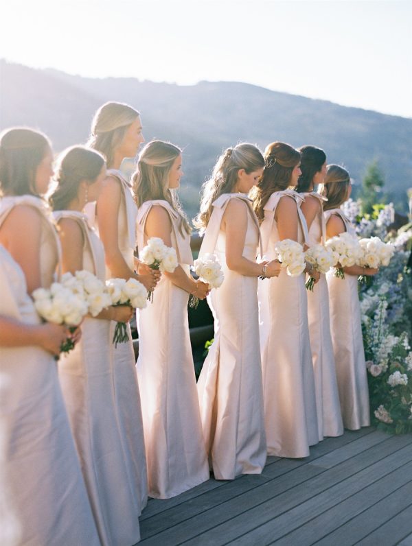 The bridesmaids wore modern, fitted, light tan satin dresses.