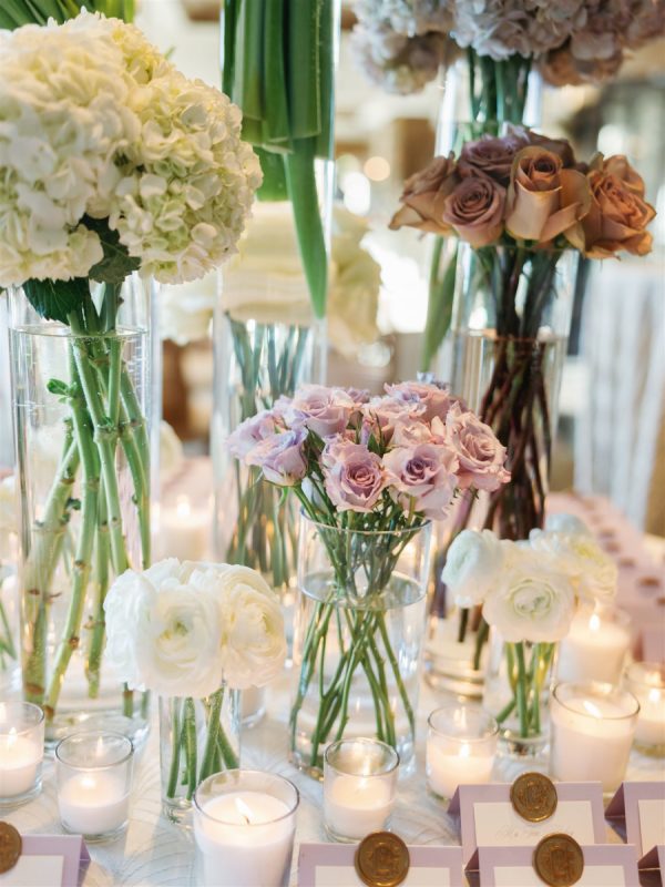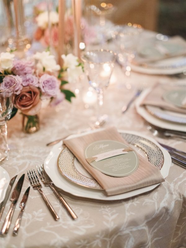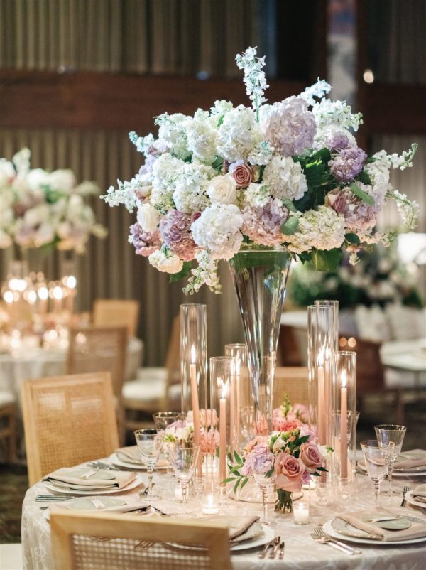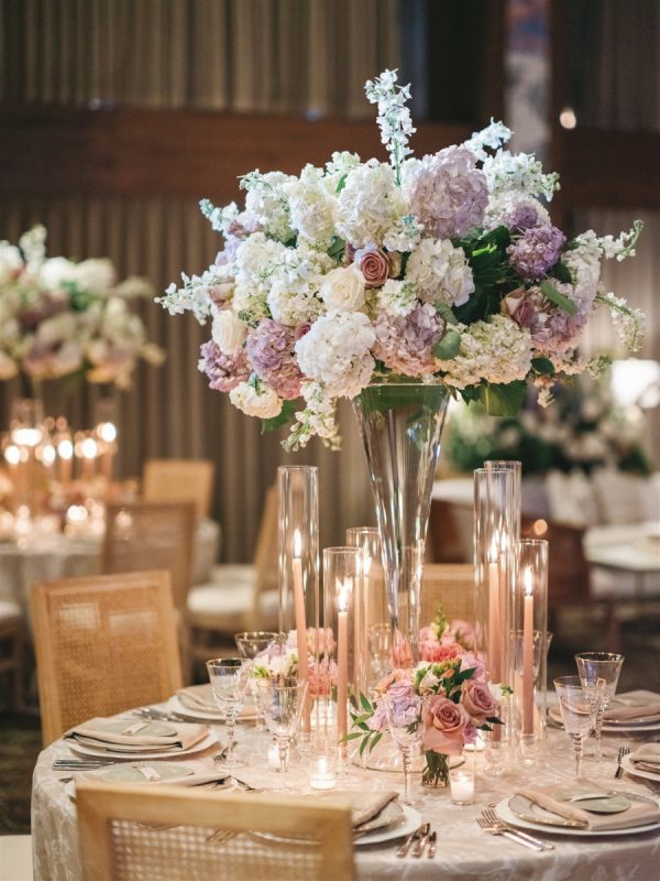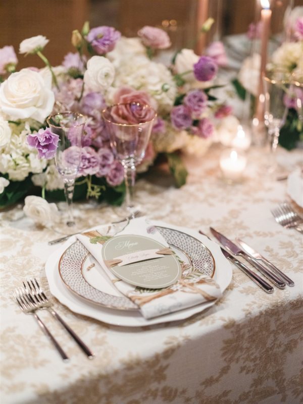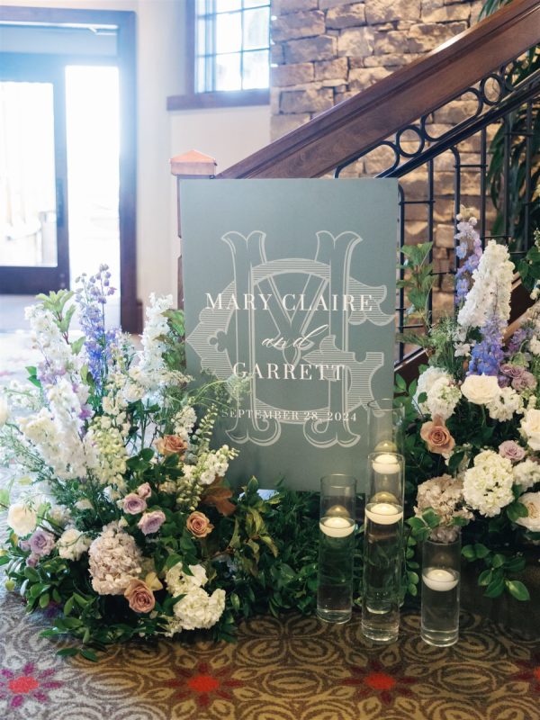 The florals and decor for Mary Claire and Garrett’s wedding were lush and romantic, full of creams, soft purples, and pinks. The ceremony was lined with florals, with a gorgeous cove of florals perfectly centered for the bride and groom. The cocktail hour had a custom-built soft green bar and modern florals throughout.