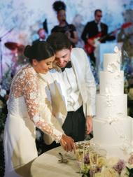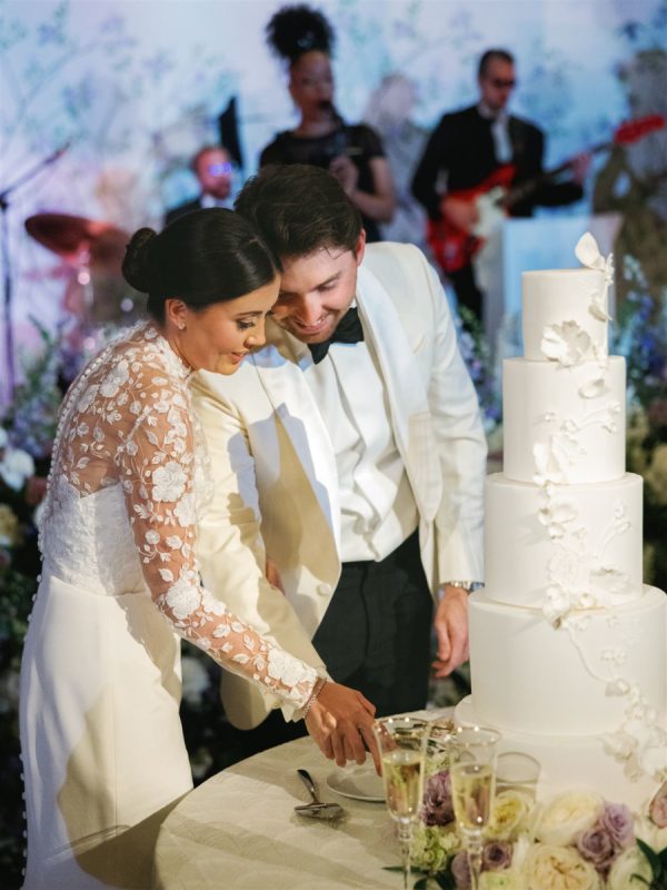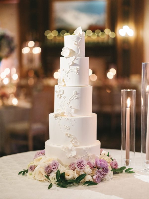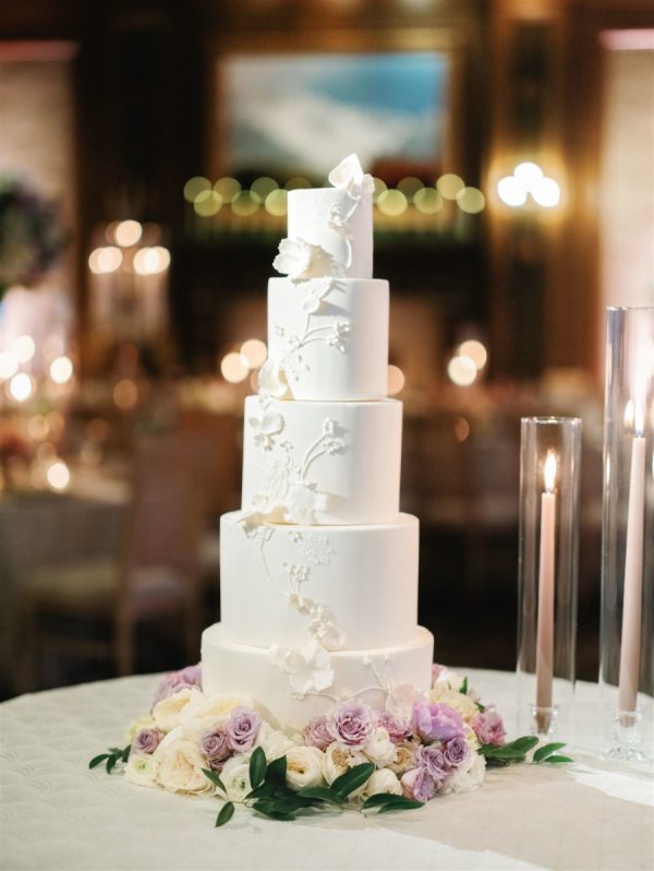 Mary Claire and Garrett’s wedding. Claire was a five-layer white traditional wedding cake with modern, sleek lines and floral appliqué sugar flowers.