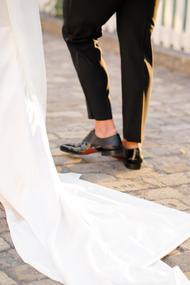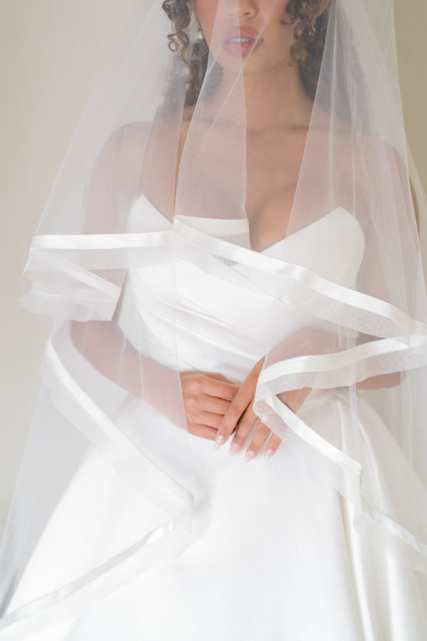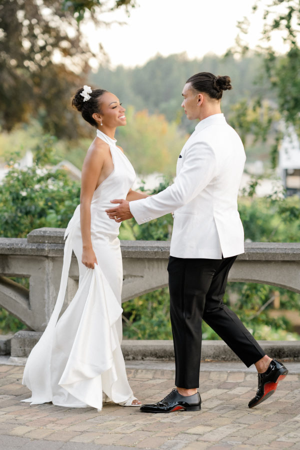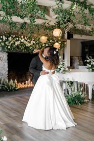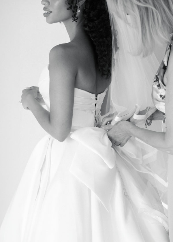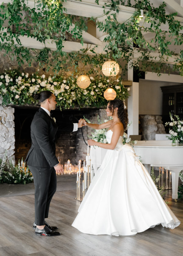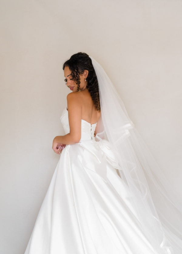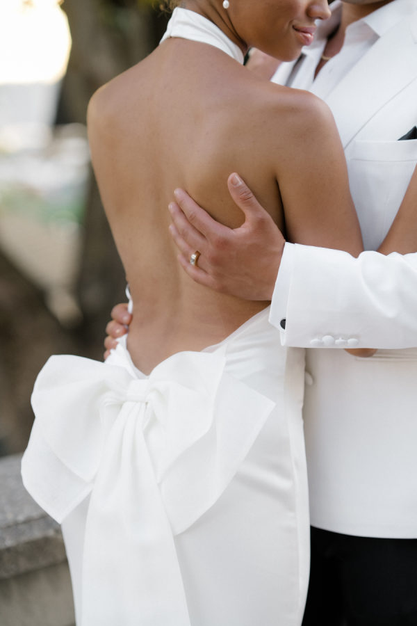[field title=”Wedding Gown”]The bride wore a beautiful gown from Kleinfeld Bridal, featuring dramatic structure, a giant bow on the back, and romantic detailing. The silhouette was both sculptural and feminine, designed to move gracefully while making a powerful visual statement.[/field]