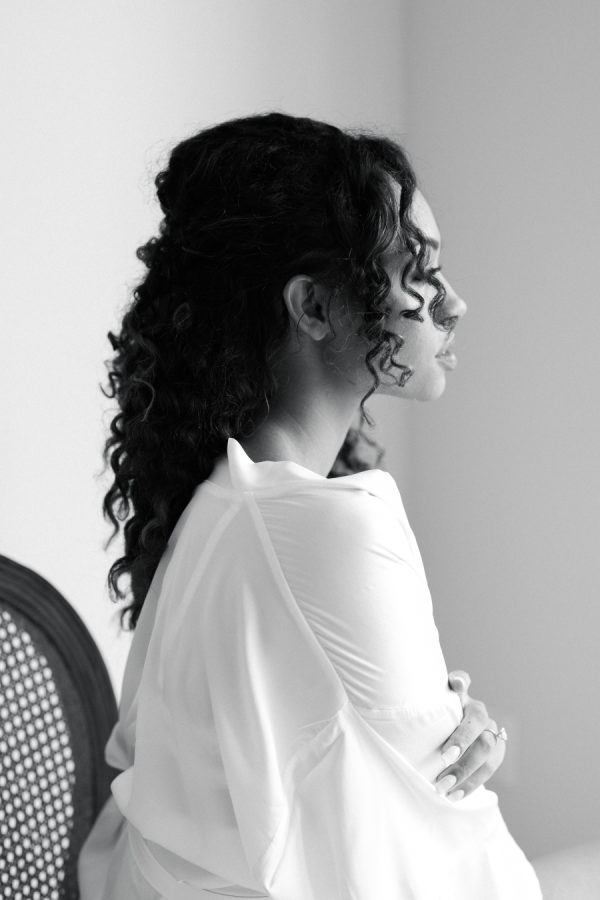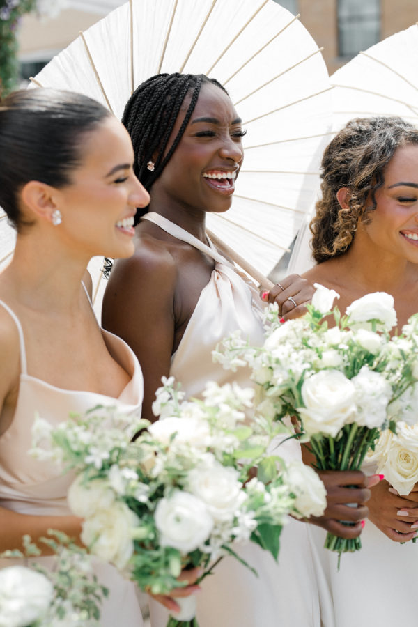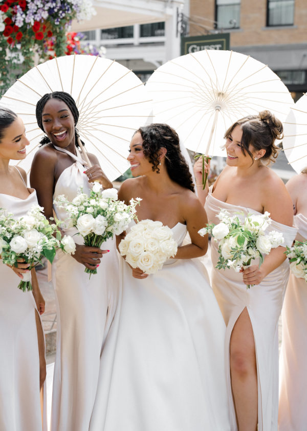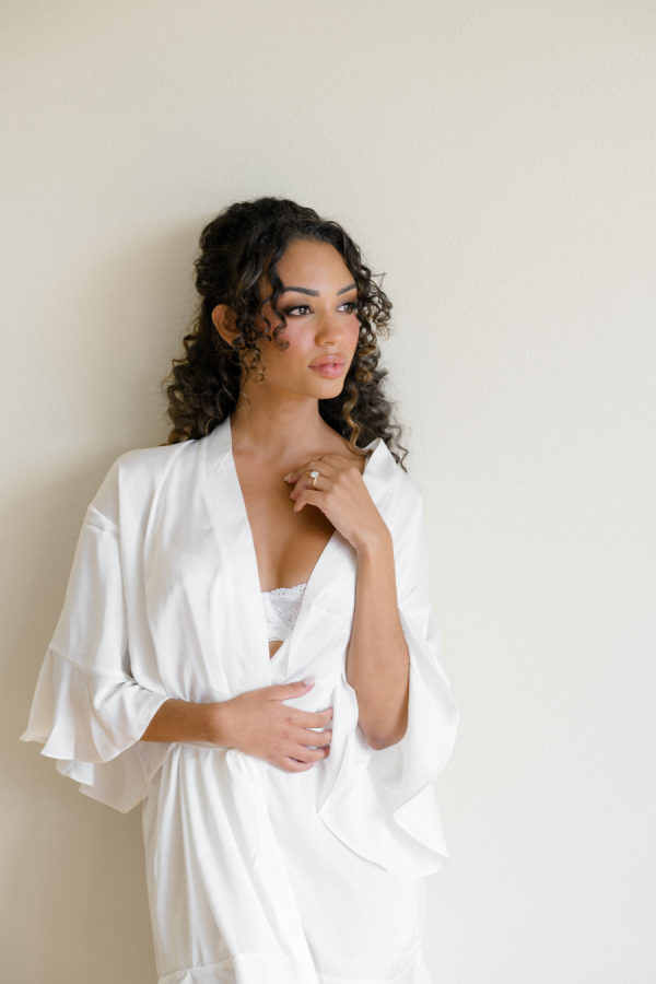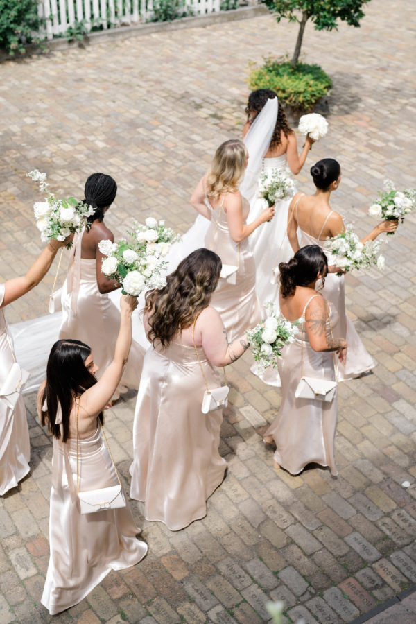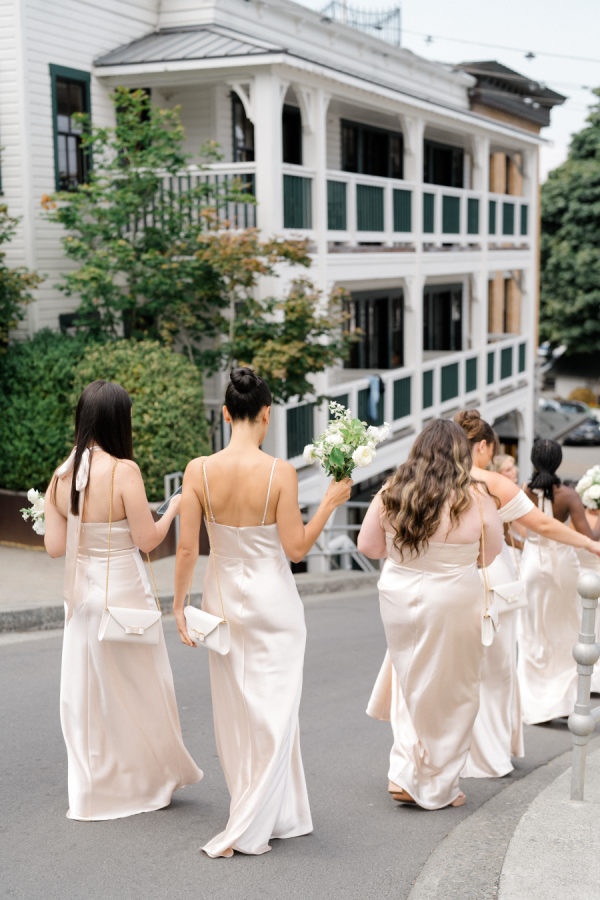 Bridesmaids wore soft, champagne-toned dresses from Birdy Grey, each style offering subtle variations in neckline and silhouette to complement individual preferences. Their matching robes and slippers — also from Birdy Grey — added a sense of cohesiveness to the getting-ready suite.