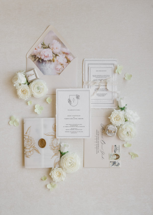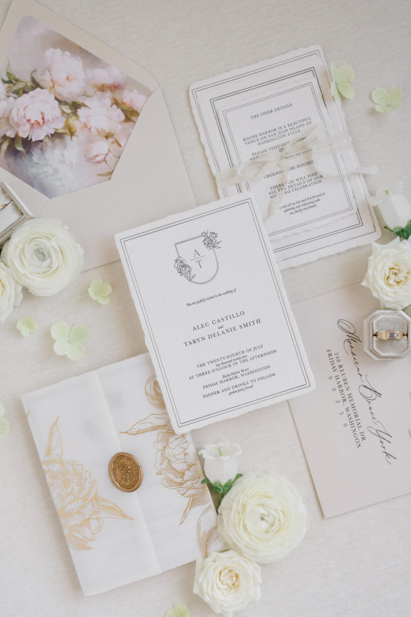The overall aesthetic was timeless and sophisticated, with a strong focus on intentional design. Events by Genevieve brought the couple’s vision to life with an editorial approach to layout, flow, and visual storytelling. The design was classically romantic, with lush florals, luxurious textures, and thoughtful use of natural light. Personalized touches — like custom calligraphy signage and bespoke welcome bags from San Juan Island Sea Salt — added a sense of intimacy and refinement.