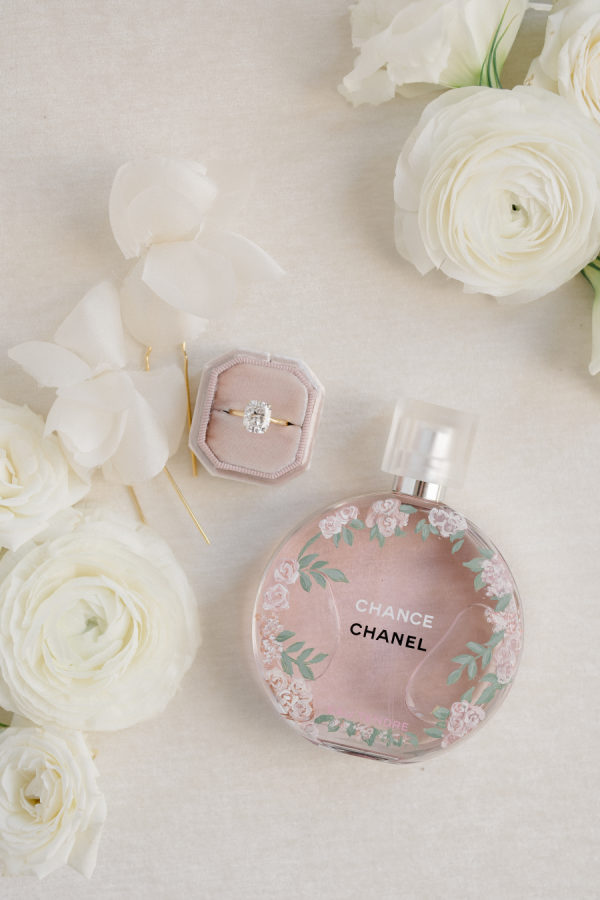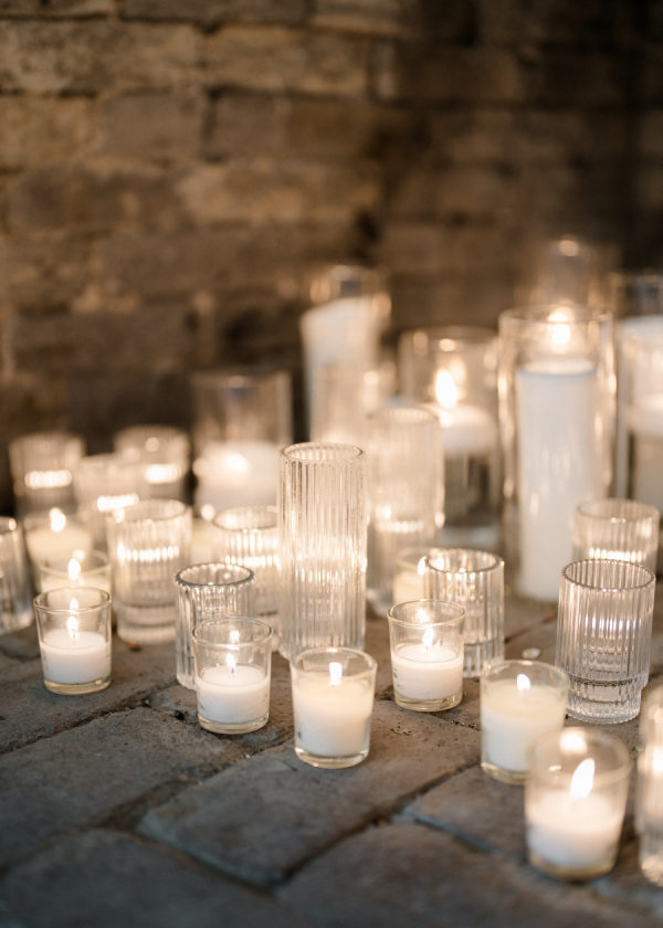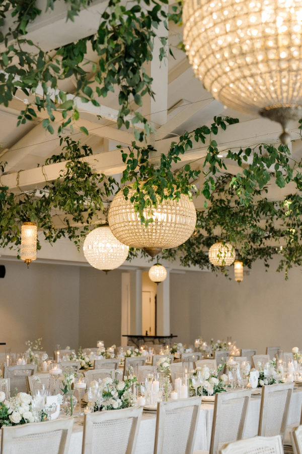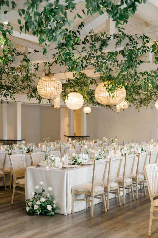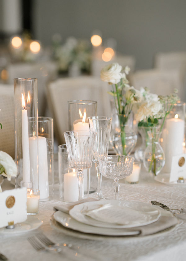 [field title=”Florals & Decor”]Emerald City Flowers designed lush arrangements with a focus on layered neutrals and soft blush blooms, incorporating texture and movement through thoughtful floral selection. Tabletop styling was anchored by BBJ La Tavola linens, ribbed candles from Pennies Rentals, and elegant tableware from Cort Party Rental. Small chandeliers from Vintage Ambiance and large chandeliers from Noble Rentals added a romantic glow, while custom signage from Honest Calligraphy and On the Wall Design Studio tied the entire design story together.[/field]
