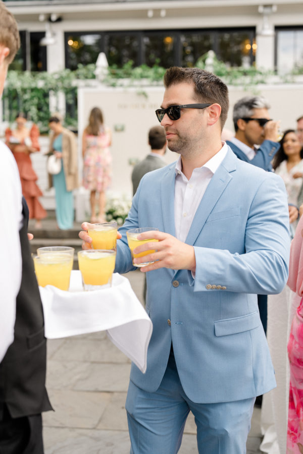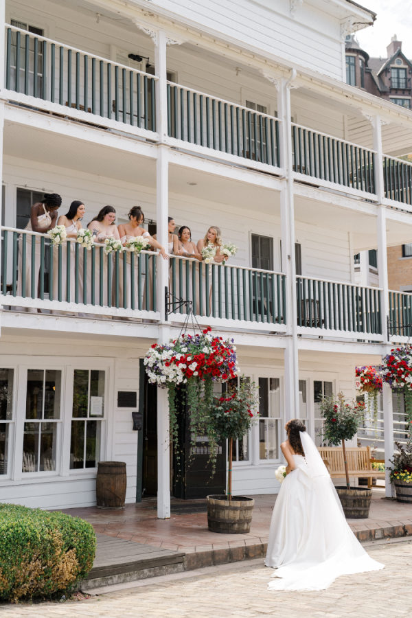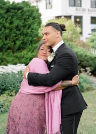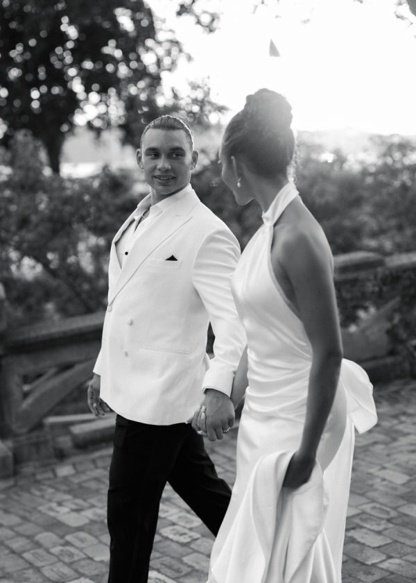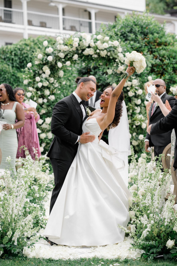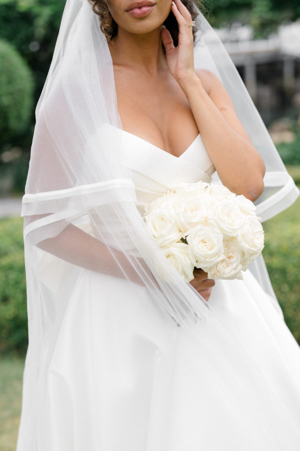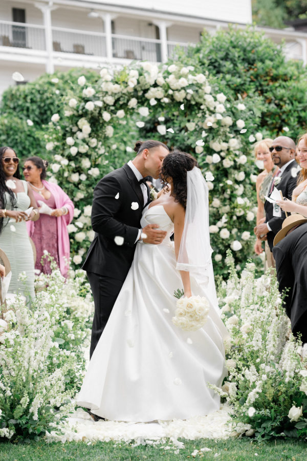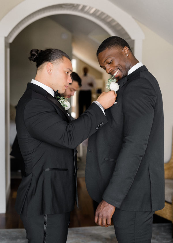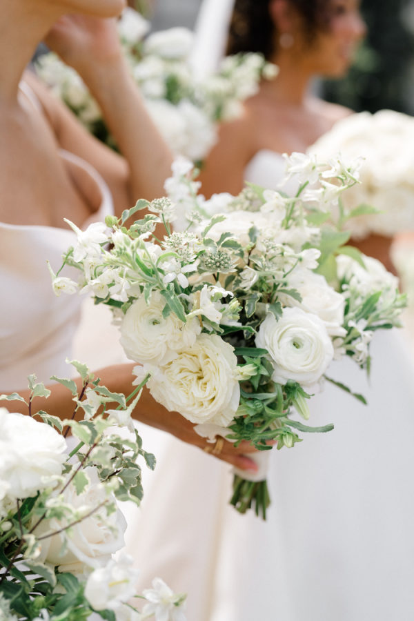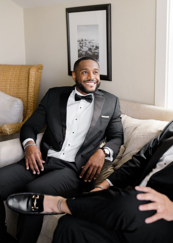 The groomsmen were dressed in classic black tuxedos with crisp white shirts and traditional black bow ties, perfectly in step with the formal yet understated elegance of the day. The styling was minimal and timeless, complementing the bridal party without overpowering the overall aesthetic. The Groom wore a custom tuxedo by Robbie & Co. in NYC. He had their wedding date embroidered on his cuffs and his and her new last name, “York,” sewn into his suit lining, a special homage to his step-dad, who raised him.