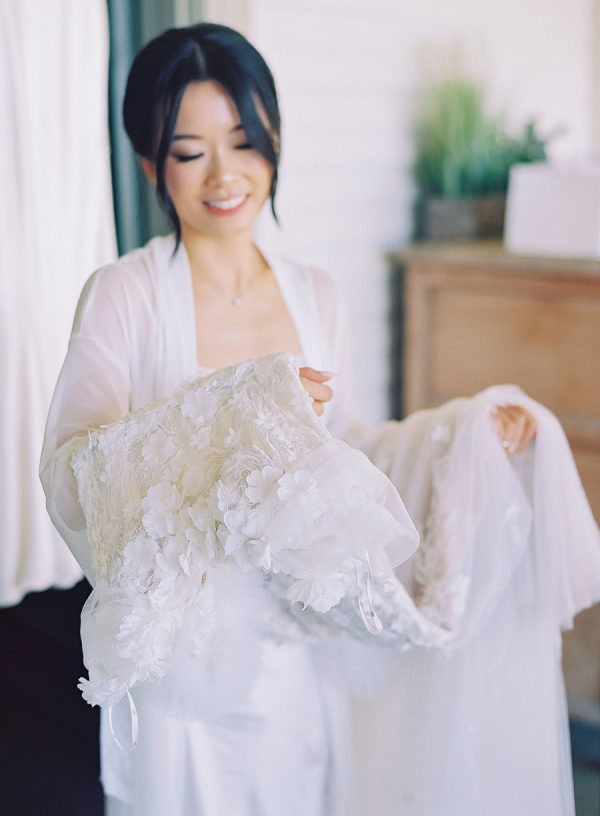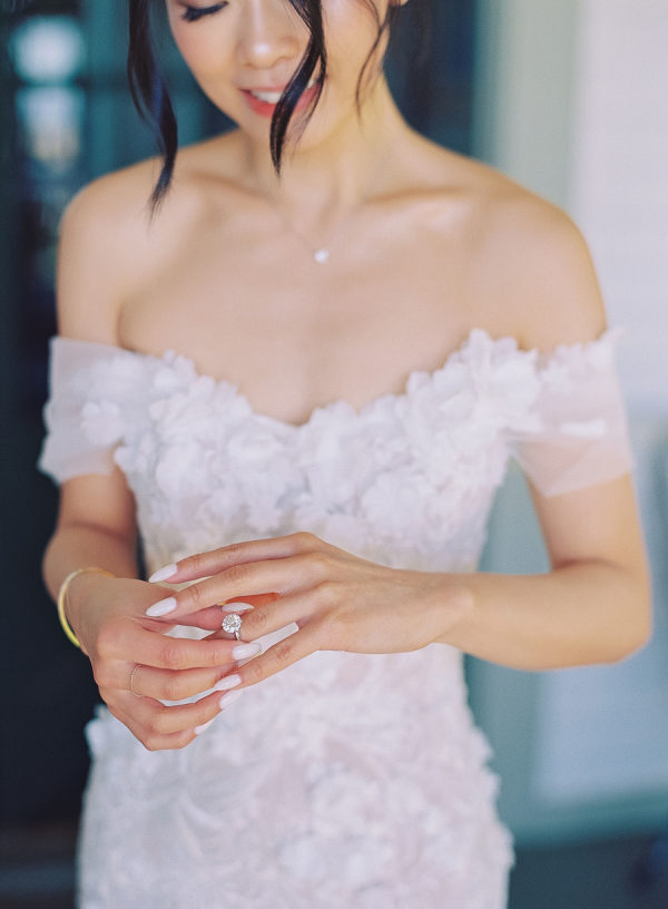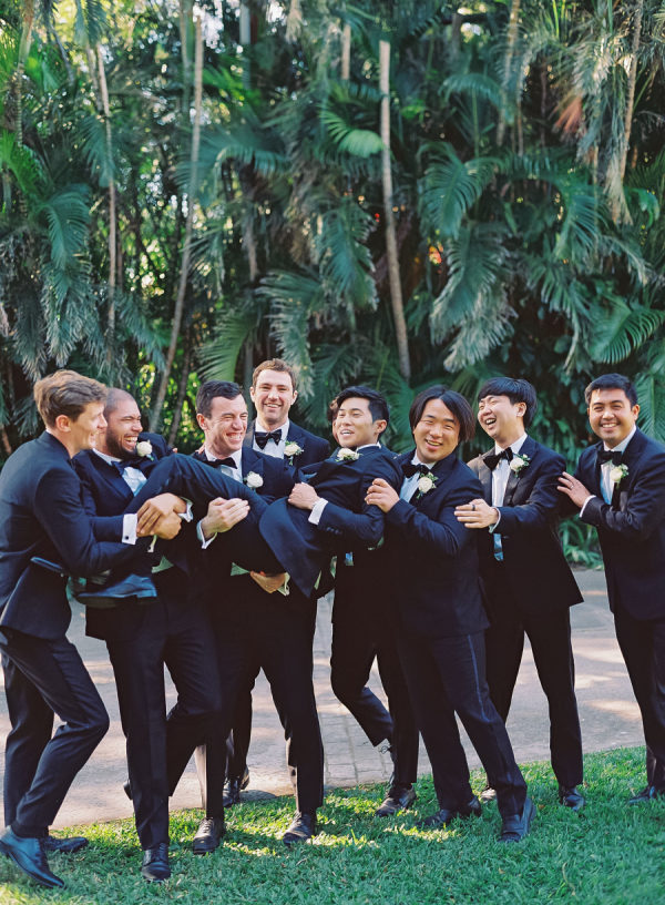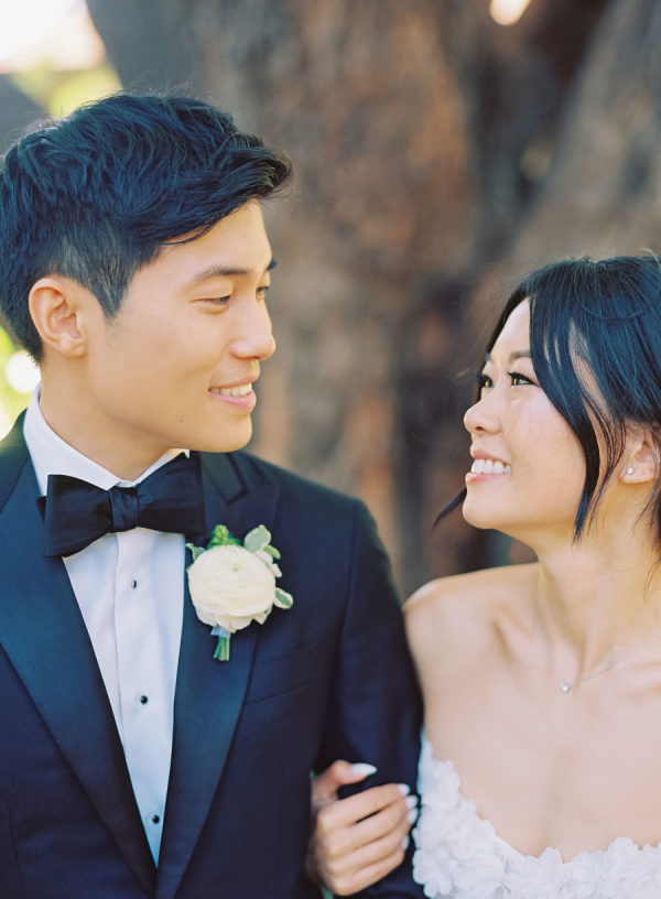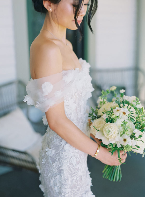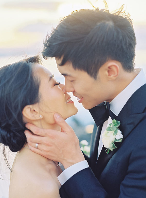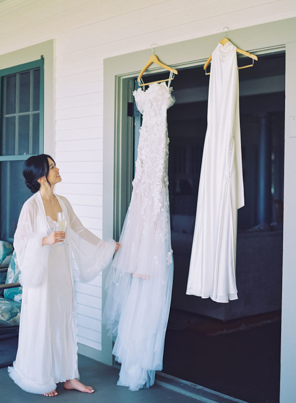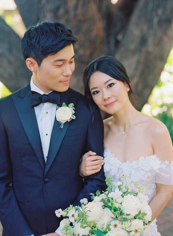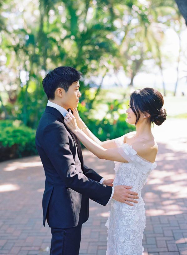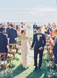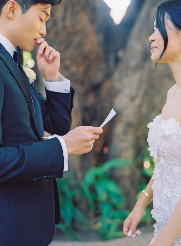 Nancy was the picture of timeless grace in her Dany Tabet gown, with delicate detailing that shimmered beneath Maui’s golden light. Michael turned heads in a custom Enzo tuxedo — the wedding date embroidered inside the collar, a secret detail only he and Nancy shared until now. After the ceremony, Nancy slipped into a silky Sau Lee number for the evening’s festivities, looking effortlessly radiant during their dreamy first dance at sunset.