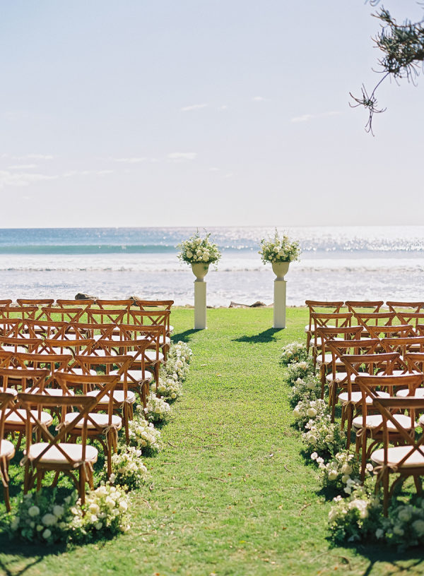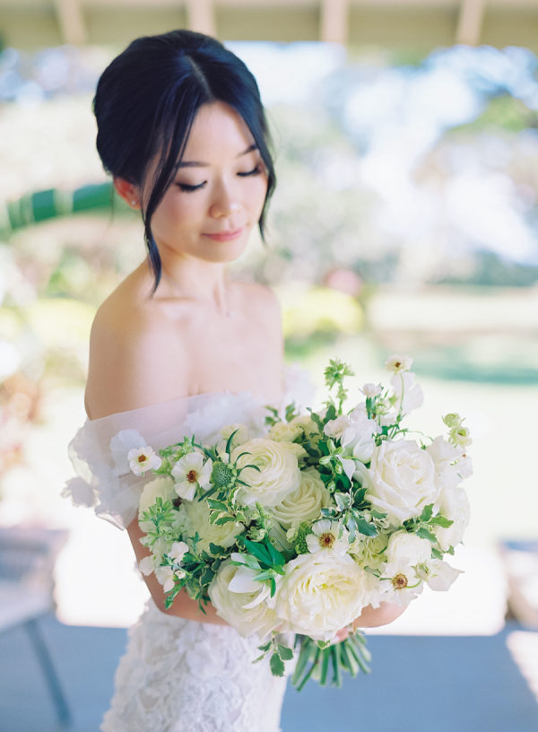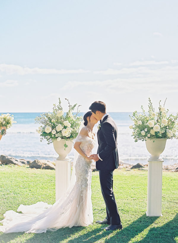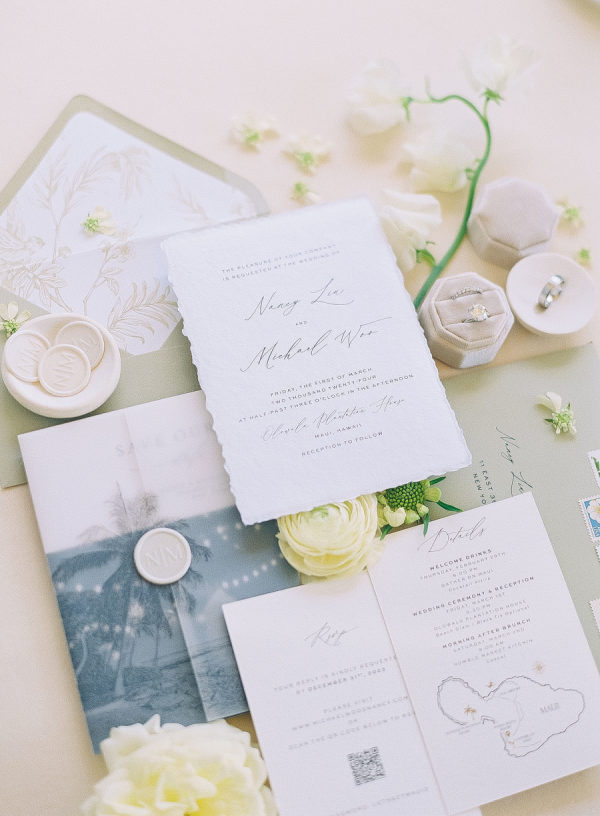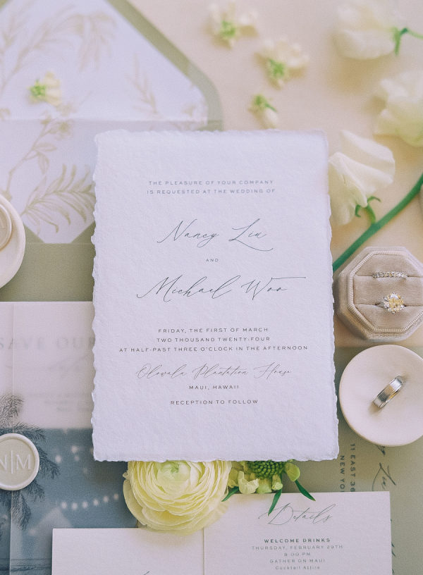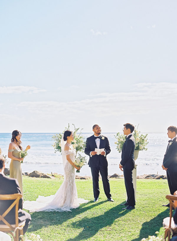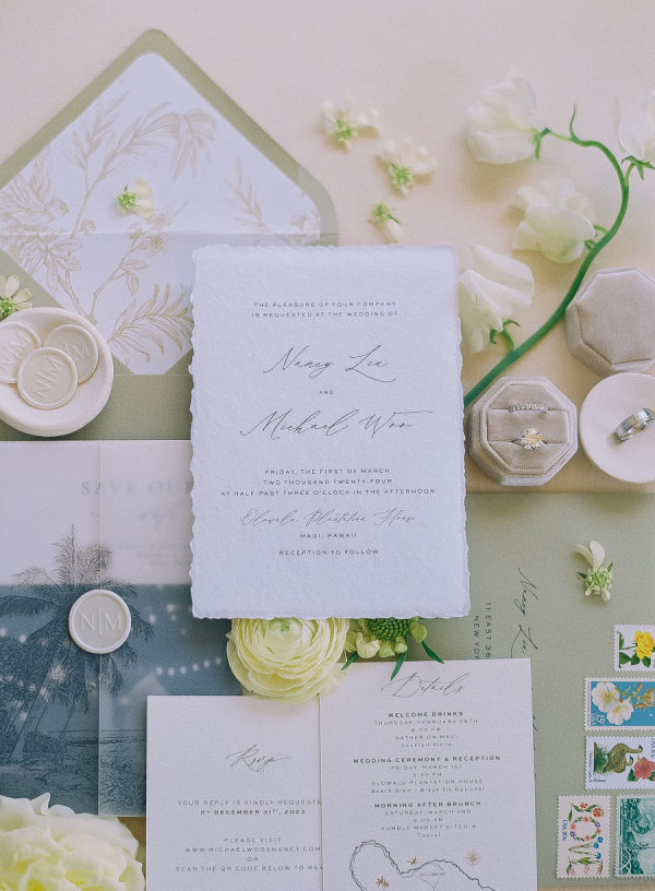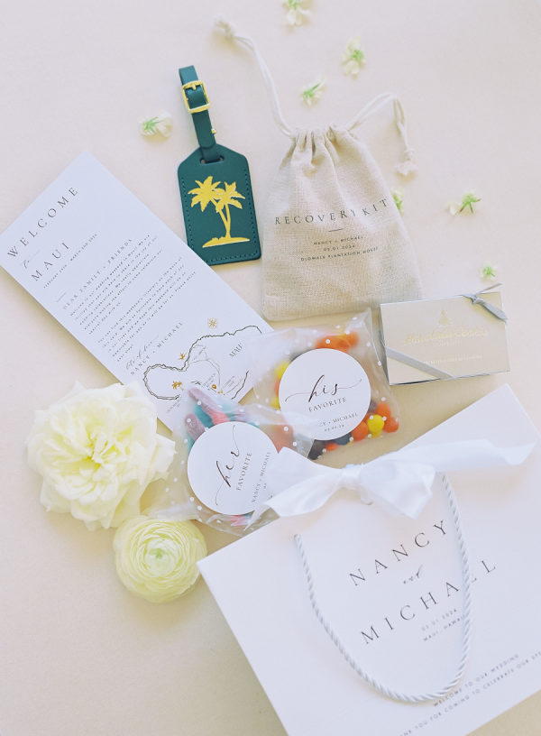 Nancy and Michael’s wedding weekend at the Olowalu Plantation House in Maui was a masterclass in destination wedding perfection. With a design vision rooted in elegance and a celebration infused with heartfelt detail, their love story unfolded over a weekend that guests will be talking about for years to come. From the outset, the couple set out to create an atmosphere that blended elevated island charm with personal warmth. The color palette — ivory, sage, deep green, and hints of gold — provided a timeless foundation for a weekend of joy, while every design decision was made with guest experience top of mind. From the heartfelt welcome bags to a refreshingly unexpected coconut-chopping station, Nancy and Michael thoughtfully curated every moment.