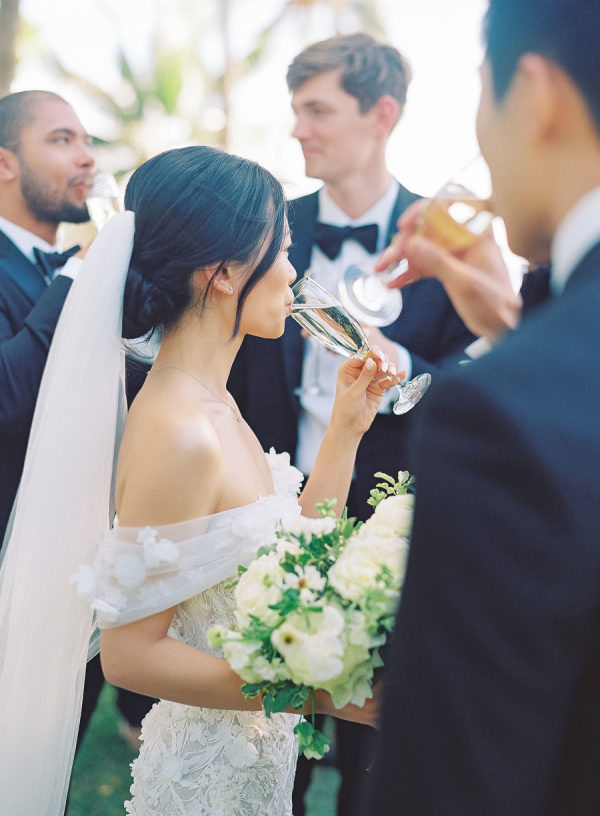 [field title=”Food & Drink”]True to their love for food and flavor, Nancy and Michael ensured every guest left full and happy. The culinary experience was a highlight, featuring vibrant island-inspired appetizers during cocktail hour and a selection of carefully curated entrees. Signature cocktails — the Empress Spritz and the cheeky Mike-Tai — flowed from a double white bar that became the stylish hub of the night.