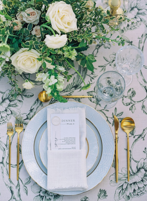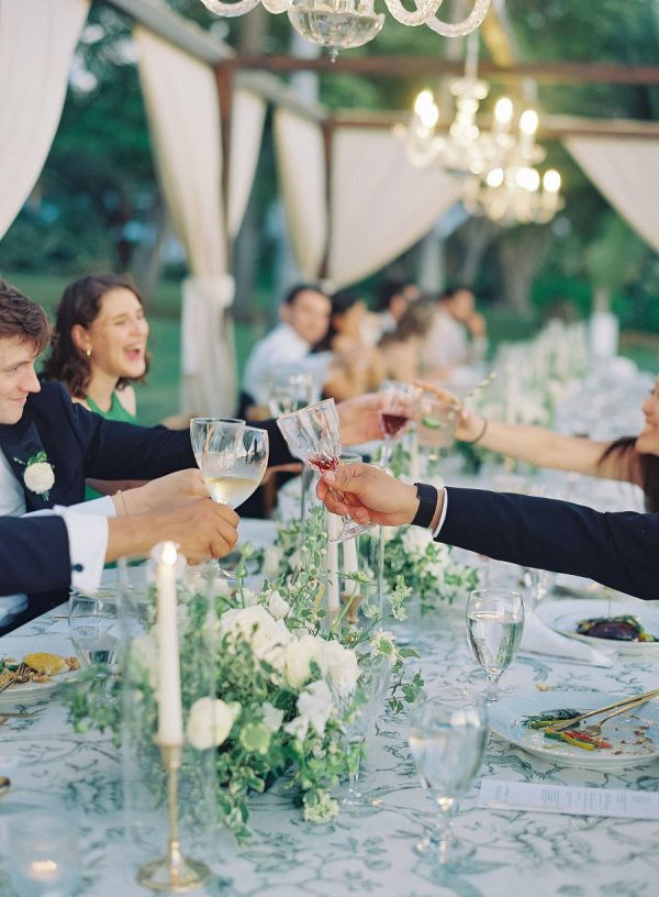 Floral arrangements echoed the venue’s natural beauty, enhancing without overwhelming. Greenery and neutral-toned blooms created an organic elegance, particularly stunning under the reception’s dark canopy — draped in ivory fabrics, strung with chandeliers, and accented by cascading foliage. Chinoiserie linens at the head and guest tables added a bold, beautiful layer of visual interest, while a square table layout kept energy and conversation flowing effortlessly around the dance floor.