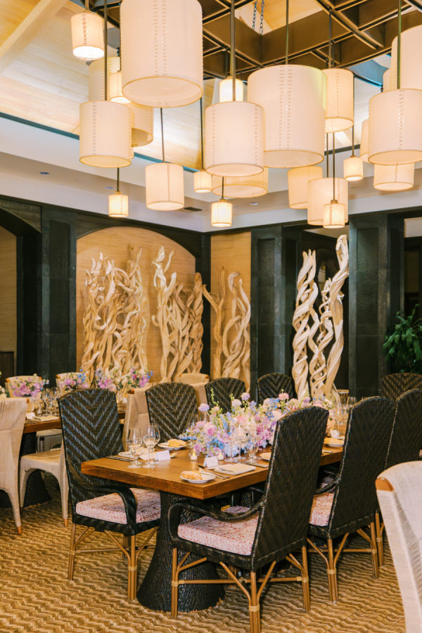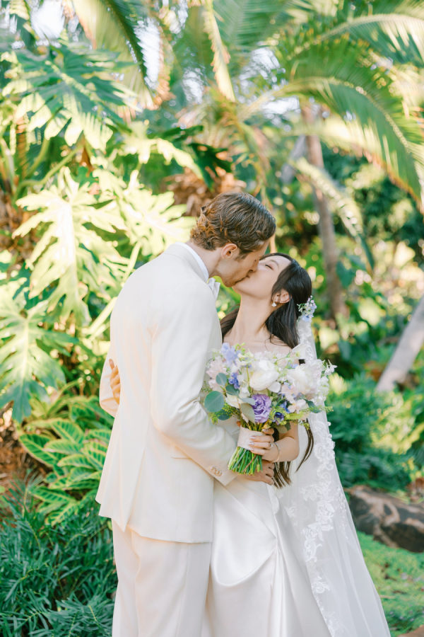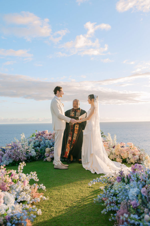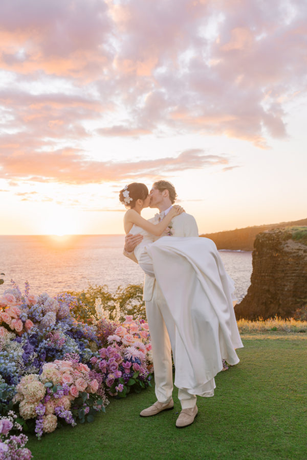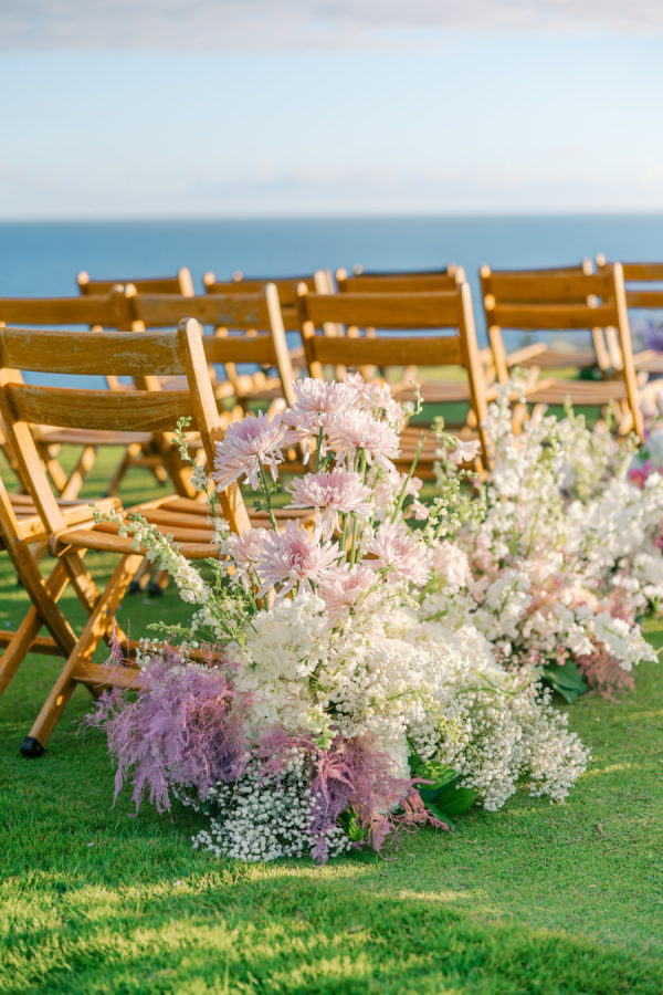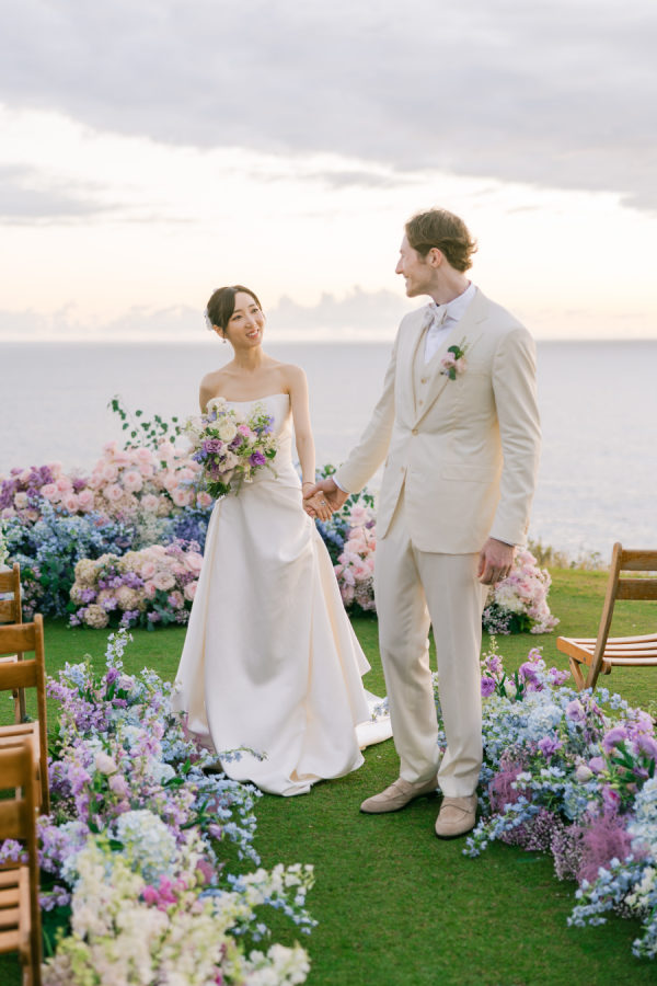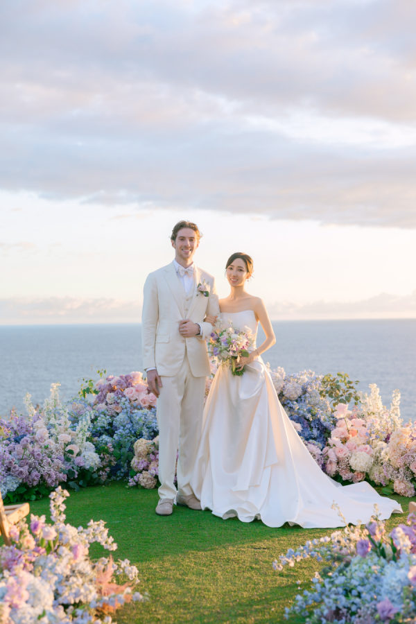 The floral design by Design by Hermingway was a breathtaking expression of color and romance—anchored in soft lavender tones yet infused with joyful, vibrant accents. From the bride’s bouquet to the ceremony arch, the florals embraced a painterly mix of lilac, blush, buttercream, and hints of peach and coral, creating a palette that felt both whimsical and refined. The design masterfully balanced garden-inspired lushness with island charm, allowing each bloom to shine while harmonizing with the natural beauty of Lanai. Set against swaying palms and ocean views, the florals brought the entire celebration to life with elegance, energy, and an undeniable sense of magic.