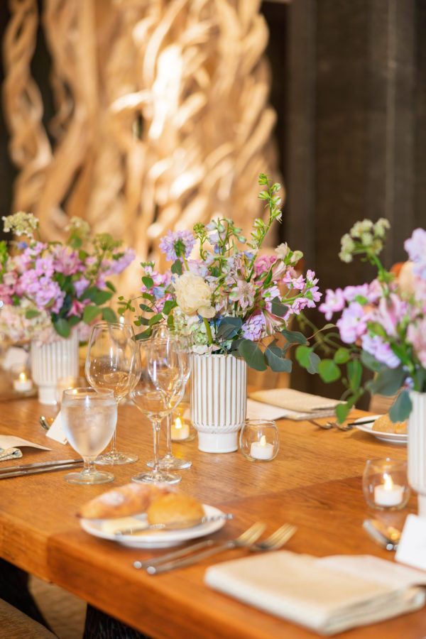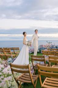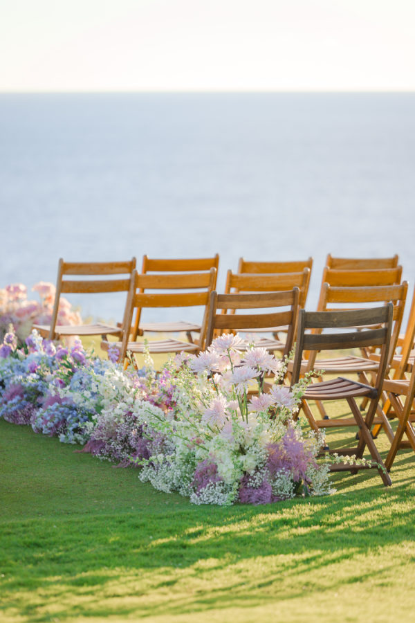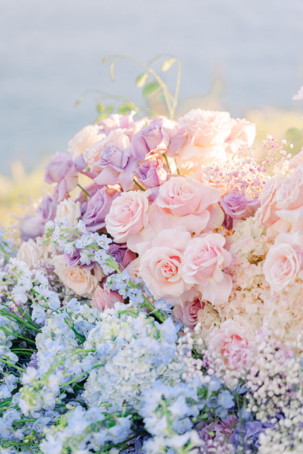 The floral design by Designs by Hemingway was a stunning celebration of color and romance. Anchored in soft lavender and lilac tones, the arrangements were accented with blush, buttercream, peach, and coral to create a painterly effect. From the bride’s bouquet to the ceremony arch and tablescapes, every detail balanced lush garden inspiration with the relaxed elegance of the island. The florals felt organic, breezy, and harmoniously blended with the surrounding cliffs and ocean views.