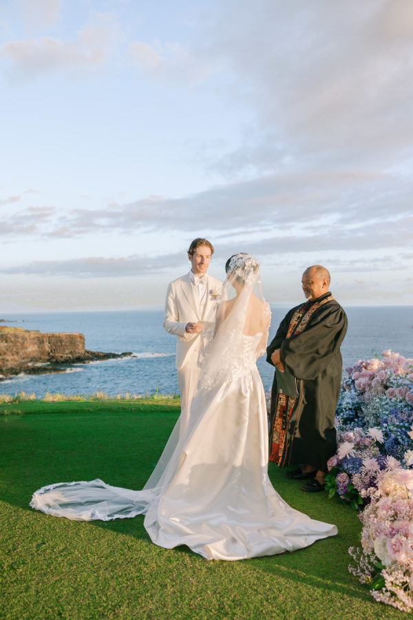 The ceremony began with a powerful Hawaiian tradition: the officiant blew a pū (conch shell) to announce the beginning of the sacred moment. The sound echoed across the cliffs and ocean, creating a sense of reverence and connection to the land. Two musicians performed live ukulele music throughout the ceremony, with gentle Hawaiian melodies underscoring the couple’s vows and first kiss. This blend of music, nature, and tradition brought an authentic cultural depth to the entire experience.