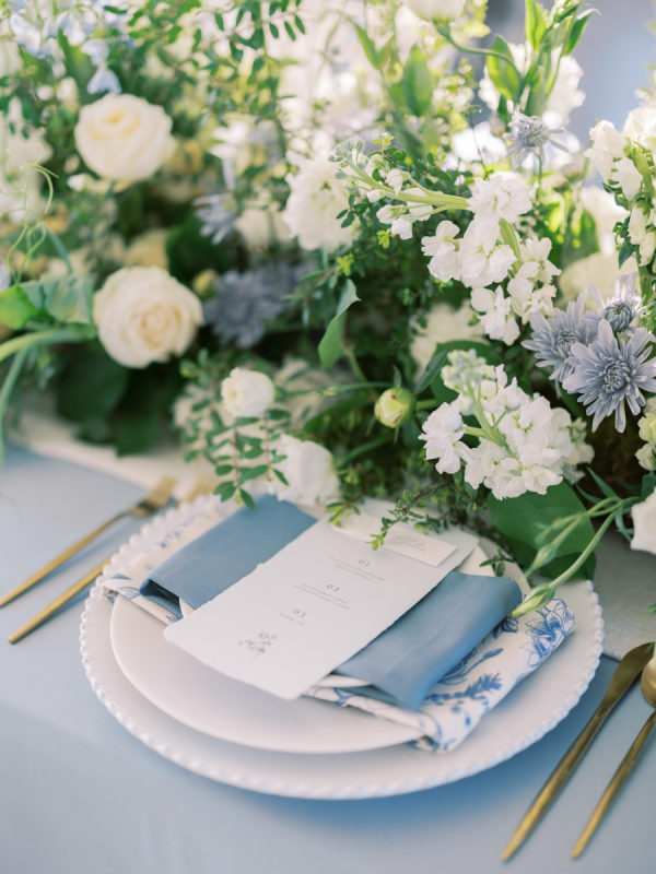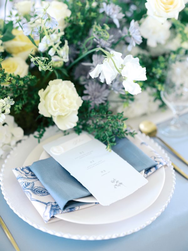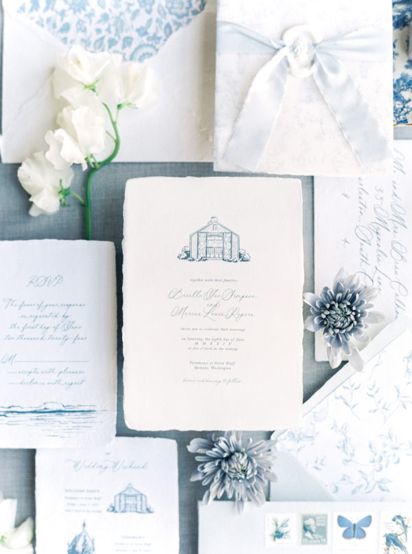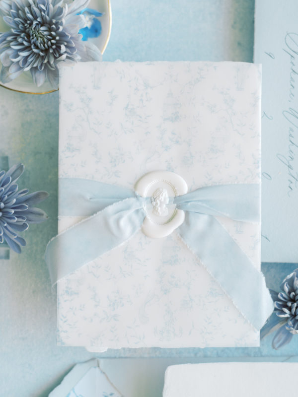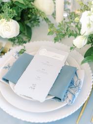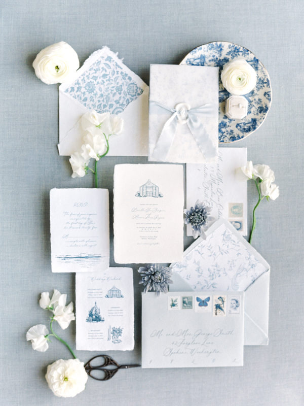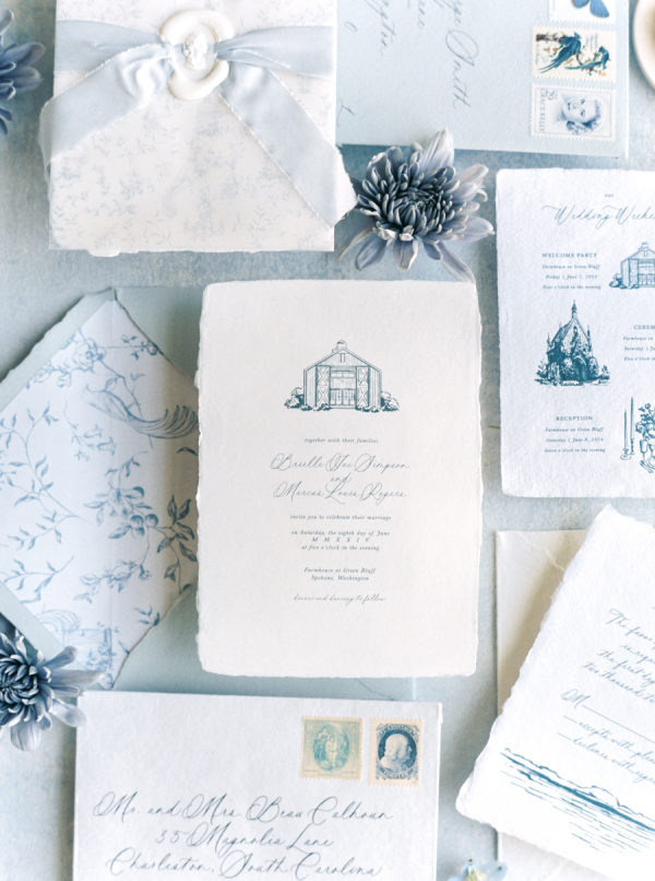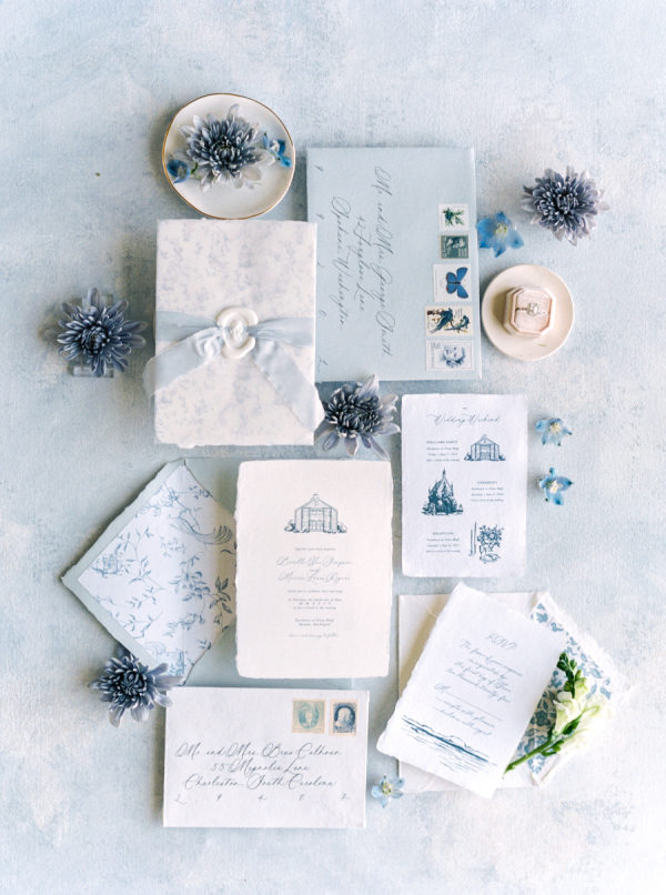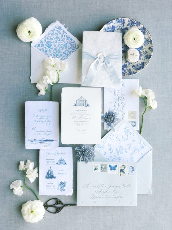 This styled shoot was our take on a modern, French-inspired wedding—where timeless elegance meets contemporary romance. Soft, layered shades of blue set the tone, from the delicate toile envelope liners to the refined tablescape and floral details. Every element was thoughtfully curated to blend the effortless charm of the French countryside with a modern, elevated aesthetic. The result is a dreamy, romantic celebration that feels both classic and fresh, perfect for the couple who craves sophistication with a touch of whimsy.