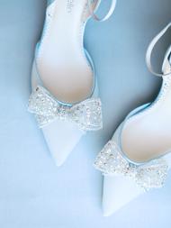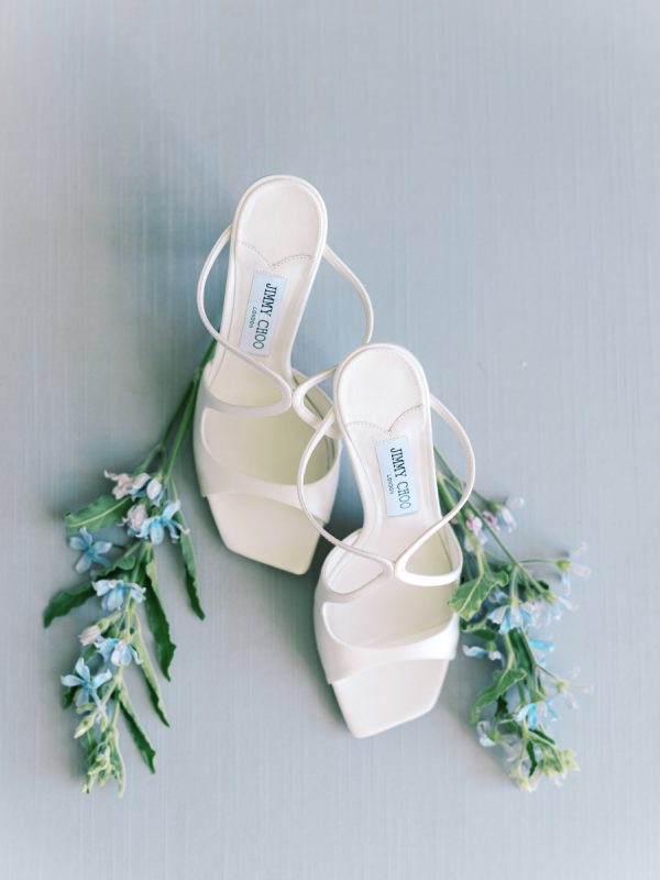 Bridesmaids wore dainty blue dresses with floral and lace textures, which perfectly threaded the elegance of the day throughout all aspects. Exquisite shoes from Bella Belle and Jimmy Choo.