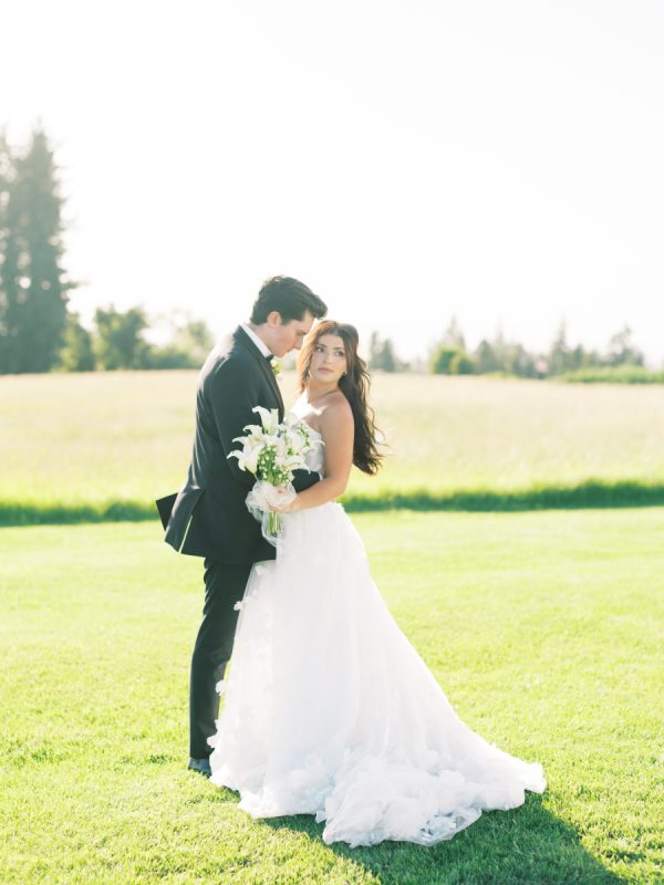All three gowns and suits are from Roselily Bridal and Tuxedo in Richland, WA. When choosing gowns for the shoot, we were inspired by traditional French toile lace designs and the simplistic elegance of the French countryside. Derrick Marie by Maggie Sottero is a stunning floral jacquard ball gown, which is truly the perfect gown for a modern bride wanting sophistication and something unique. Alton by Eleanor Rose from Roselily’s personal collection is a sleek, fitted gown with gorgeous seamwork and clean, purposeful lines, combining romanticism and elegance. Laila by Maggie Sottero is a strapless a-line gown with scattered 3D florals, which gives the dress the perfect feel of a timeless garden party.