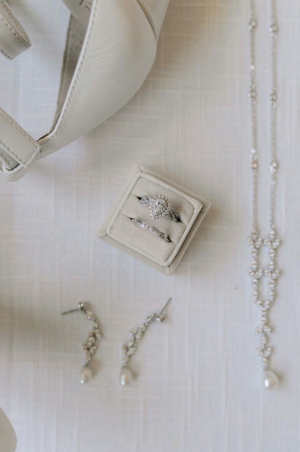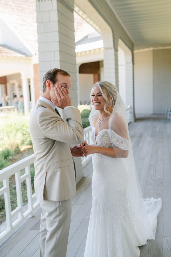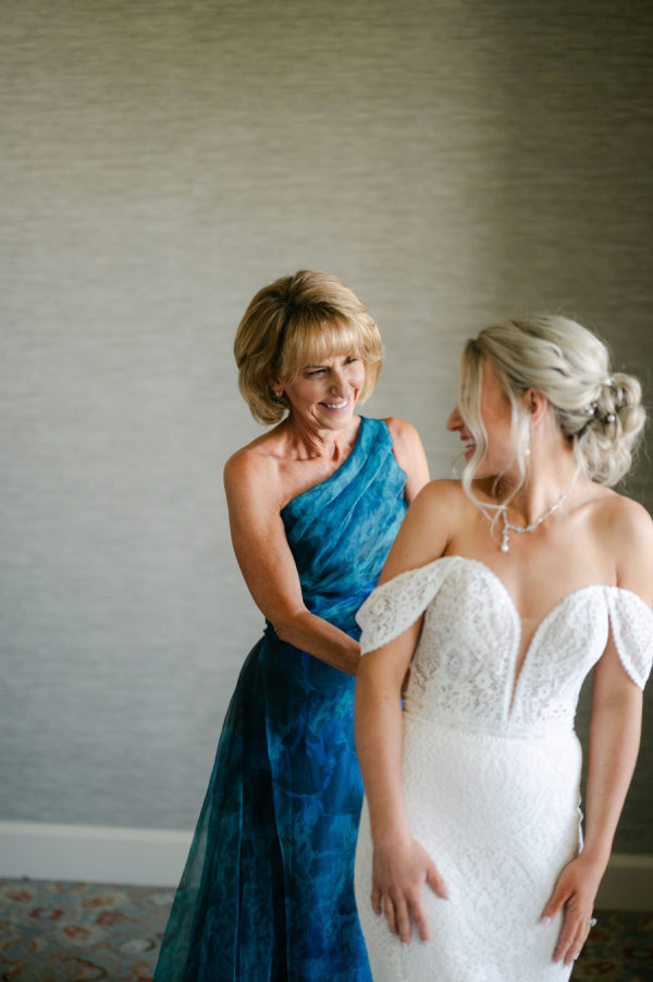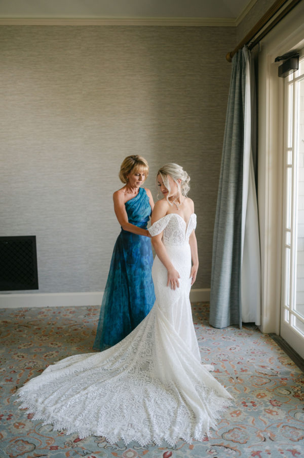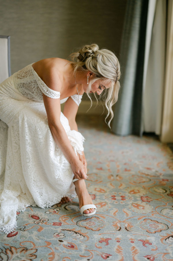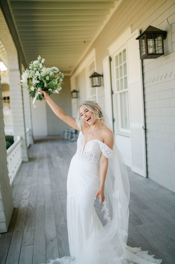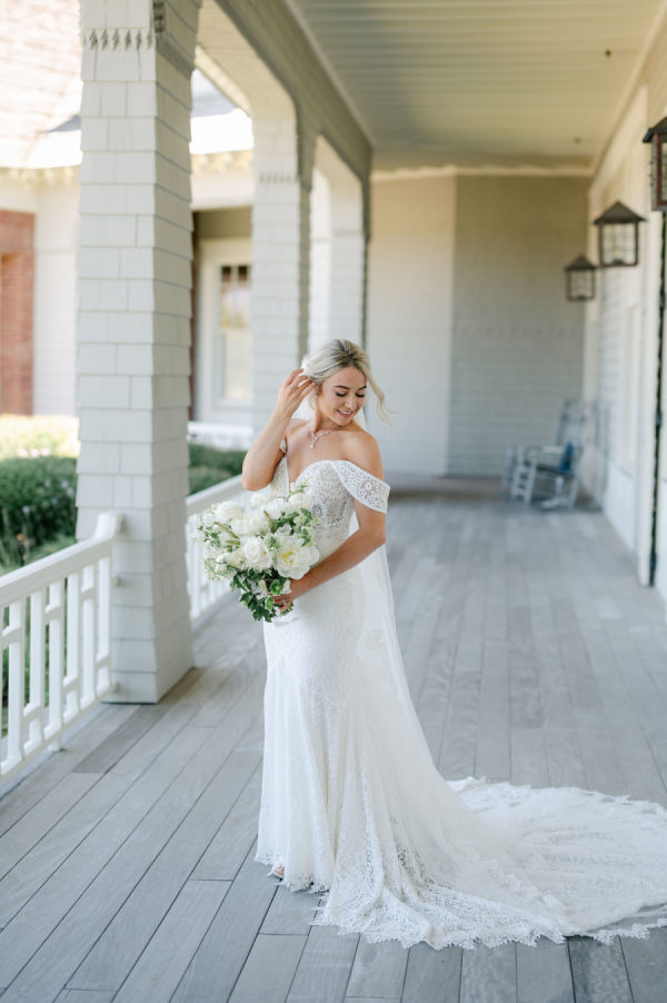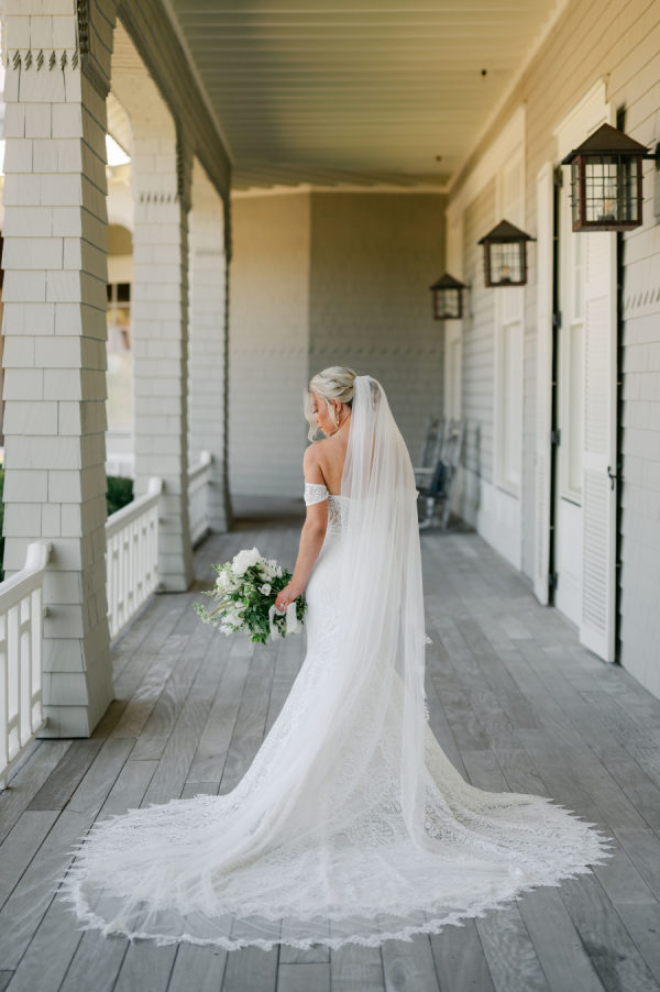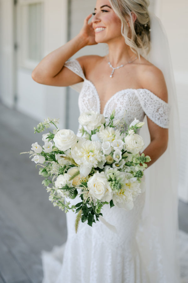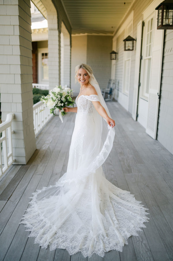 Katie’s wedding gown was the perfect blend of timeless and boho. Intricate lace detail, off-the-shoulder straps, and a stunning cathedral veil came together to create a stunning bridal look.