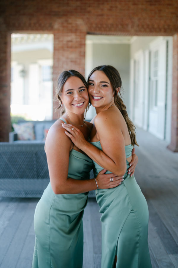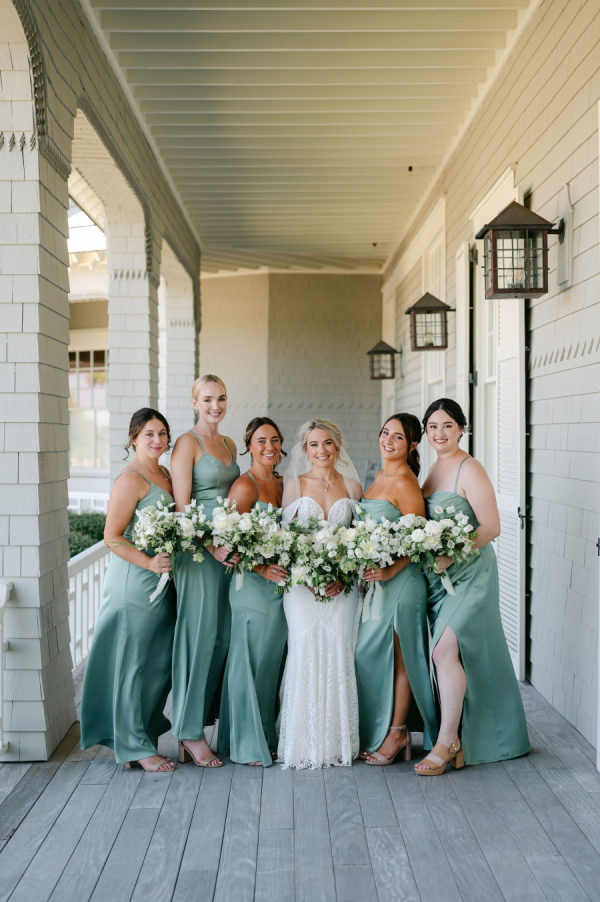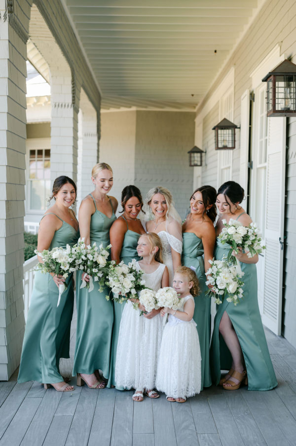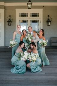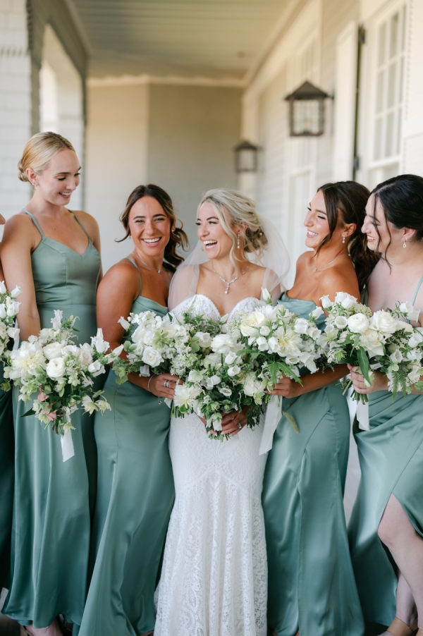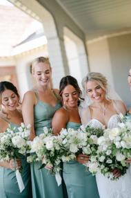 All the bridesmaids wore beautiful matching sage green full length satin gowns.