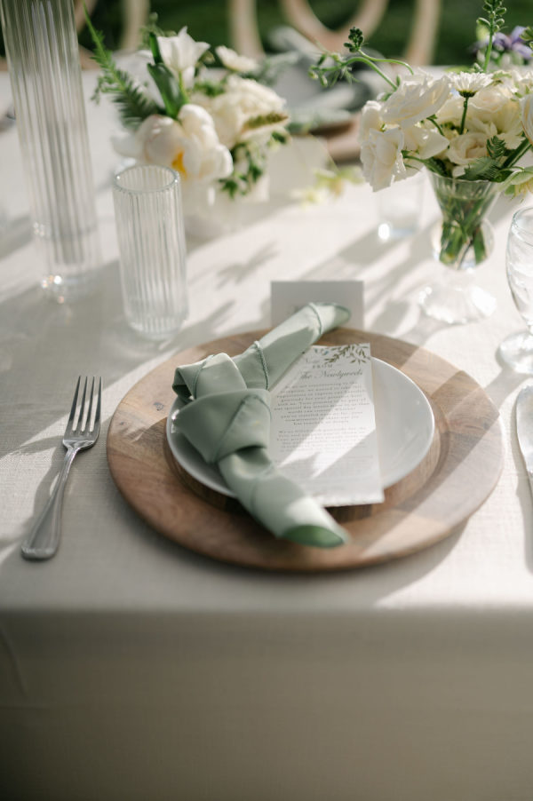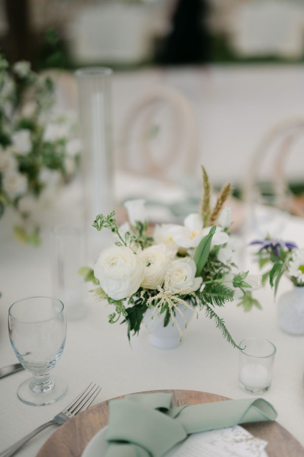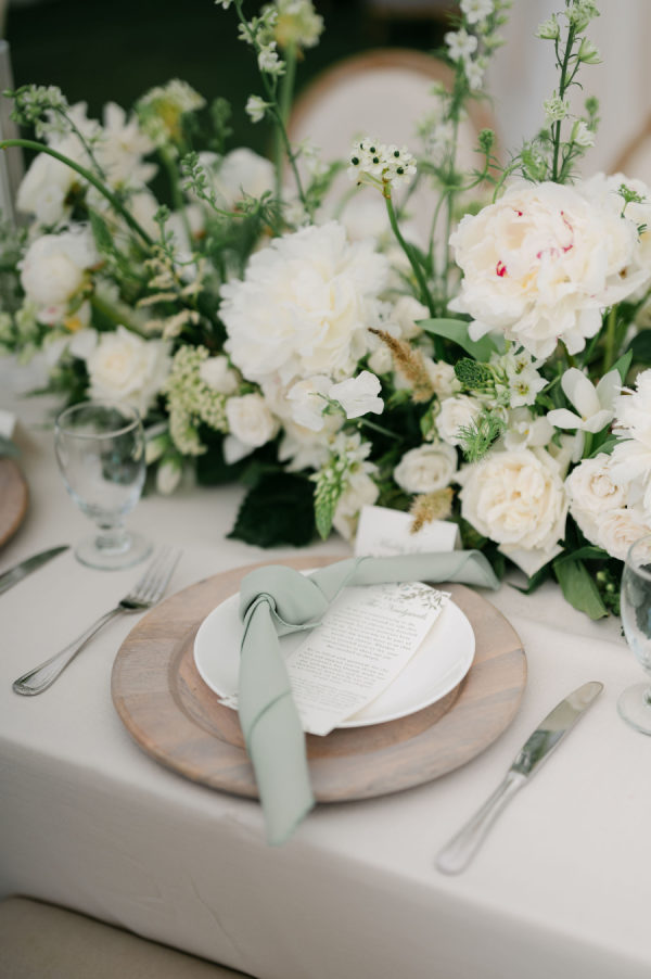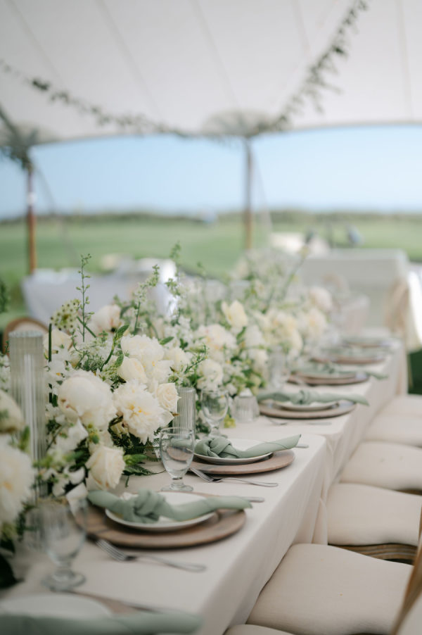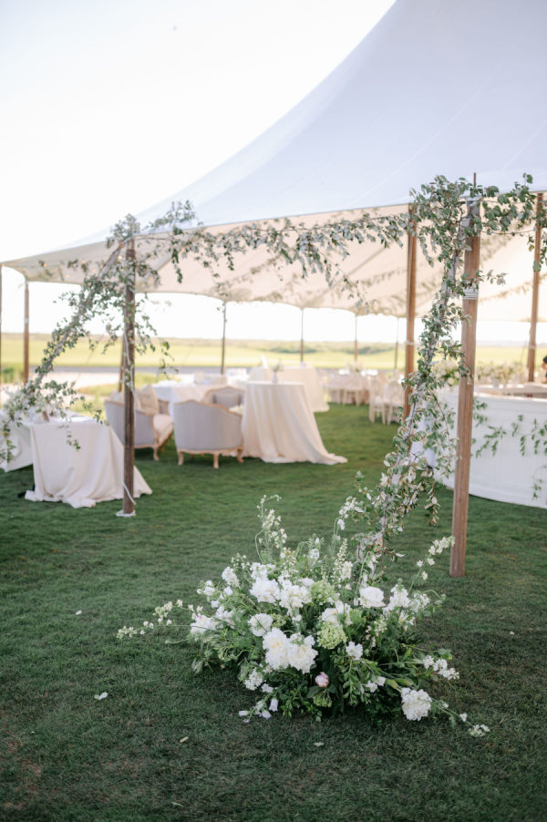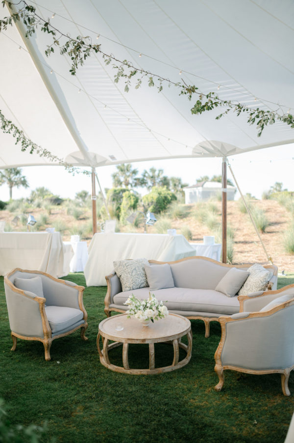 Classic white florals with pops of green filled the tent from floor to ceiling. Cream linens, wooden chargers, and candles lined every table. Couches and cozy chairs were there to relax on both during cocktail hour and the reception.