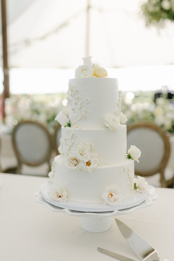 They had a traditional three-tiered wedding cake. White floral accents, along with intricate icing details, made for a classic design.