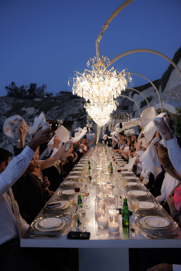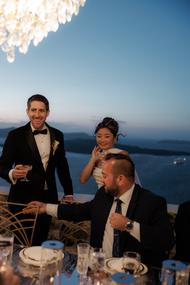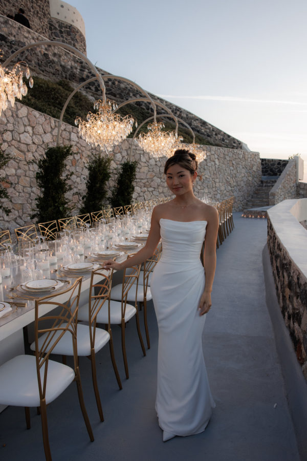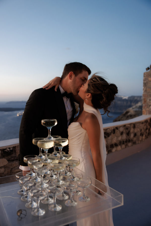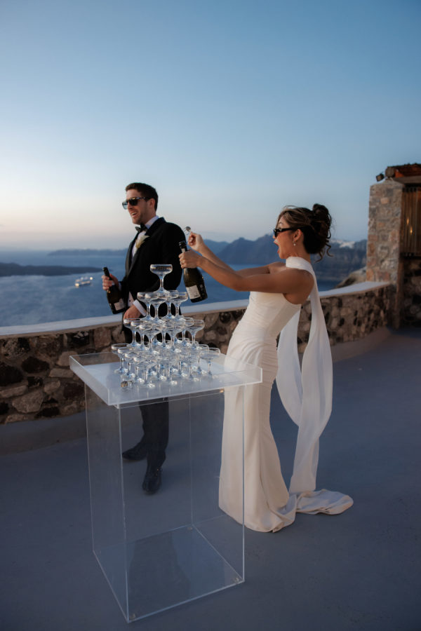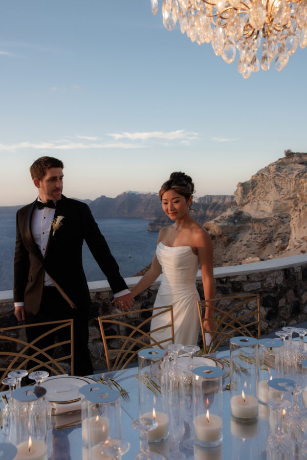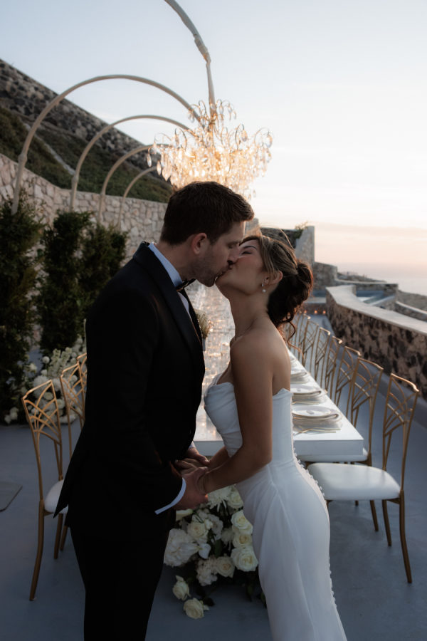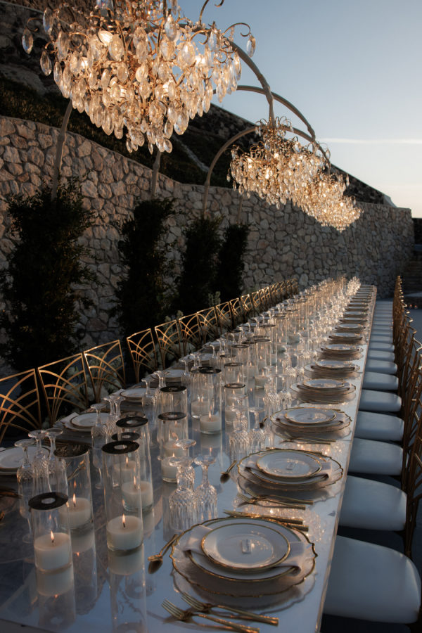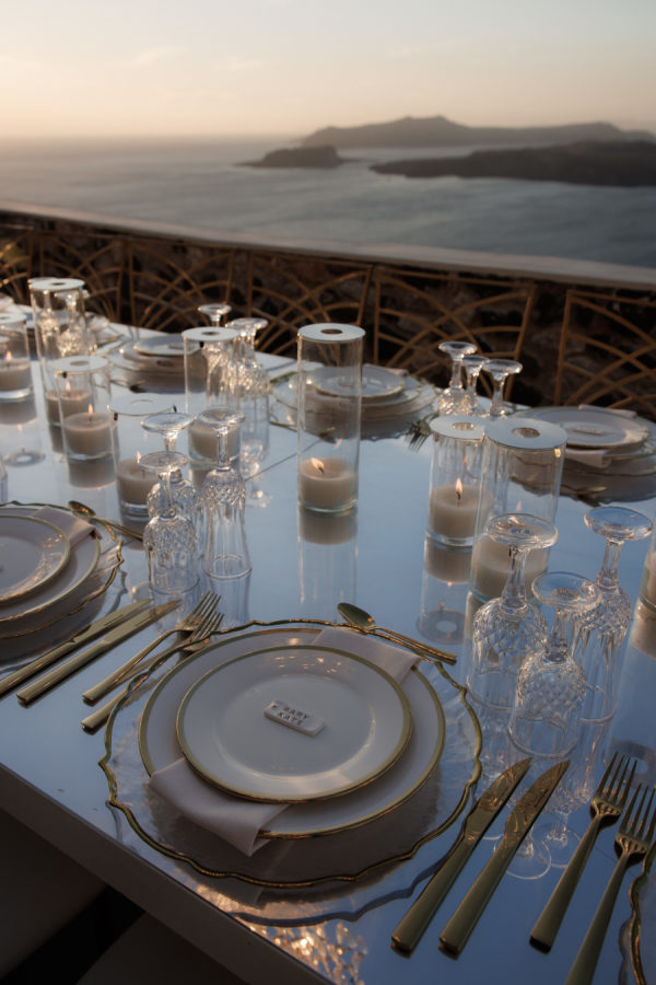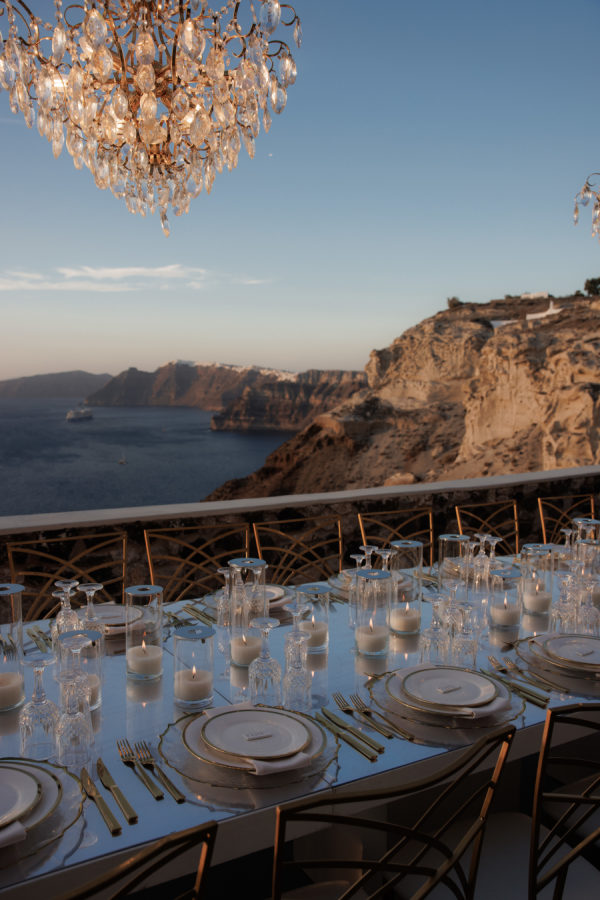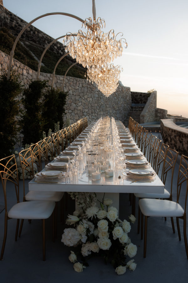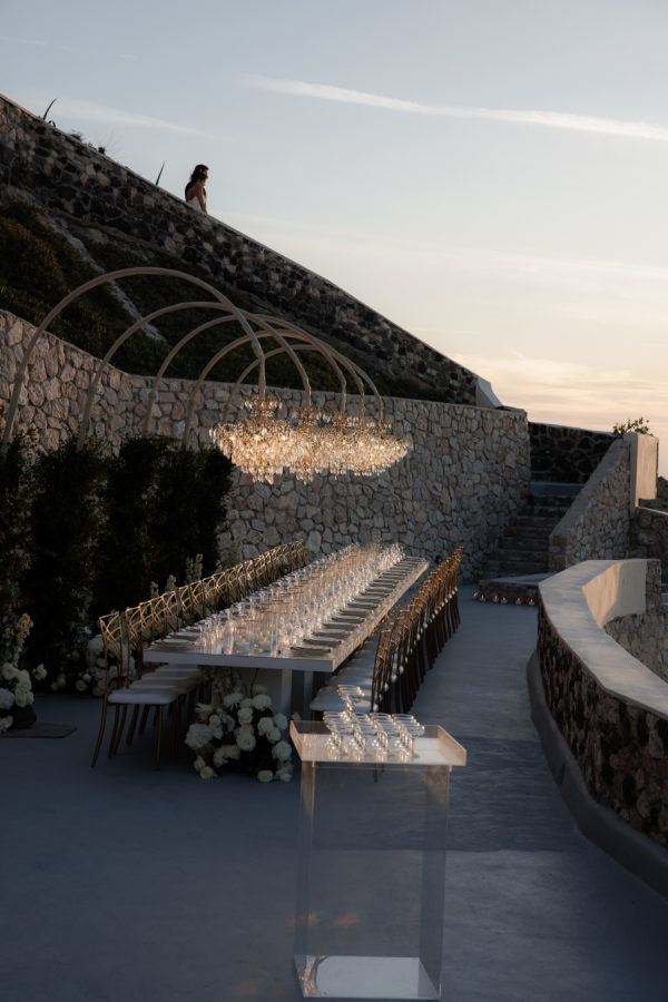 The soft evening light bathes everything in a warm glow, perfectly complementing the serene Santorini backdrop. The atmosphere feels romantic, intimate, and timeless — the ideal setting for a destination wedding celebration in Greece.