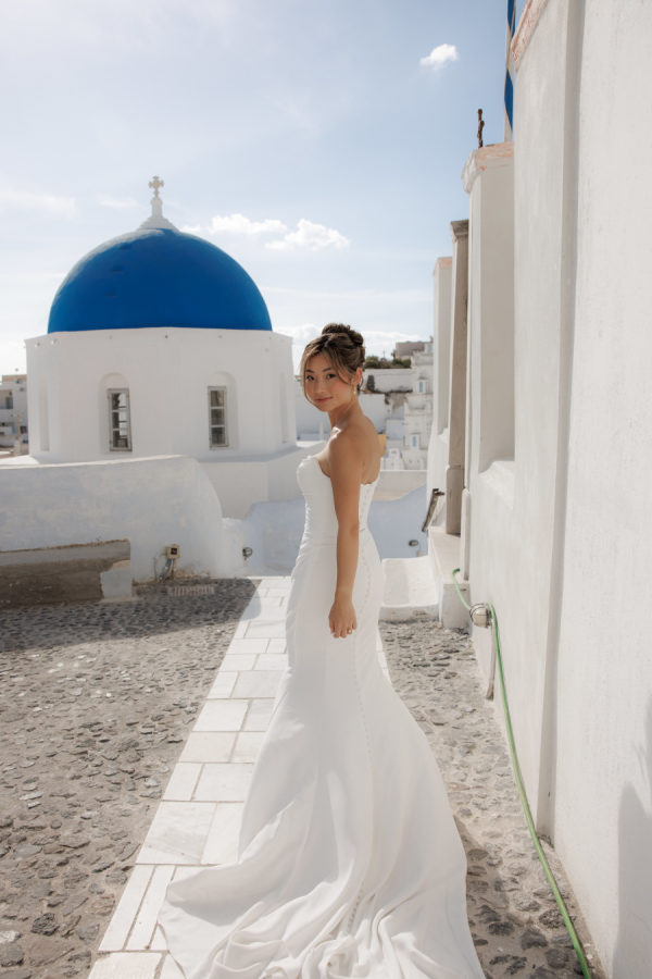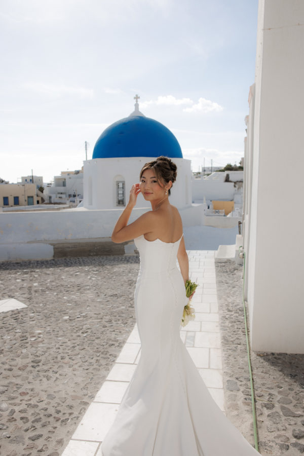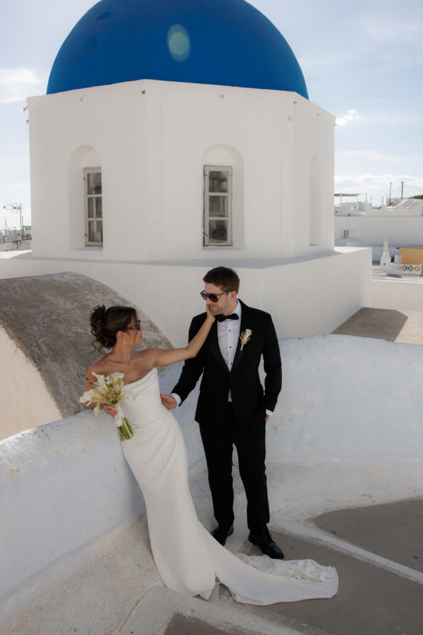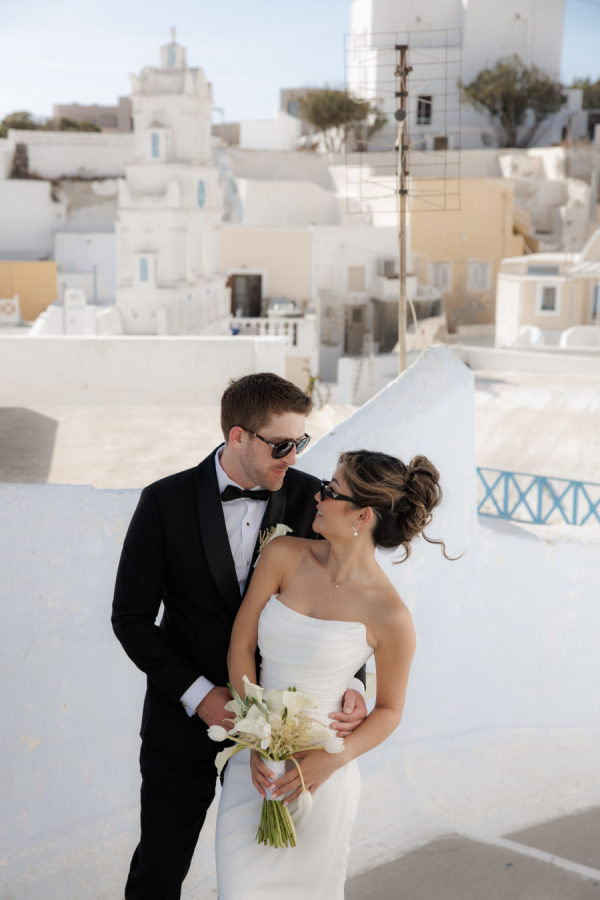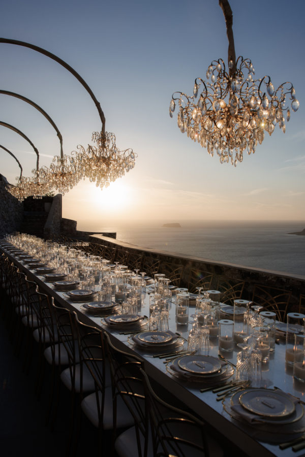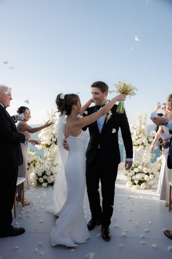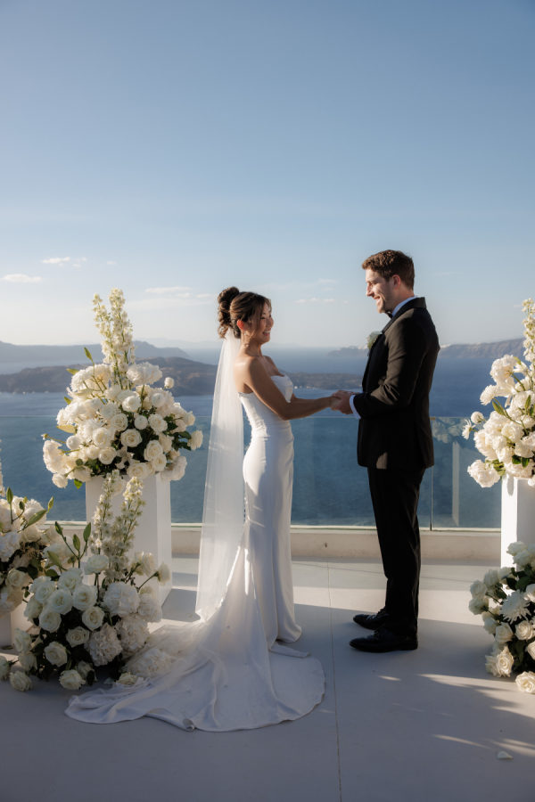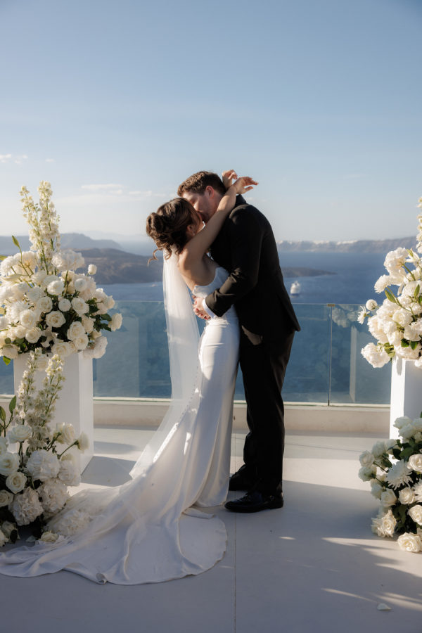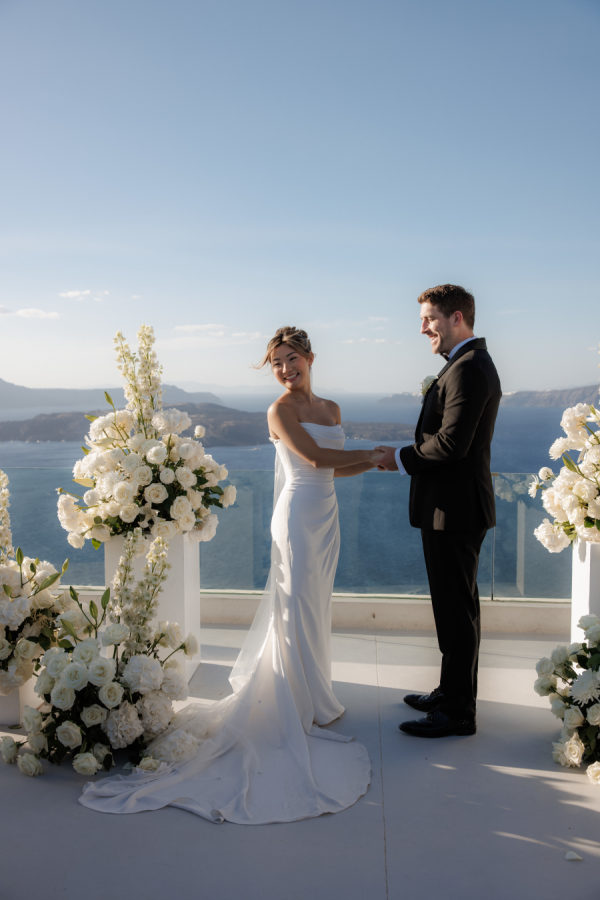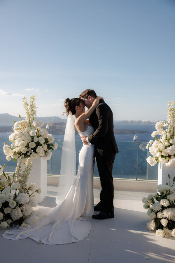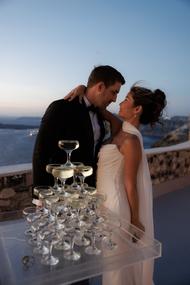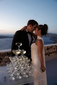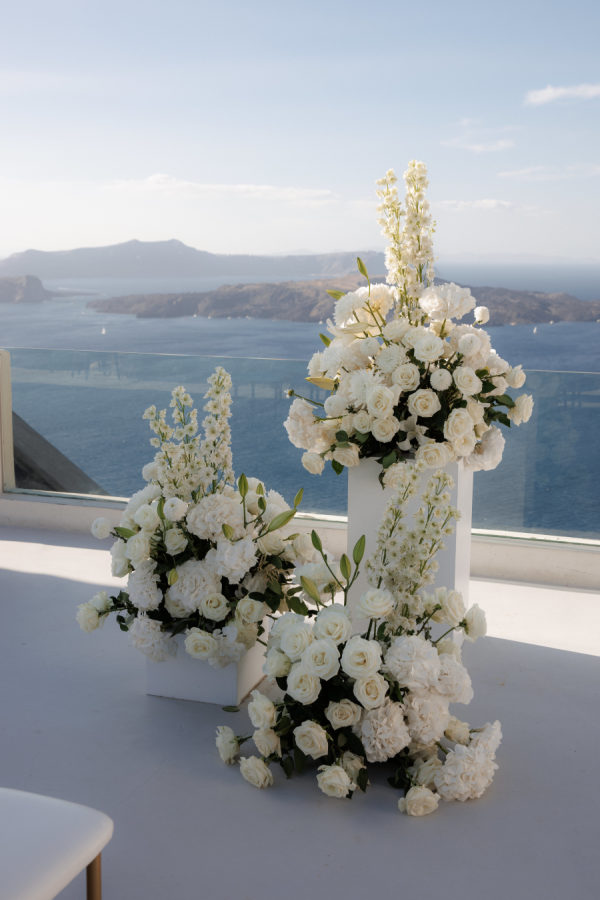 The soft evening light bathes everything in a warm glow, perfectly complementing the serene Santorini backdrop. The atmosphere feels romantic, intimate, and timeless — the ideal setting for a destination wedding celebration in Greece.