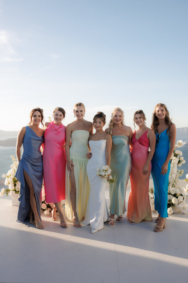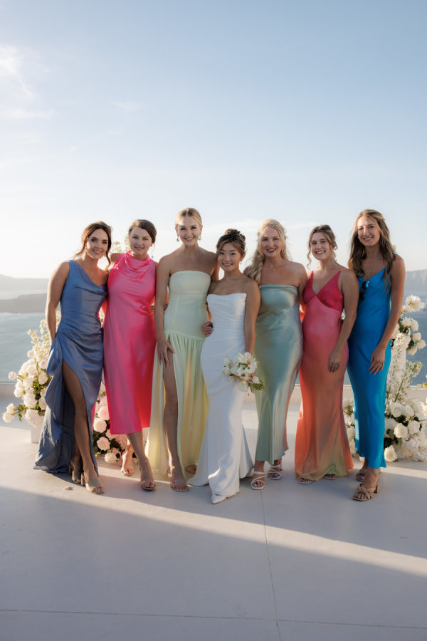 The bridesmaids didn’t wear traditional-style dresses, nor did they carry bouquets. The bridesmaids all wore their own dresses in pastel colours.