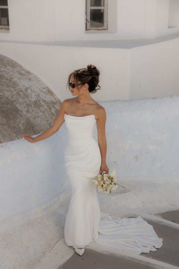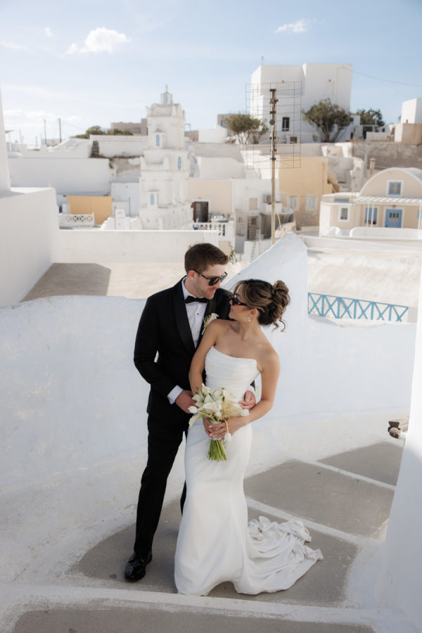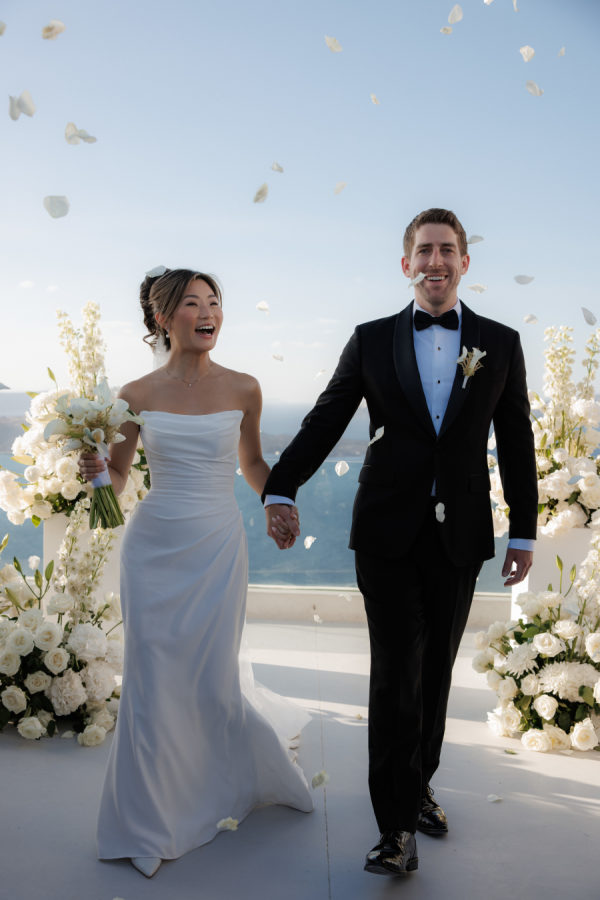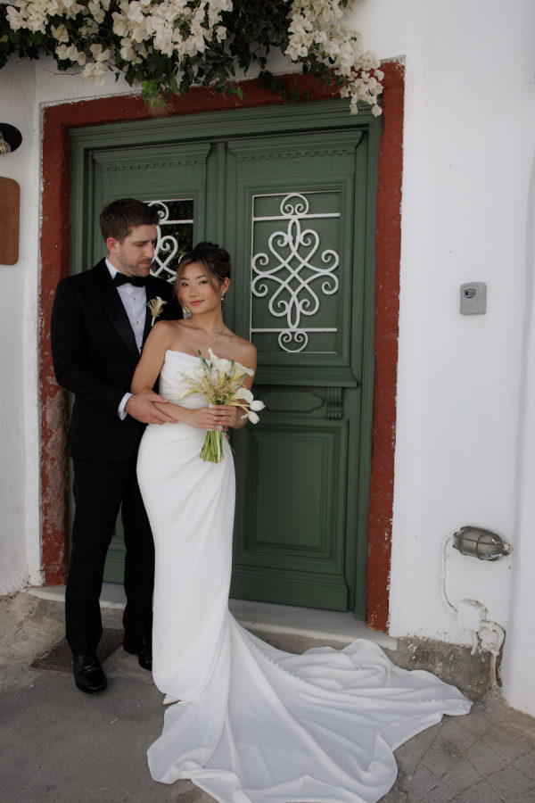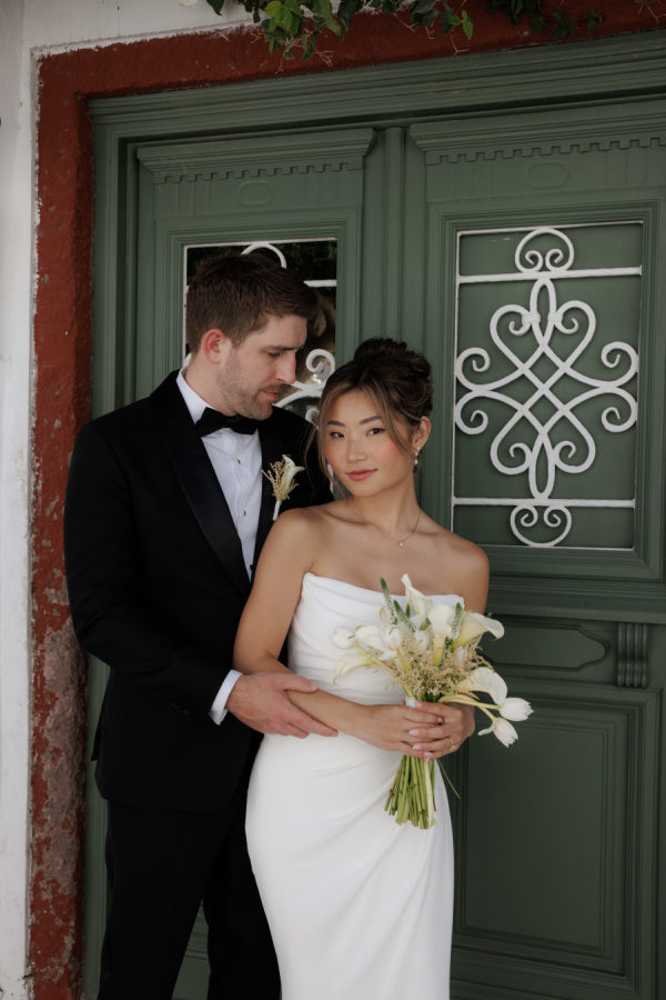 The bride is wearing a sleek, strapless white gown and later wore a unique neck scarf for her reception entrance, whilst the groom wore a classic black tuxedo accented with a boutonnière.
