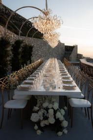 White and subtle greenery, using lilies, hydrangeas, roses, and delphiniums. The reception dinner was styled with white florals, glass candles, and gold-accented chairs, creating a luxurious yet minimal aesthetic. The stone wall and hanging chandeliers overhead enhance the ambiance, blending natural rustic charm with refined elegance.