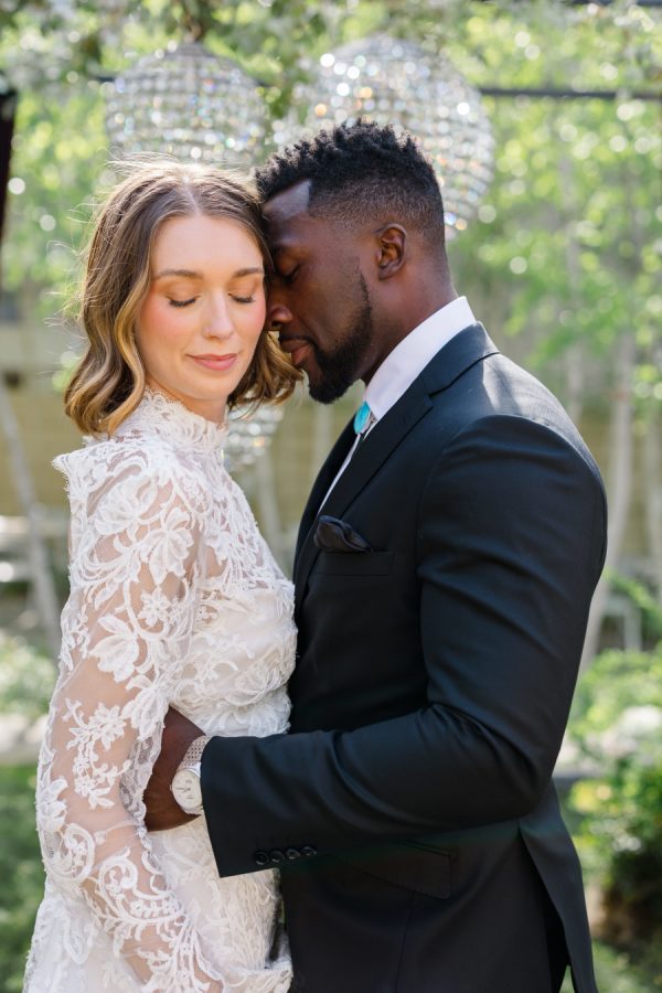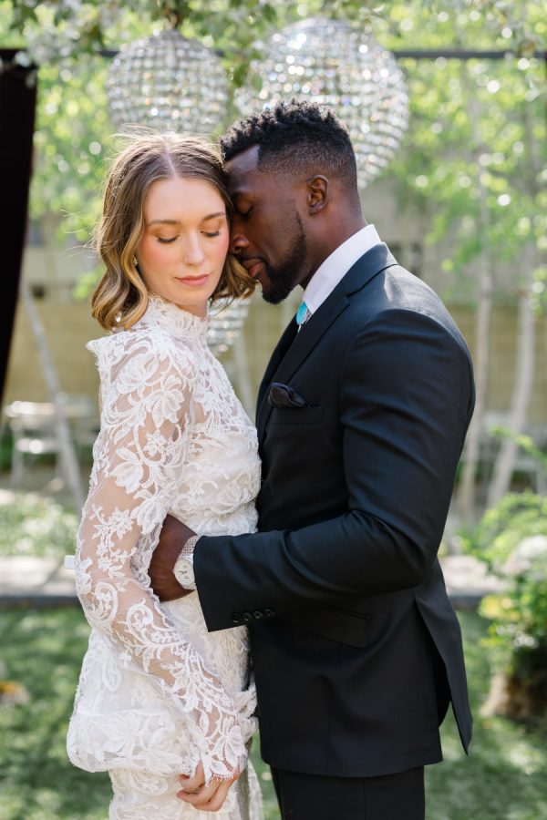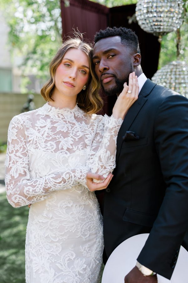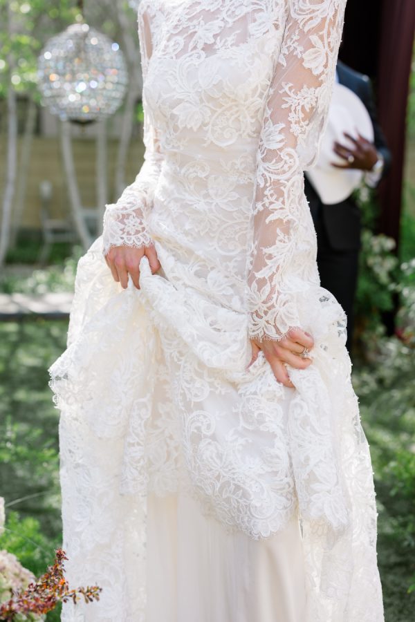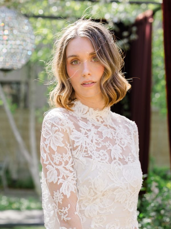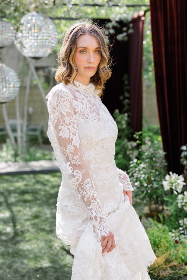 [field title=”Wedding Gown”]This editorial featured two distinct bridal gowns, each intentionally styled to evoke a different facet of modern romance. The first bride wore a high-neck, long-sleeve lace gown with delicate floral embroidery and a tailored silhouette. The gown’s vintage-inspired design and intricate detailing brought a sense of timeless elegance with a slightly ethereal edge—perfectly suited for the overgrown ceremony setting and crystal chandeliers above.