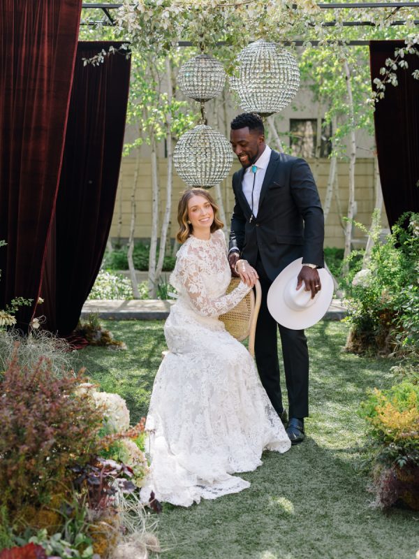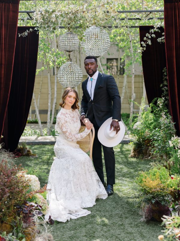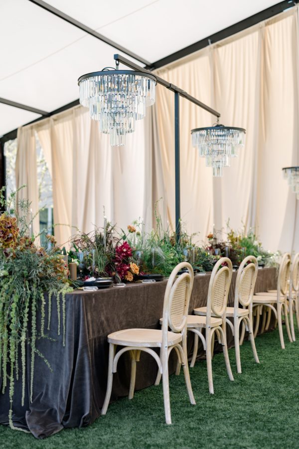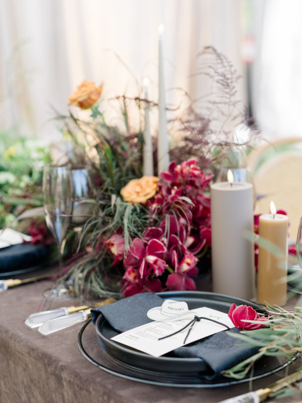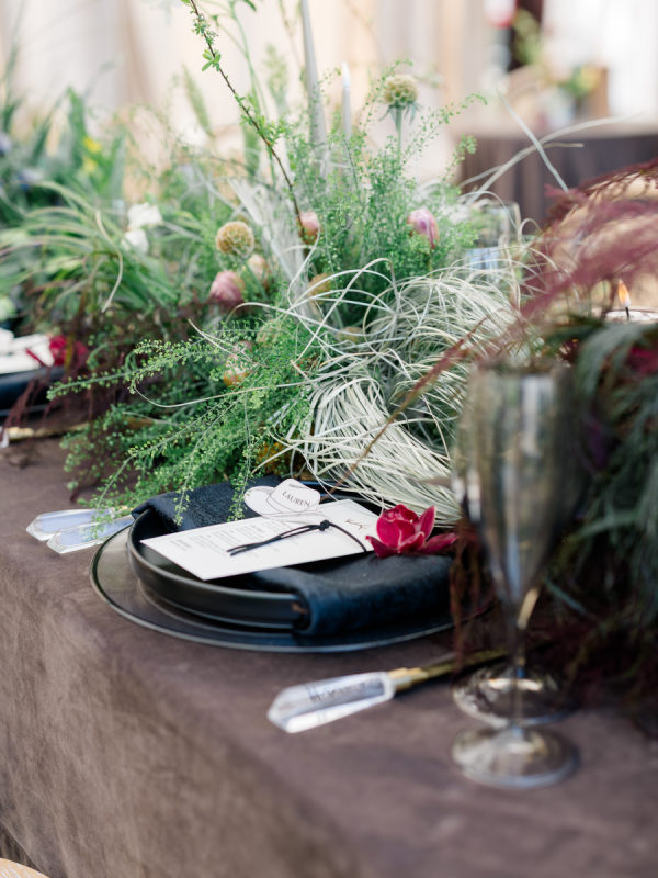 [field title=”Tips To Pull Off The Look”]Don’t be afraid to mix opposing textures—pair polished crystal with wild florals, or lace with leather accents. Keeping your color palette rooted in the earth will allow even the boldest elements to feel cohesive. And choose a venue that brings nature in; it makes all the difference in how the light plays off each detail.[/field]